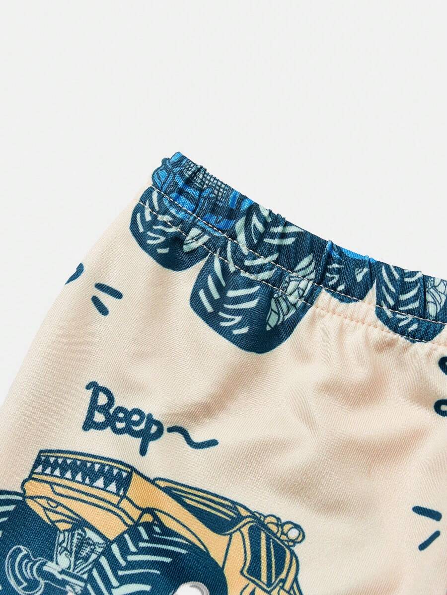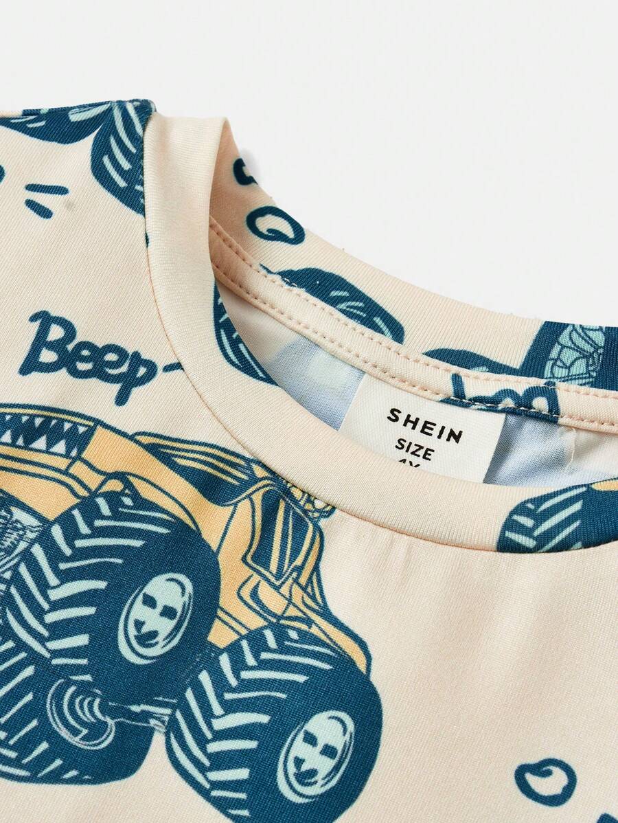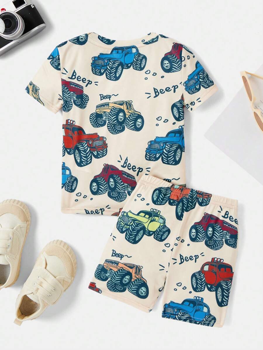 SHEIN 2pcs Young Boys’ Casual Cute Cartoon Car, & Off-Road Vehicle Printed Round Neck Short Sleeve T-Shirt And Shorts Comfortable Home Outfit Set