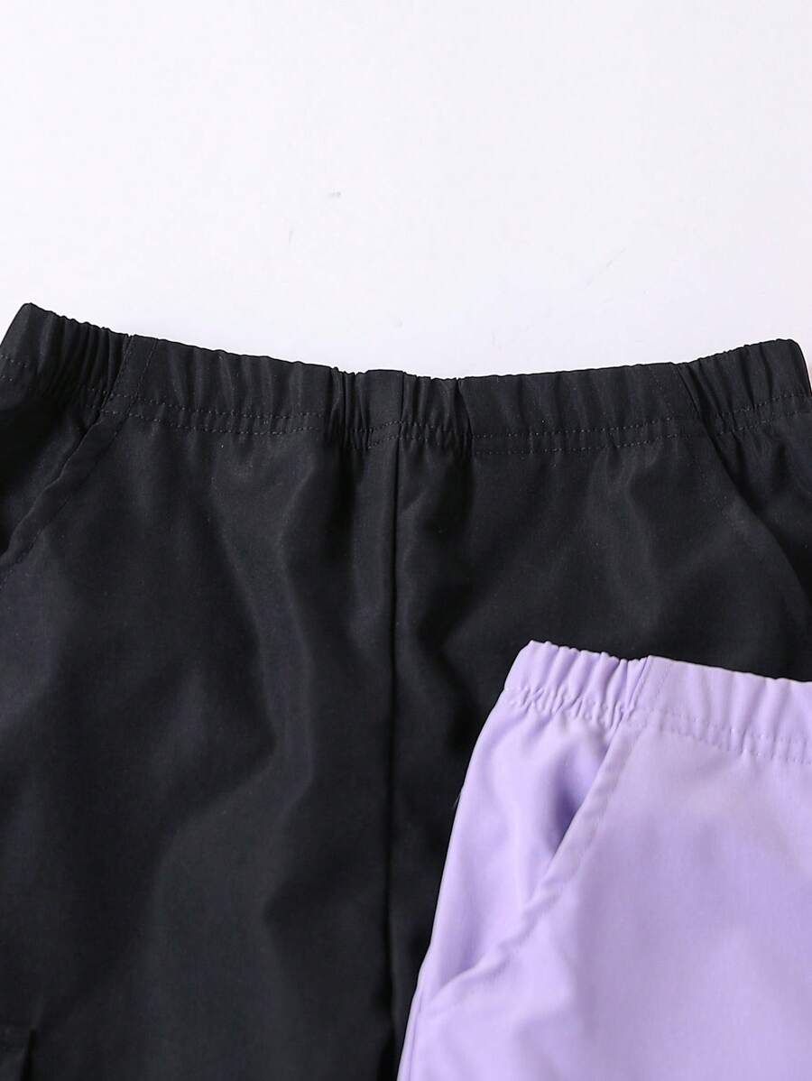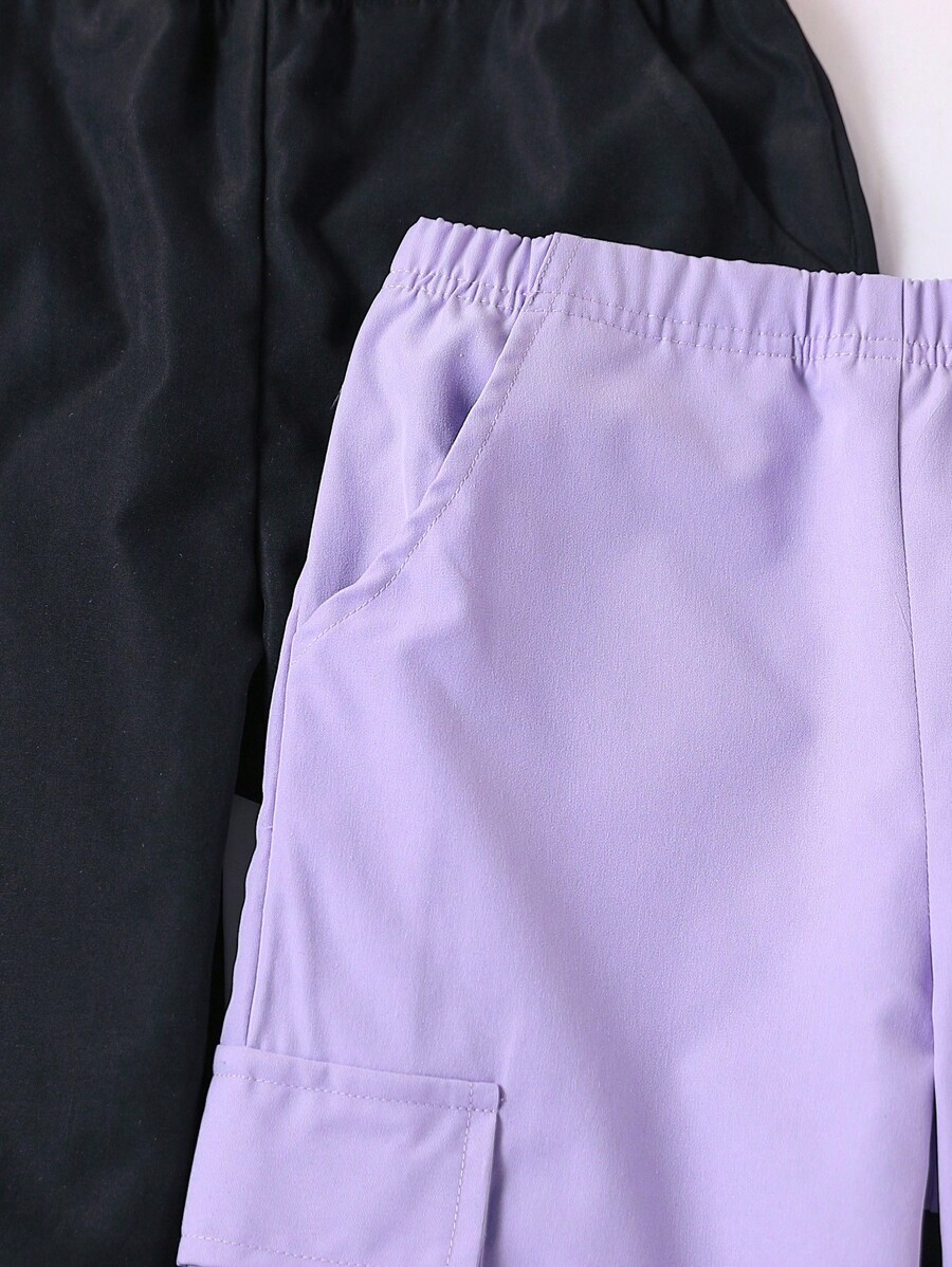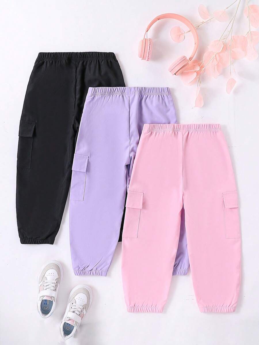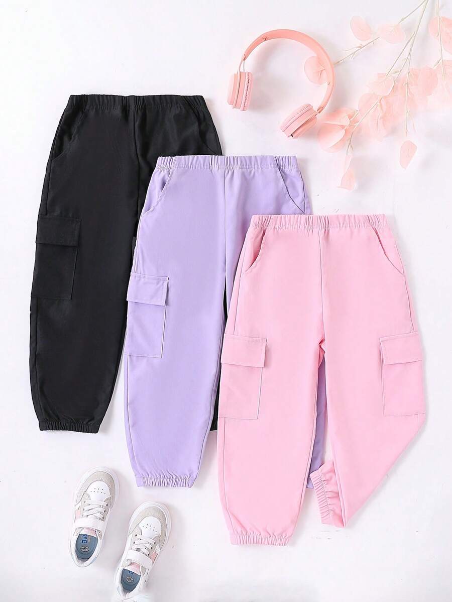 SHEIN 3pcs Young Girl Casual Trendy Sports Cargo Pants. With Elastic Waist, Easy To Wear And Take Off; Two Side Pockets With Decorative Flaps, Fashionable And Beautiful; Ankle-Tied Design, Suitable And Stretchy, Fashionable, Multiple Color Options To Match, Simple And Versatile Street Sports Style, Accommodating Various Body Types. Suitable For Various Occasions, Whether Playing, Going To School, Exercising, Walking On The Street Or Outdoor Dining. Appropriate For Spring And Autumn Seasons.