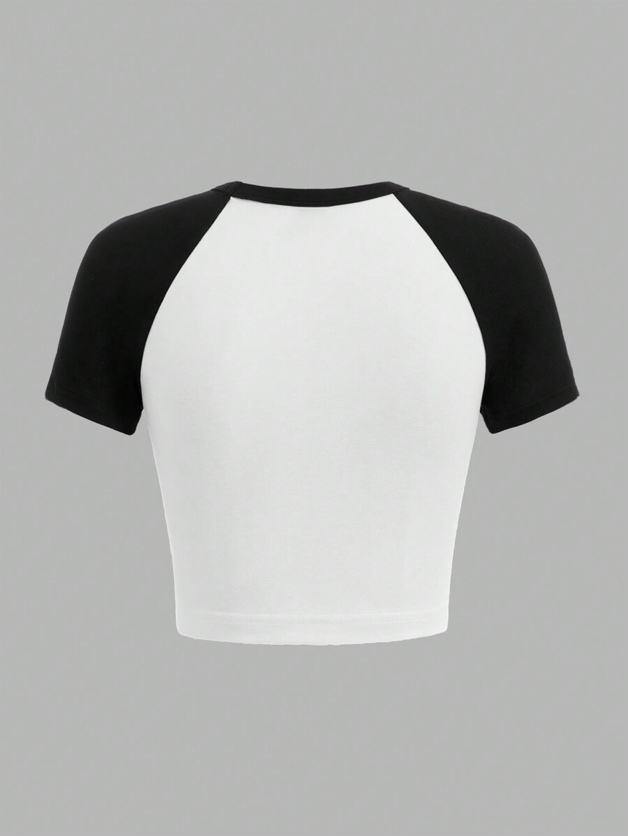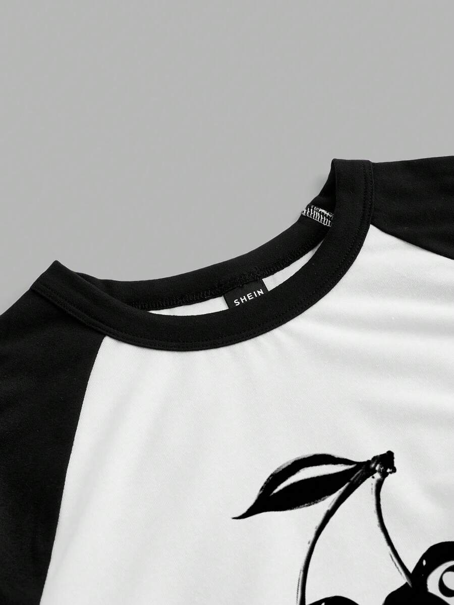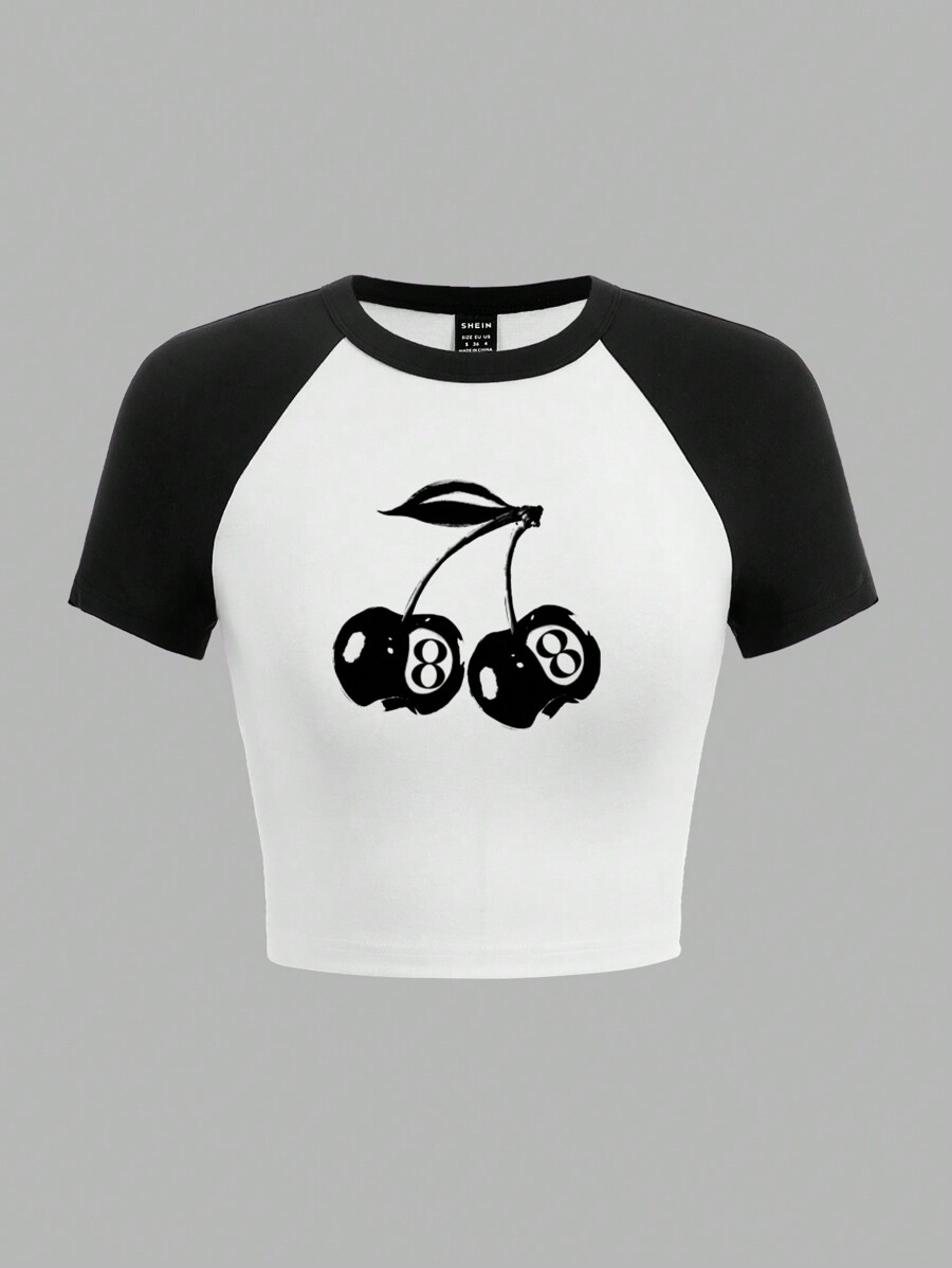 / SHEIN Attitoon Cherry Patterned Casual Fitted Short T-Shirt With Patched Sleeves, Contrast Colored Round Neckline, Suitable For Summer