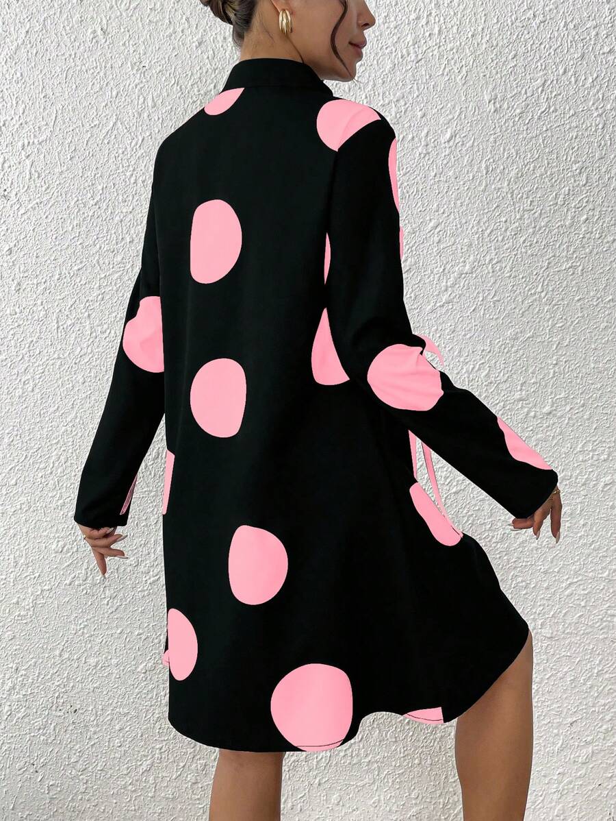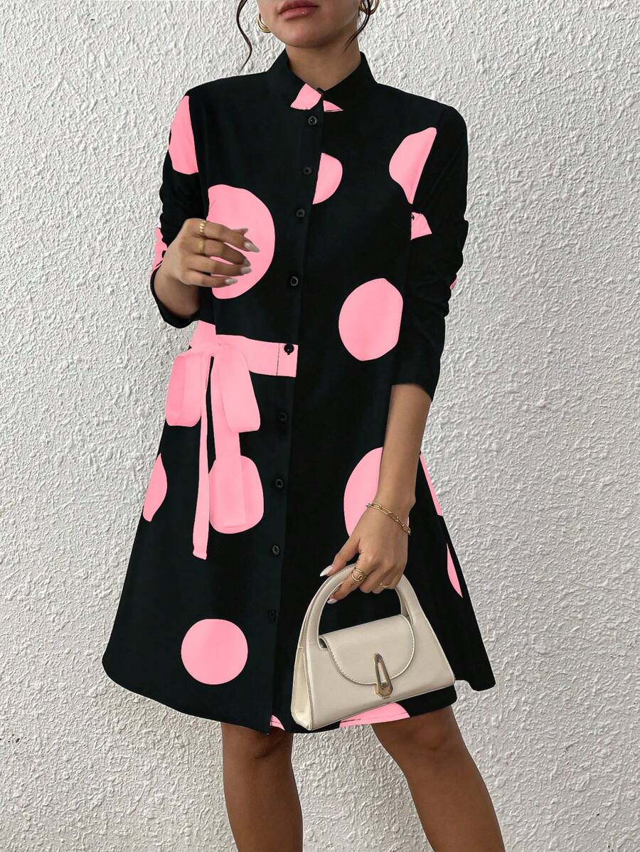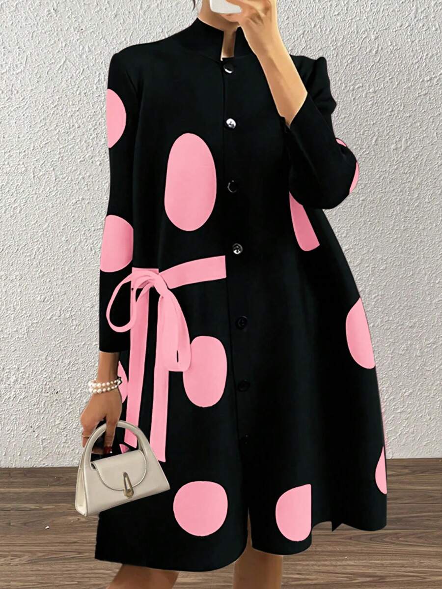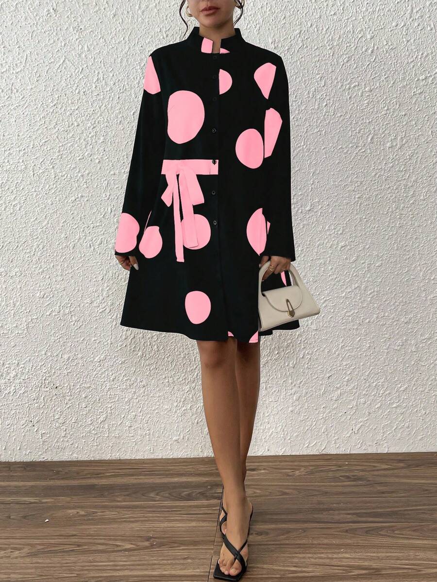 SHEIN Clasi Stand Collar Polka Dot Decor Tie Closure Design Women’s Dress