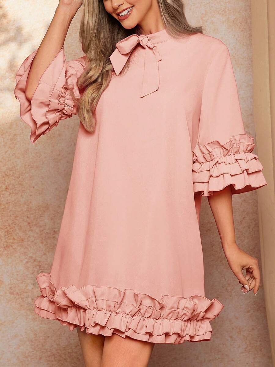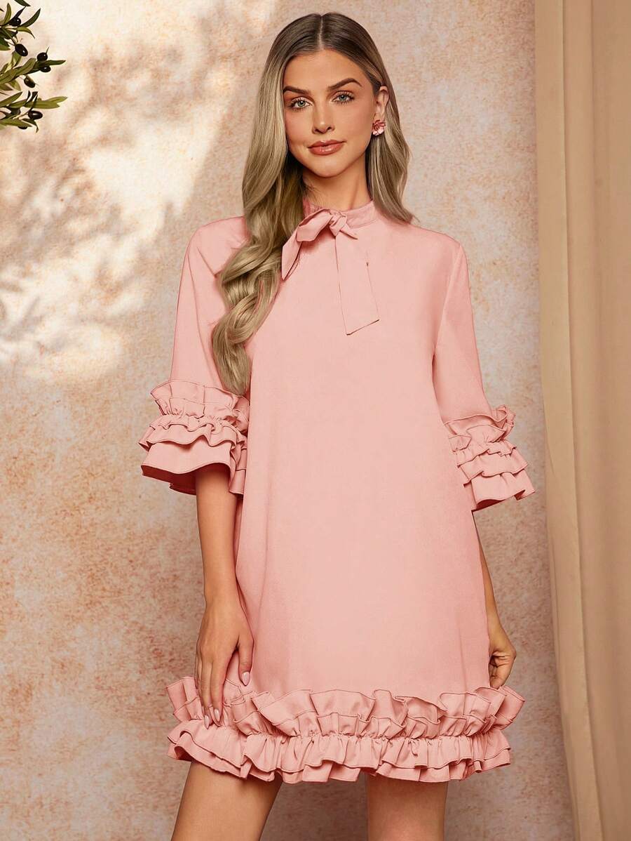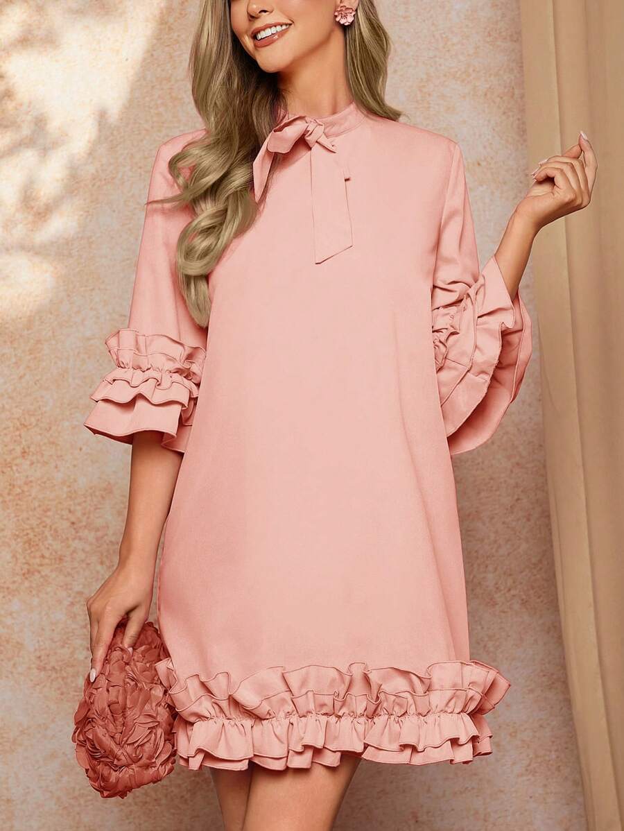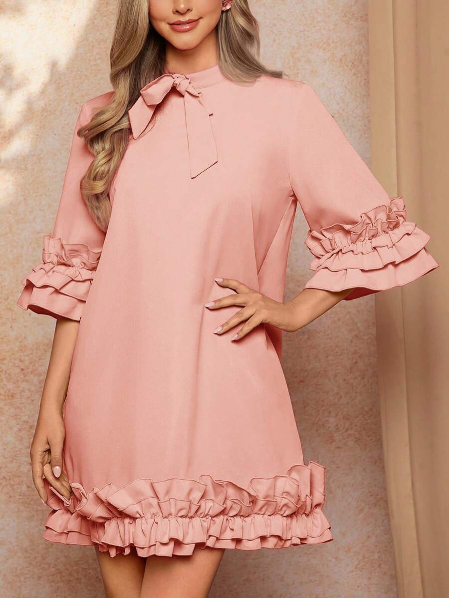 / SHEIN Clasi Women’s Tie Collar 3/4 Sleeve Ruffled Hem Layered Elegant Dress