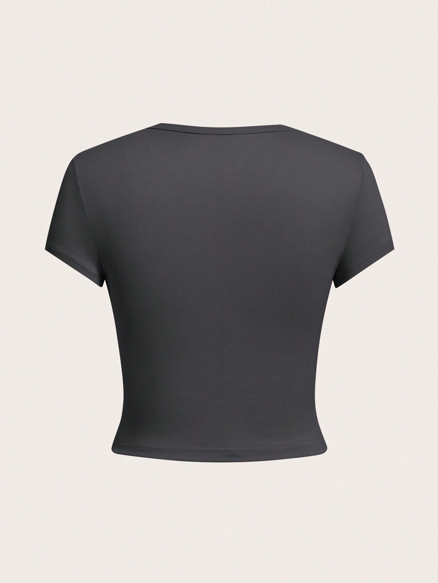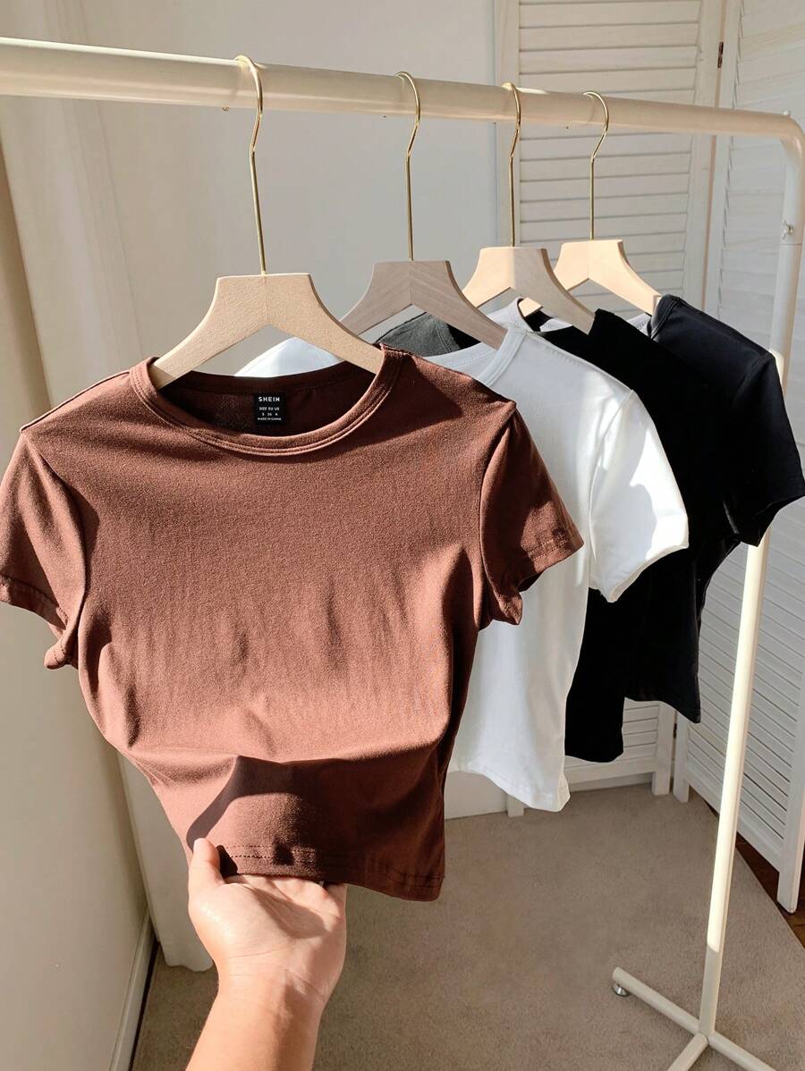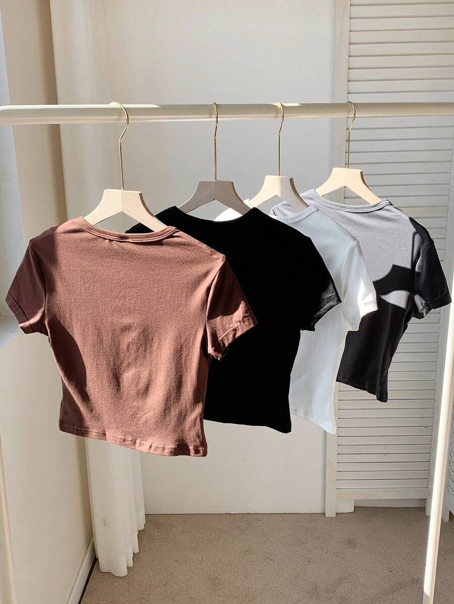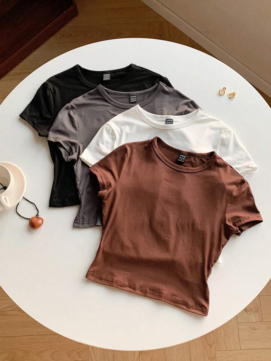 / SHEIN Comfortcana 4pcs/Set Women’s Casual Plain Fitted Cropped Round Neck Short Sleeve T-Shirt, Summer