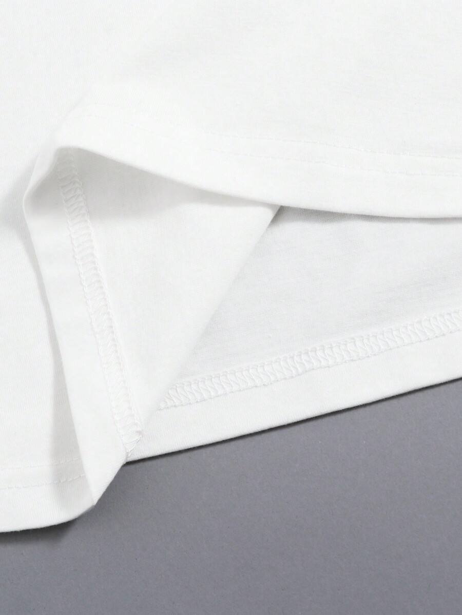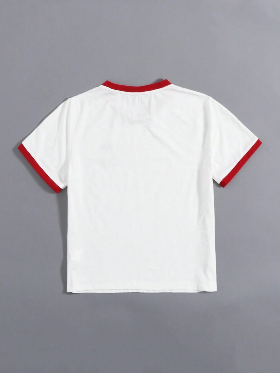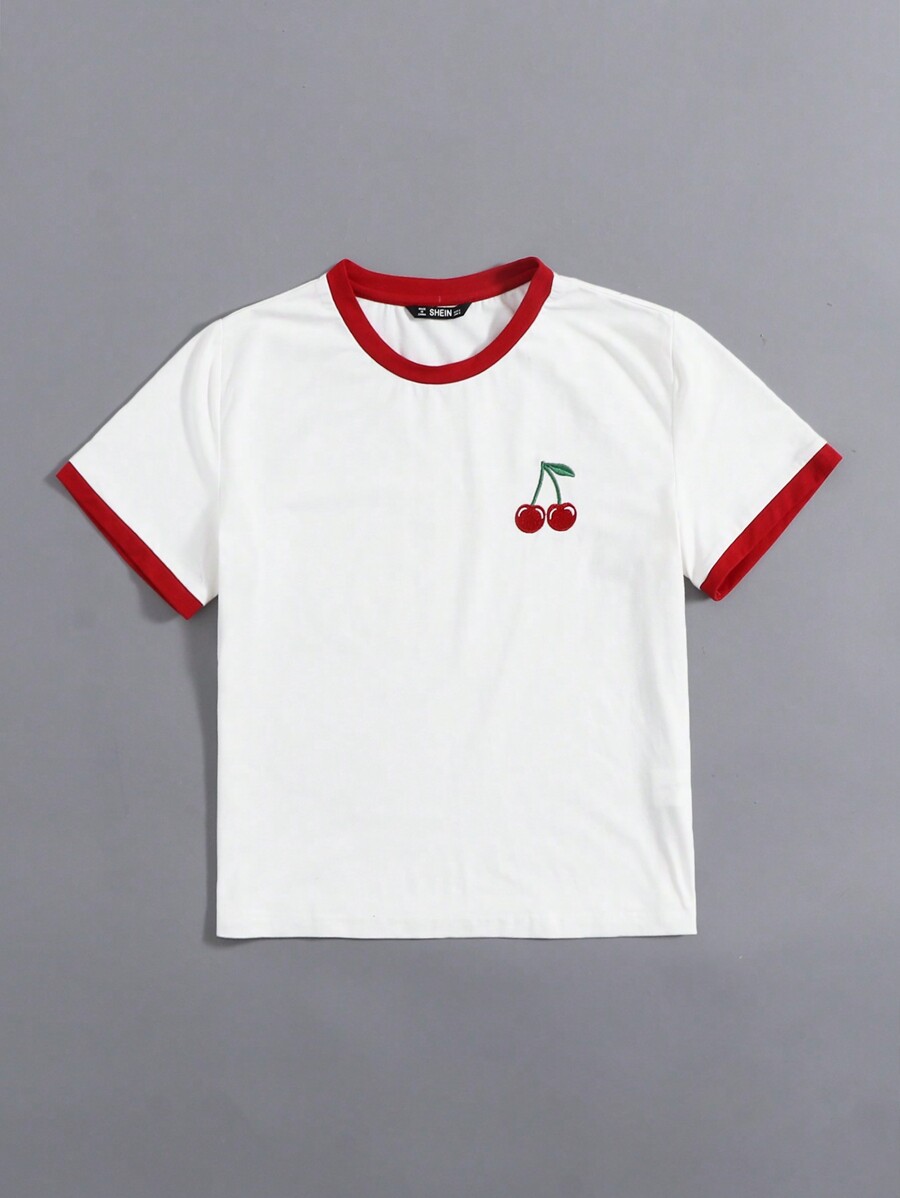 SHEIN EZwear Summer Contrast Color Crew Neck Embroidery Cherry Ringer Loose Tee