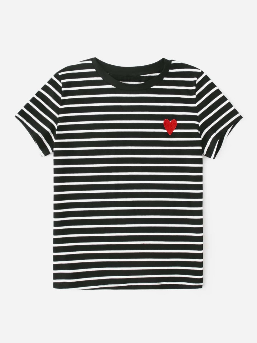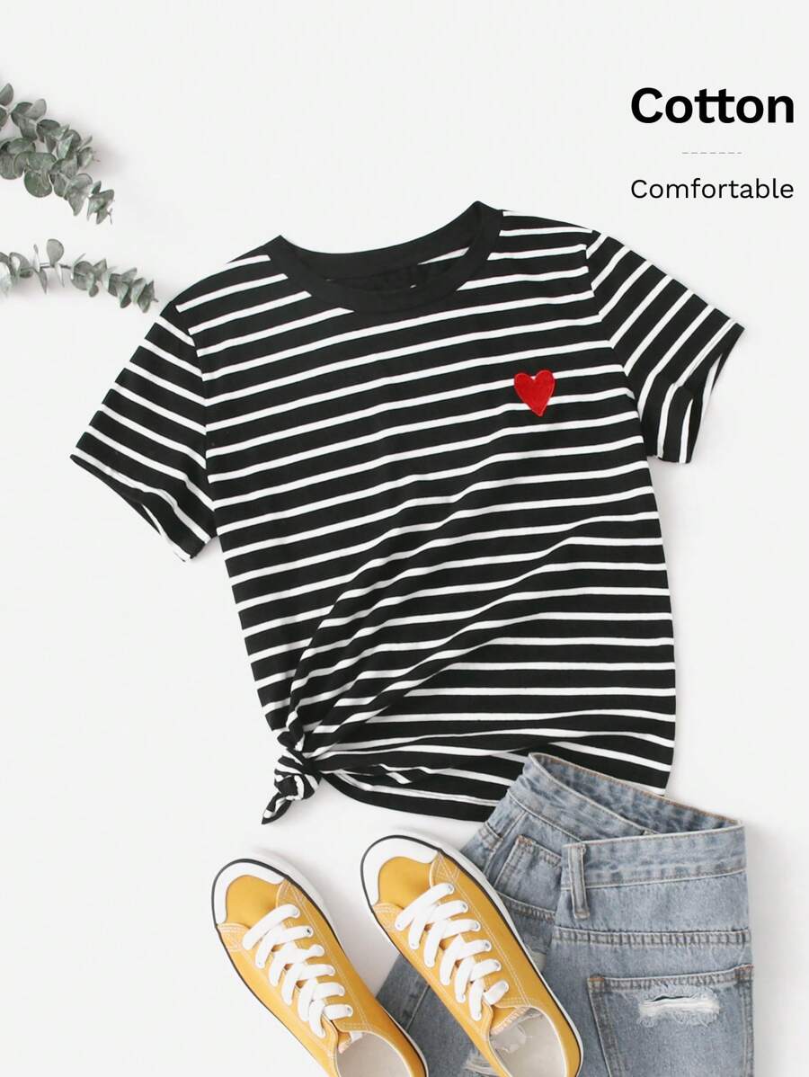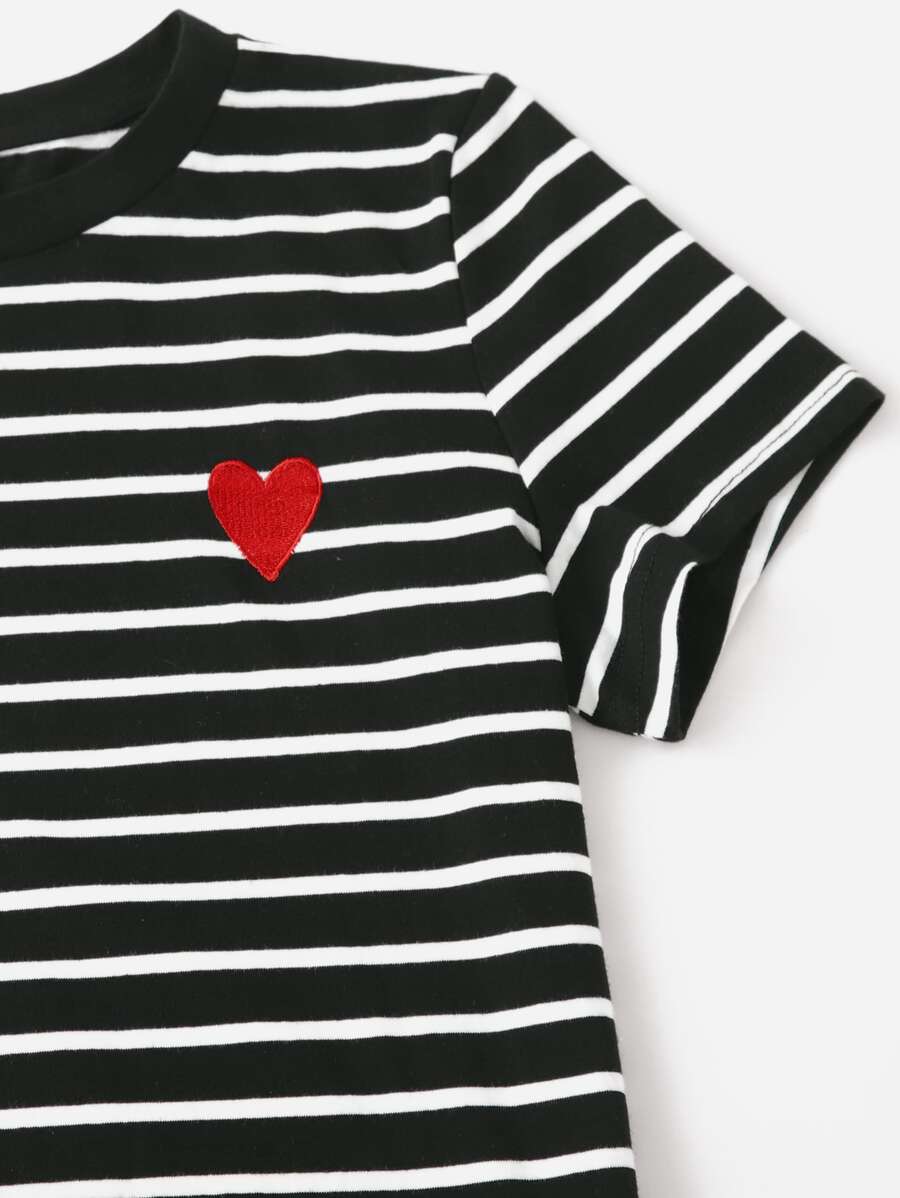SHEIN EZwear Summer Heart Embroidery Striped Tee Tshirts For Women Casualtoddler Girl Clothes