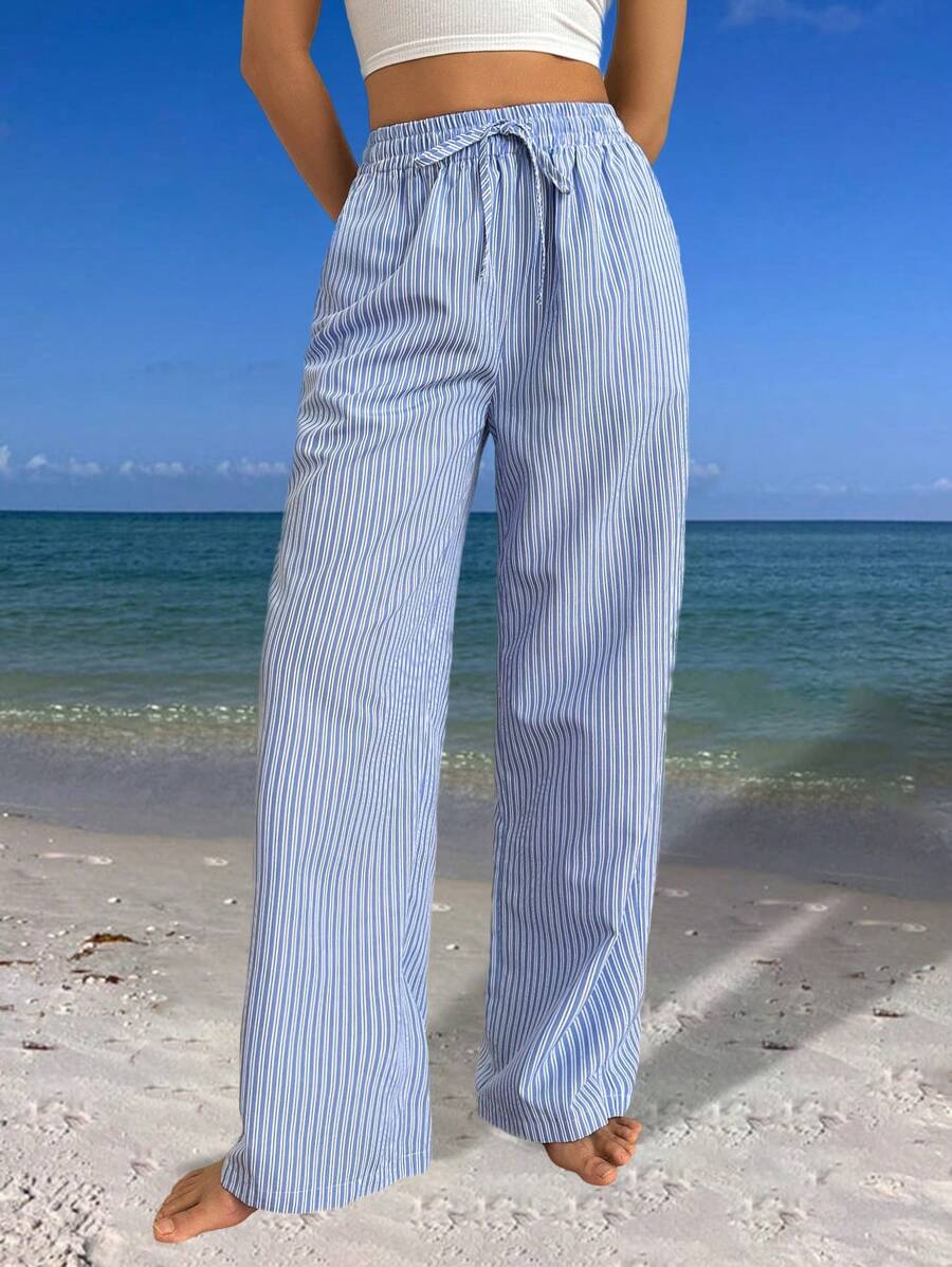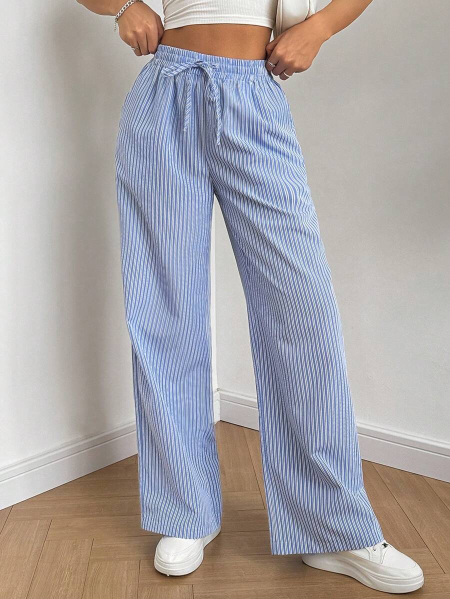 SHEIN EZwear Women’s Belted Striped Casual Loose Pants For Spring/Summer At Home