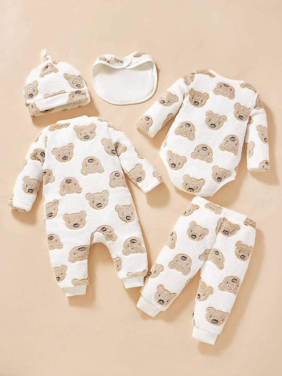 SHEIN Flannel Baby Boys Outfit Gift Set, With Cute Bear Design And Fine Craftsmanship, Makes An Ideal Choice For Everyday Wear And Winter Warmth. The Gift Box Set Includes A Romper, Pants, Hat, And Bib, Perfect As A Newborn, 1-Month, Or Holiday Gift. With Elegant Packaging, This Flannel Outfit Set Is A Thoughtful And Practical Choice That Is Beloved By Parents.