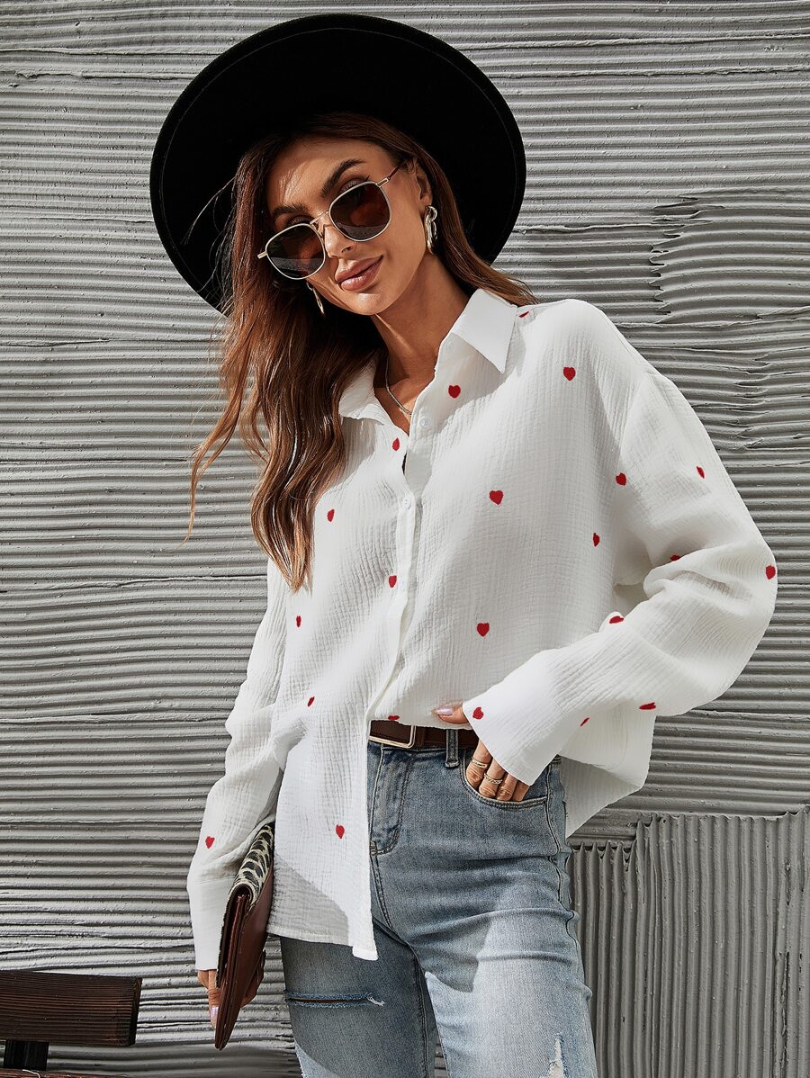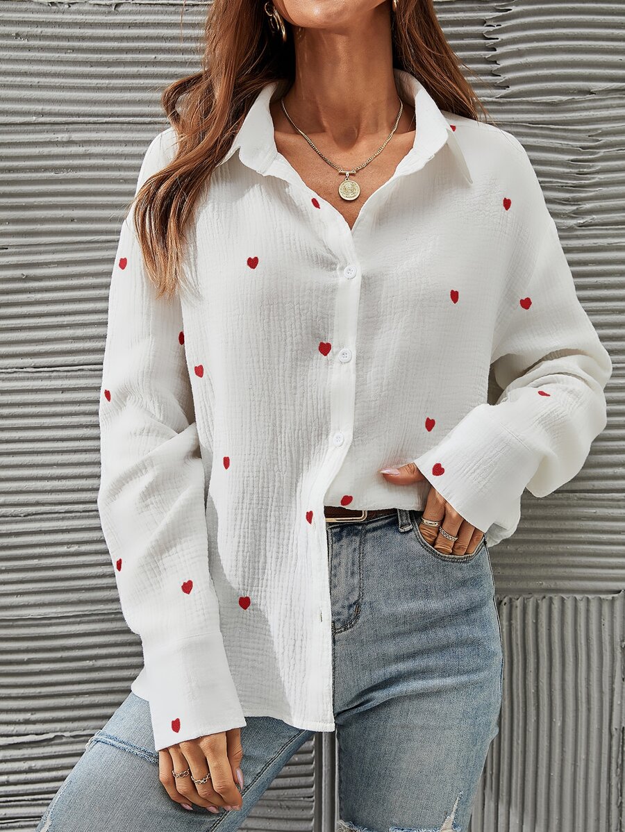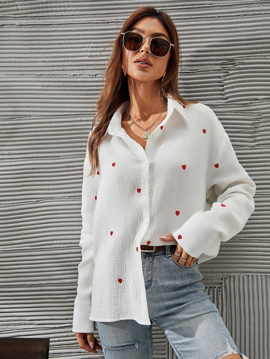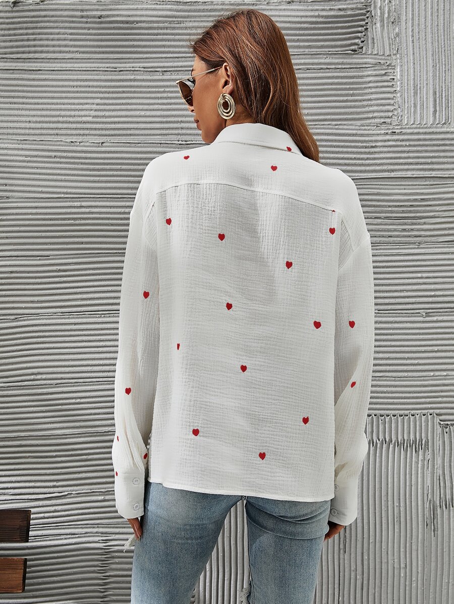 SHEIN Franclia Heart Embroidery Drop Shoulder Shirt,Long Sleeve Tops
