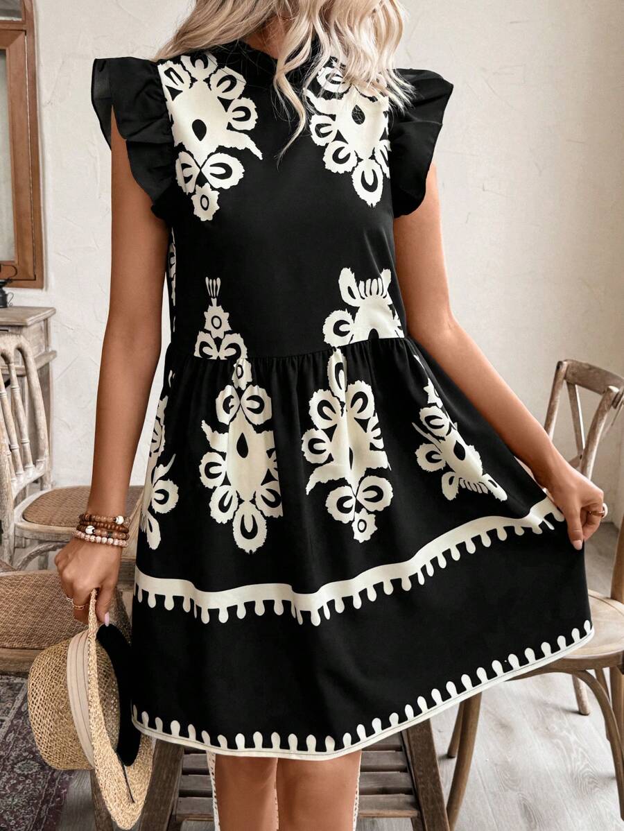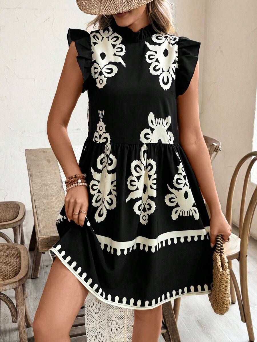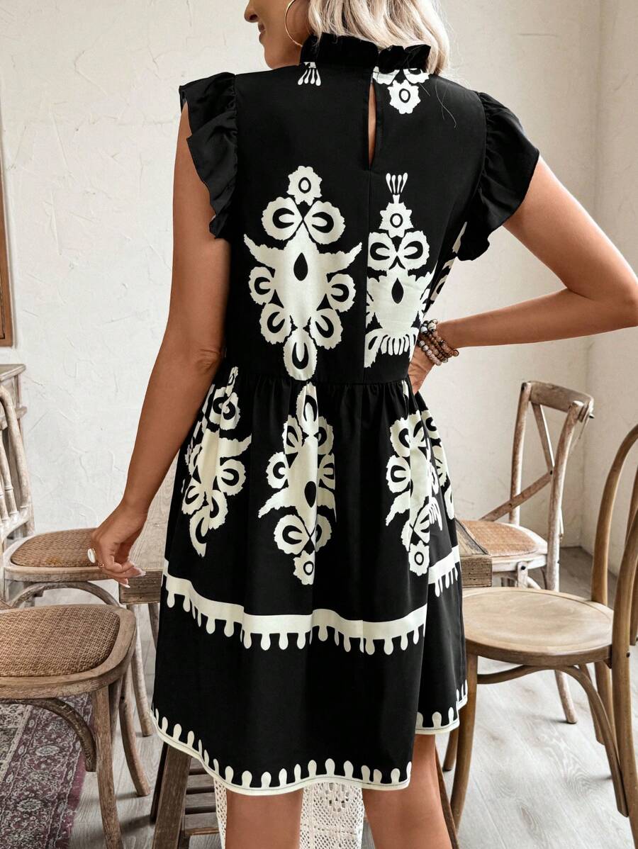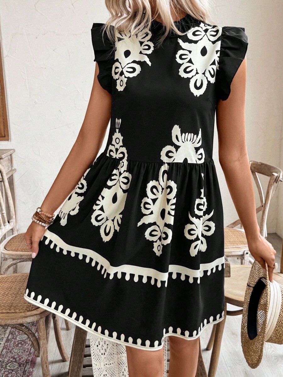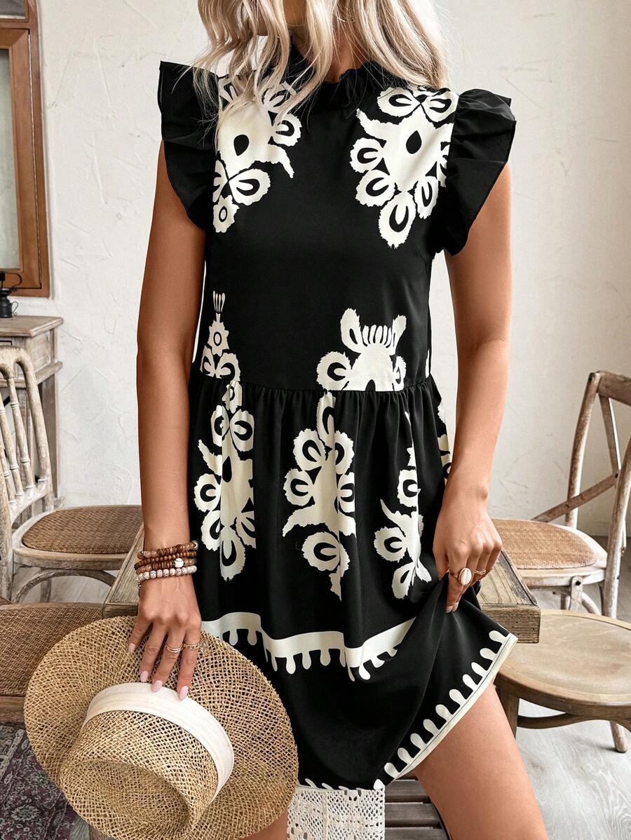 / SHEIN Holidaya Printed Ruffle Collar Flare Sleeve Loose Cake Dress Vacation Beach Outfits Women