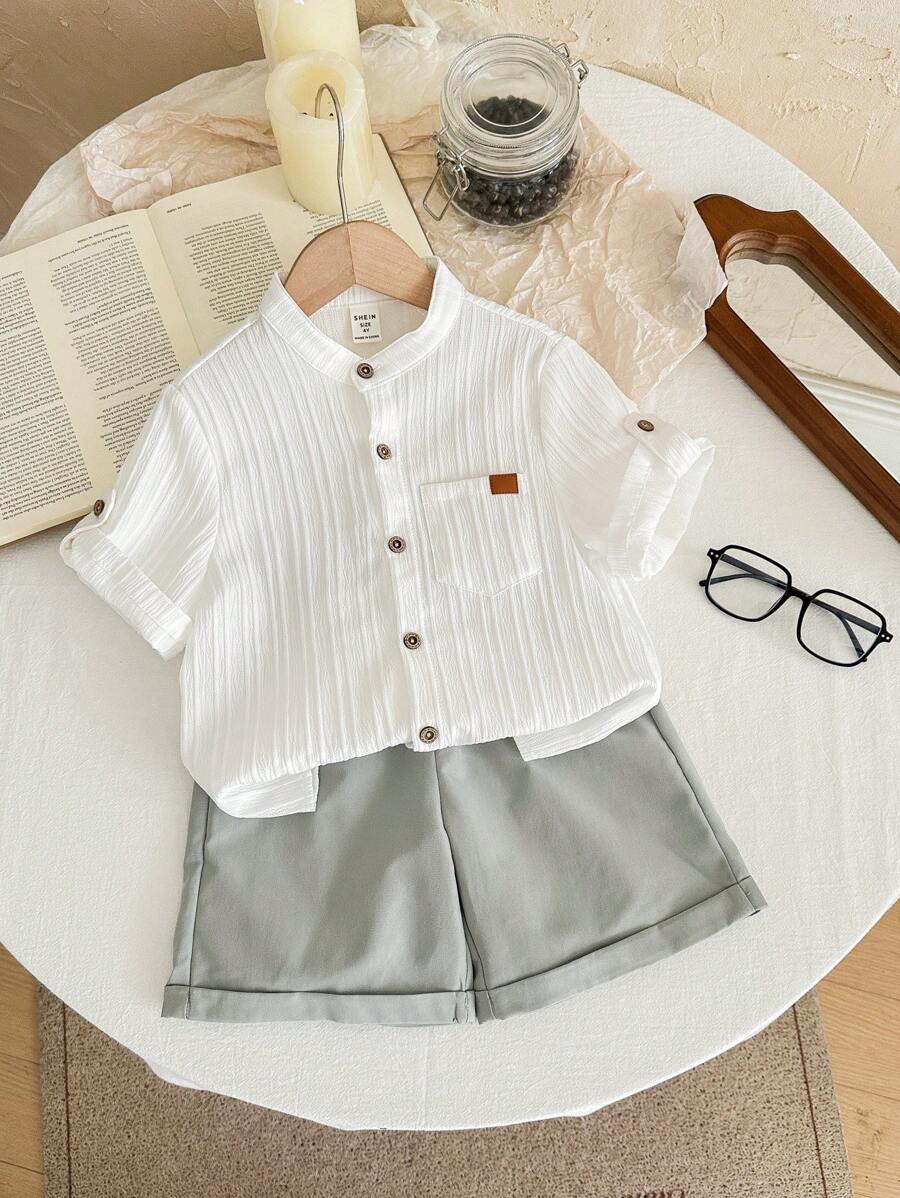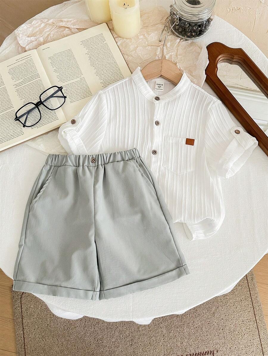 SHEIN LMoss Kids Young Boy Casual Academy Style Comfortable Breathable Shirt And Shorts Set quantity