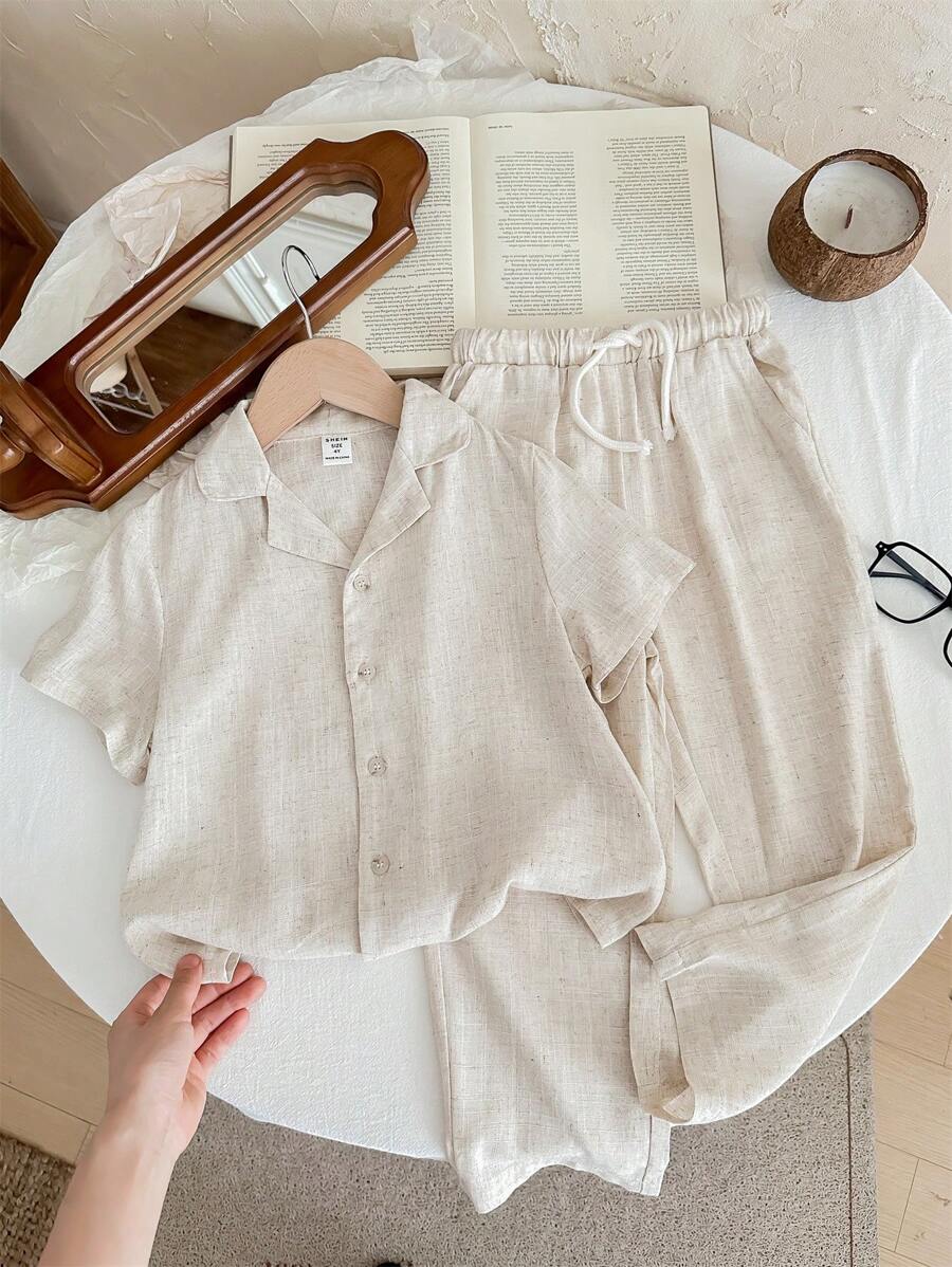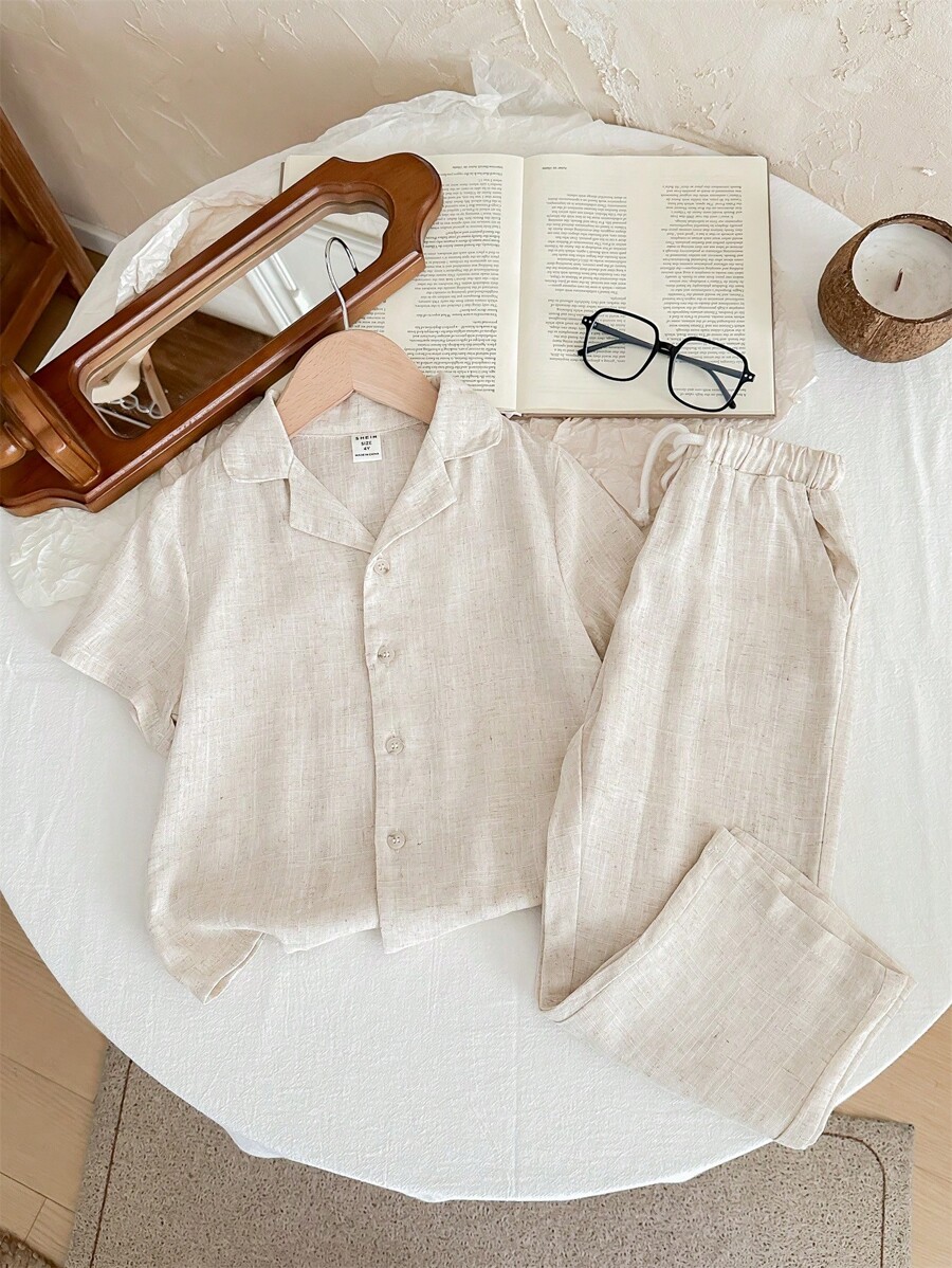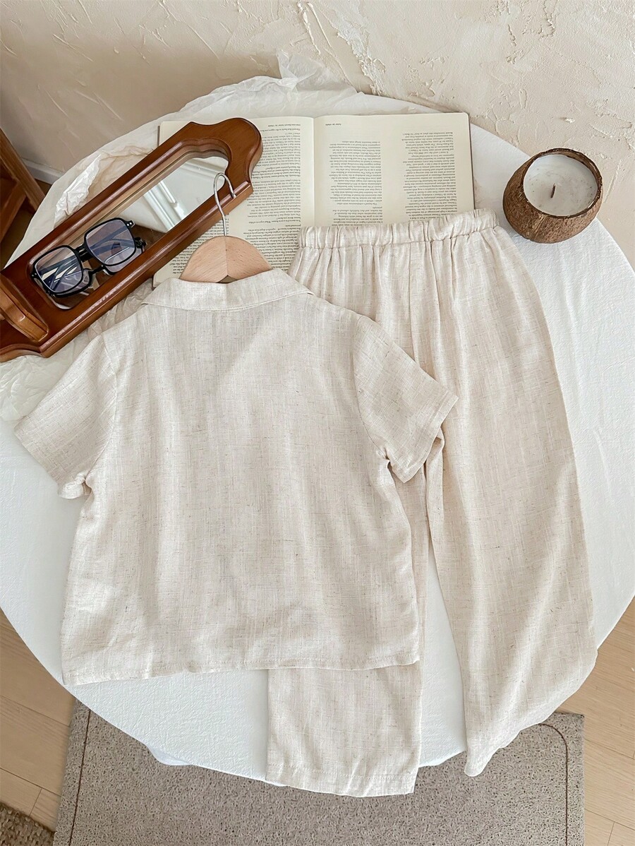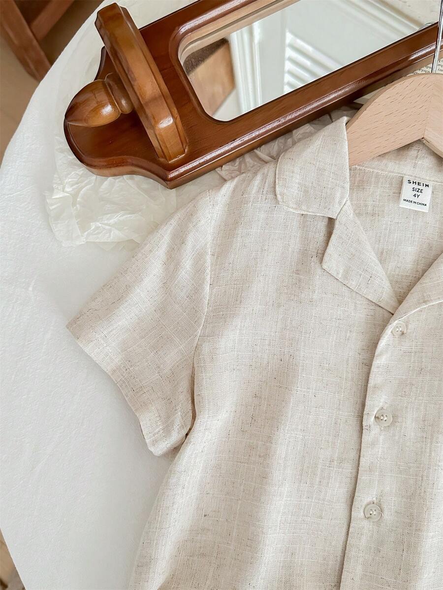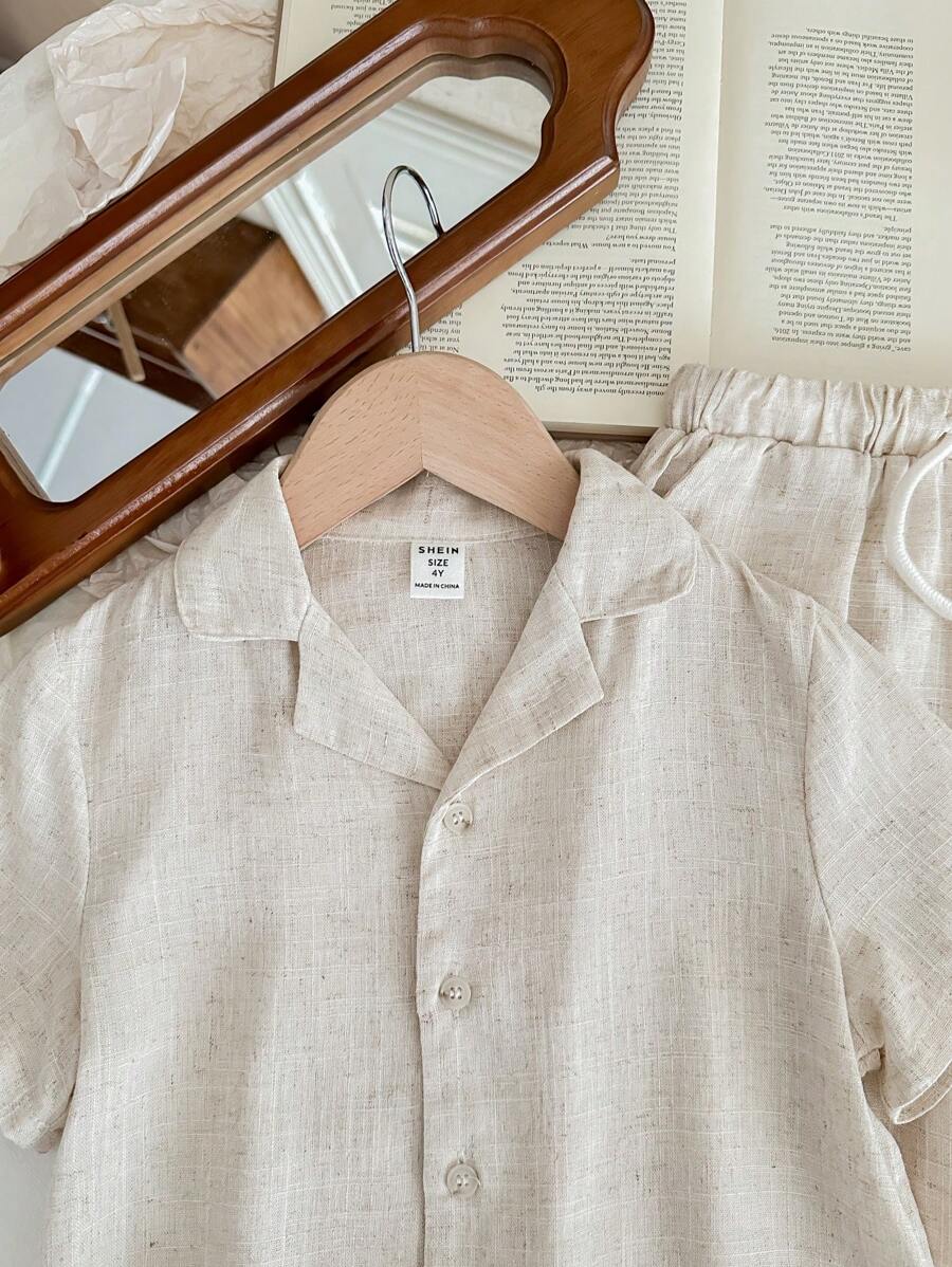 SHEIN LMoss Kids Young Boy Casual Solid Color Short Sleeve Shirt And Pants Breathable Comfortable Outfits Without T-Shirt