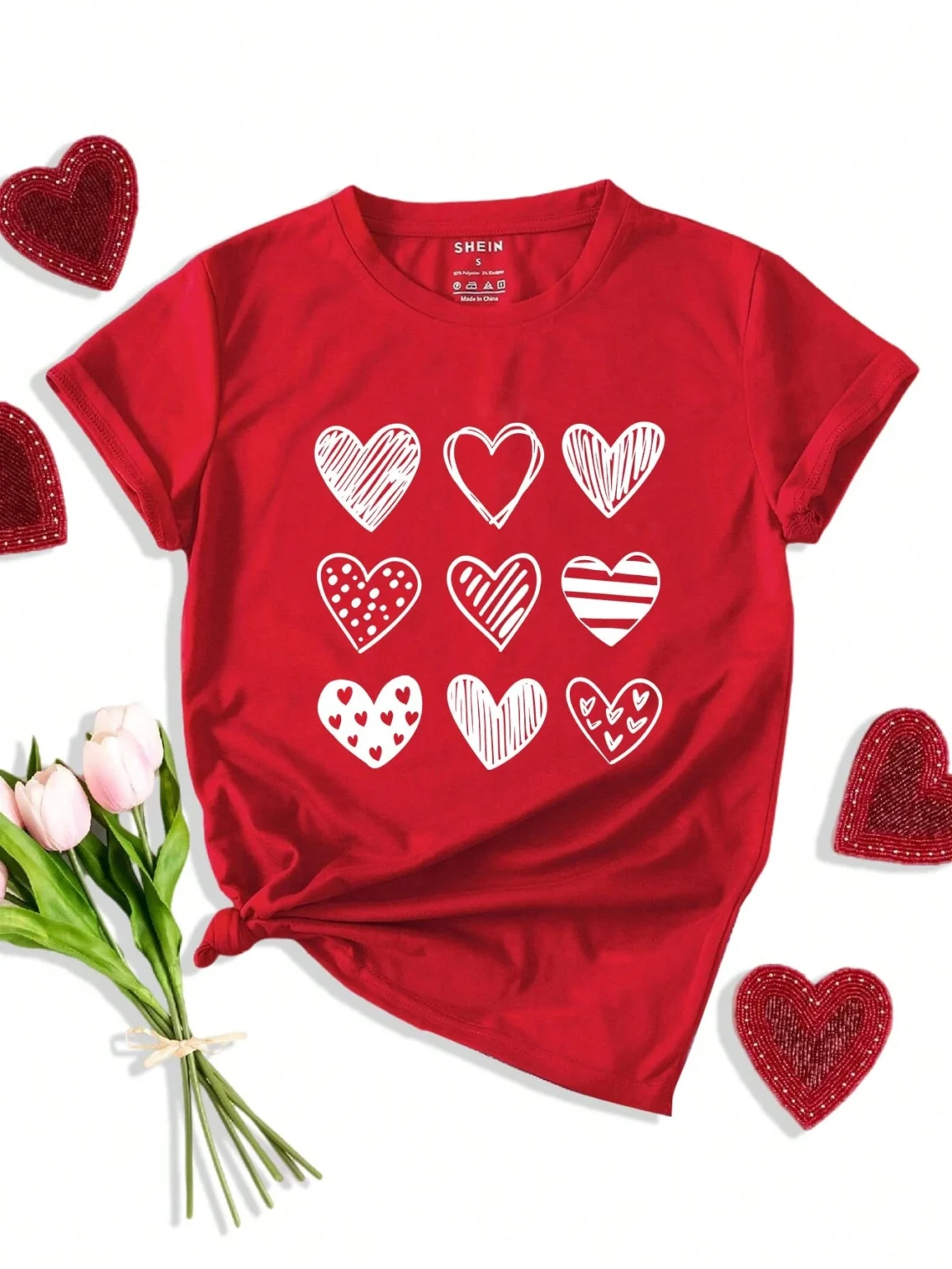SHEIN LUNE Casual Loose Heart Graphic Crew Neck Short Sleeve T-Shirt For Women, Suitable For Summer For Valentine’s Day Gifts