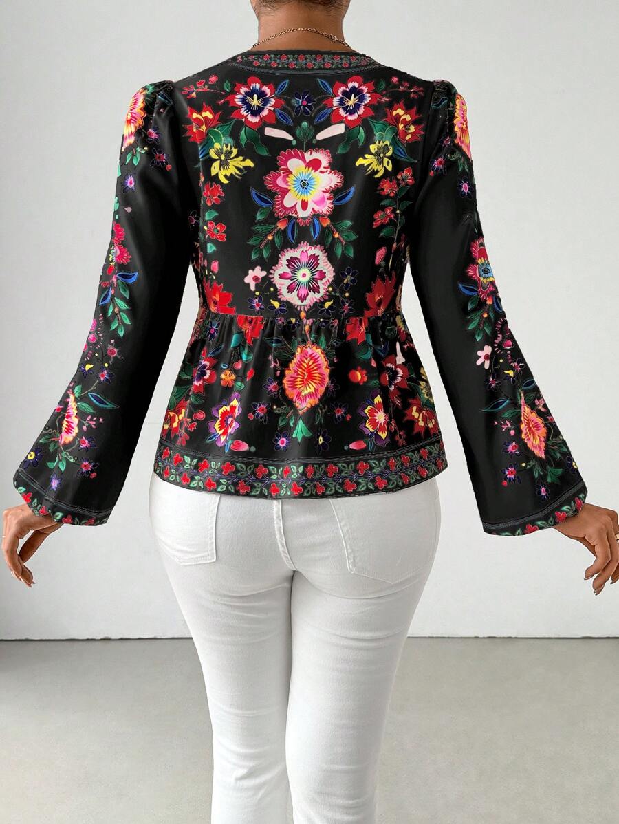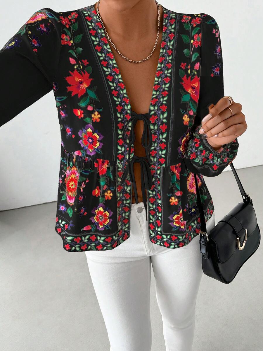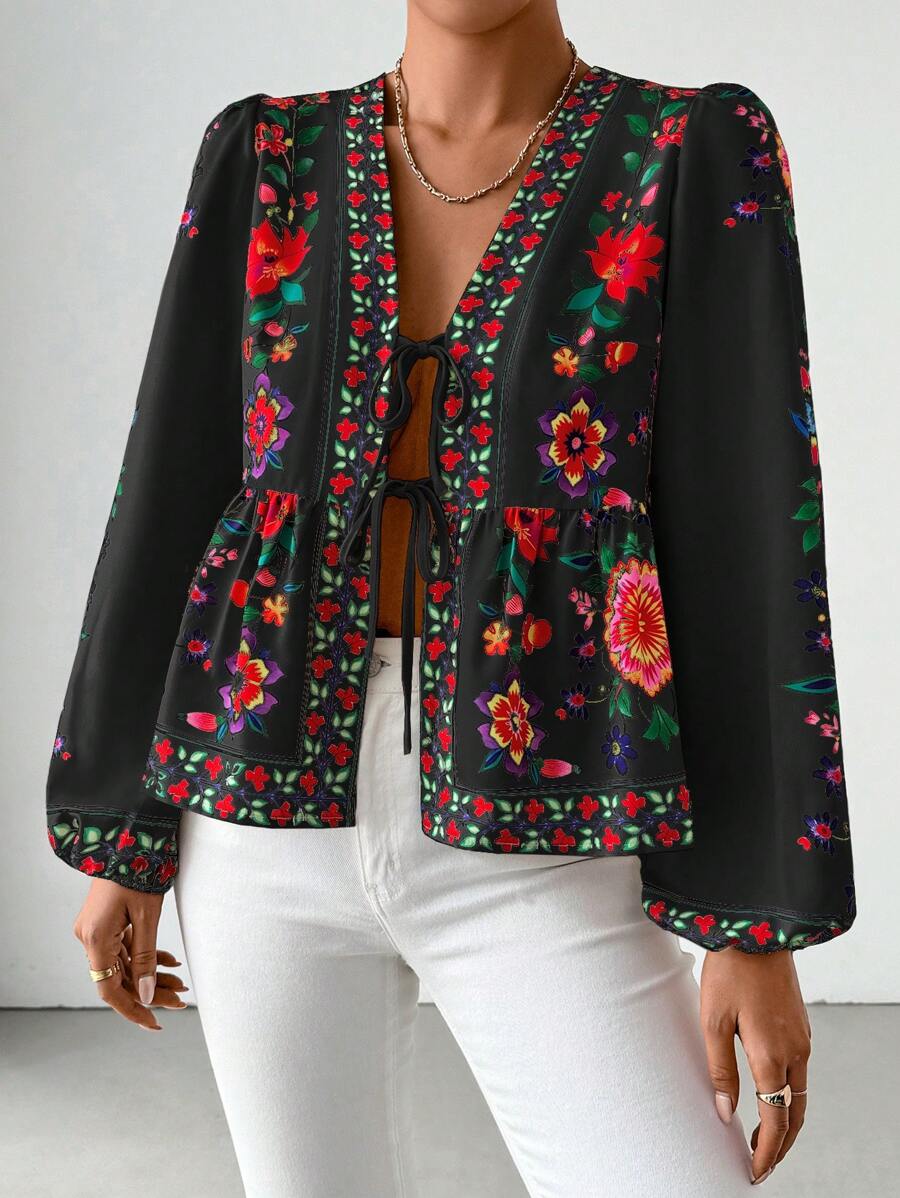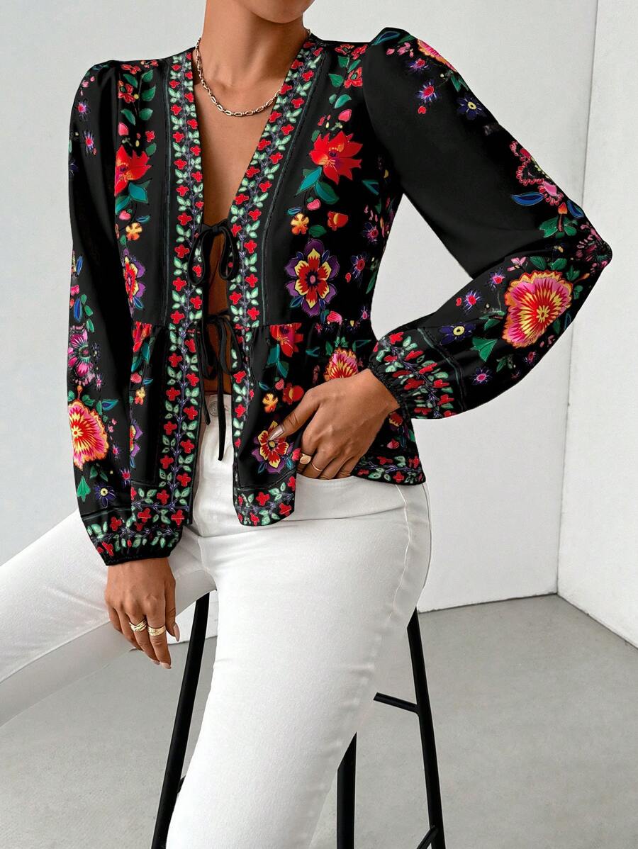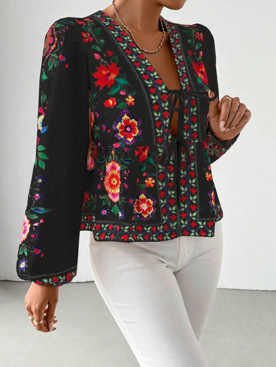 SHEIN LUNE Long Sleeve Allover Print Tie-Bow Puff Sleeve Women Shirt