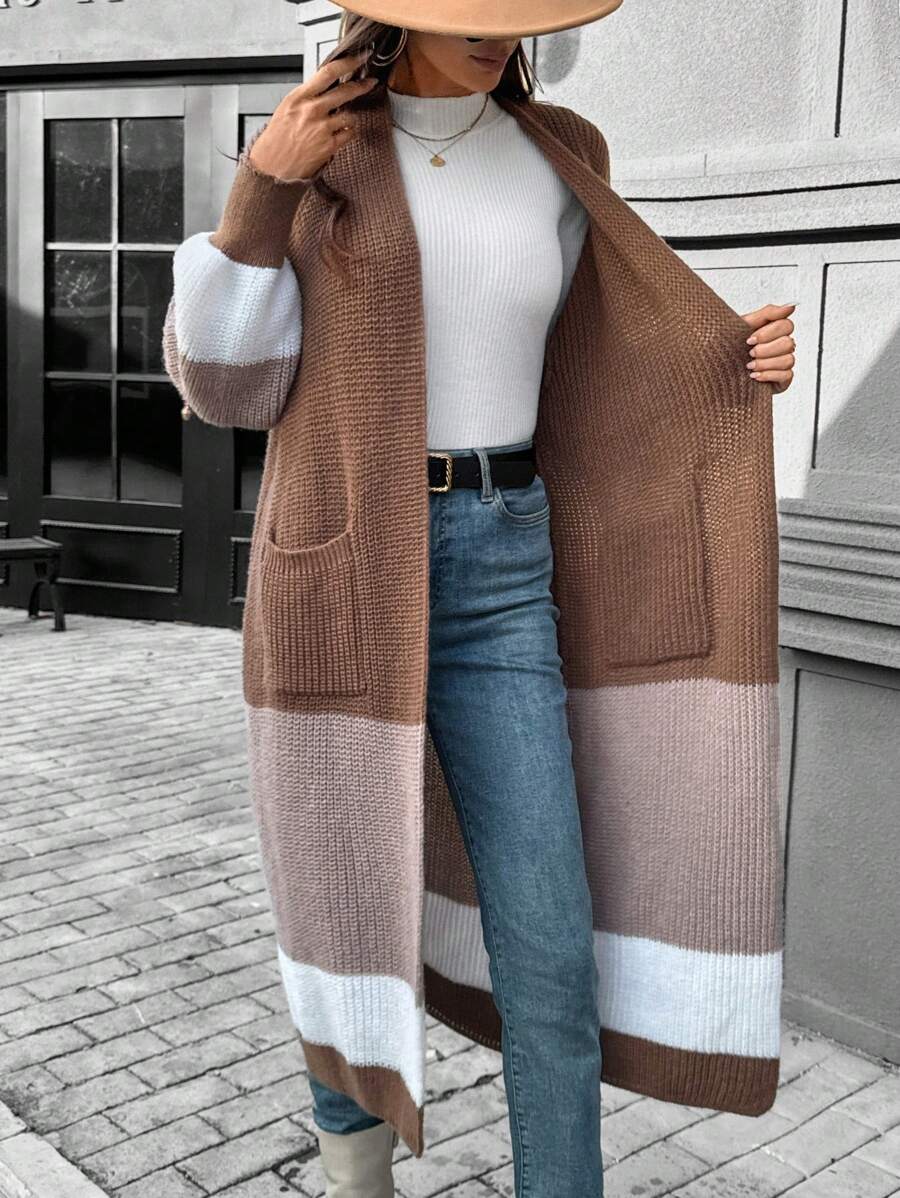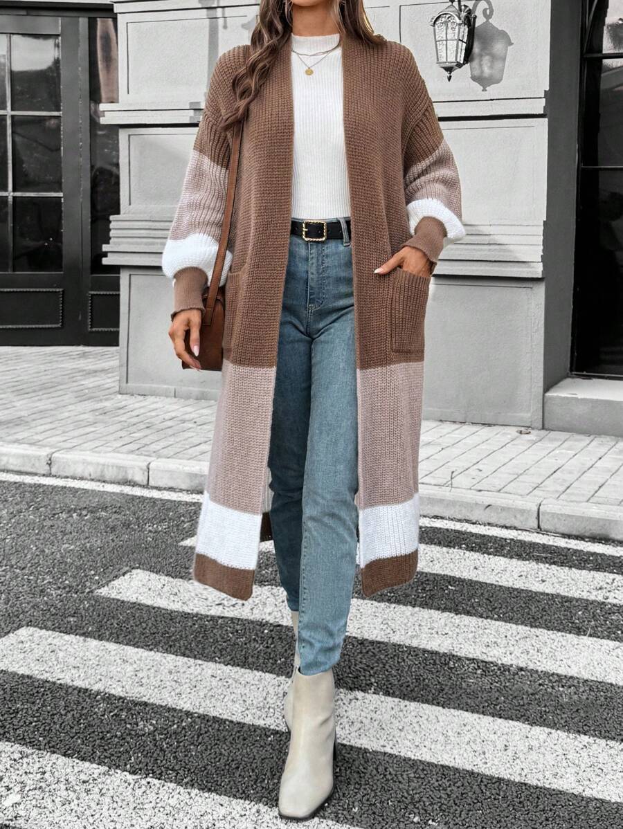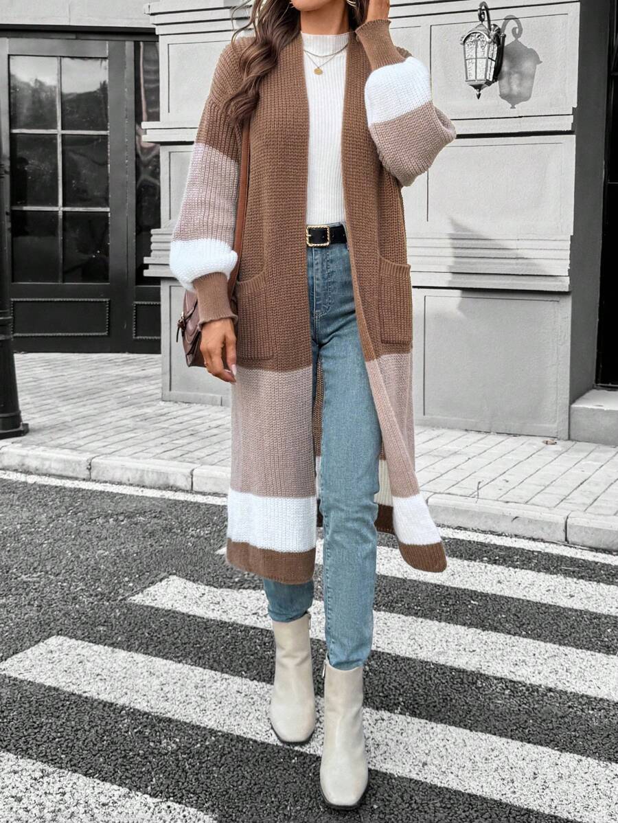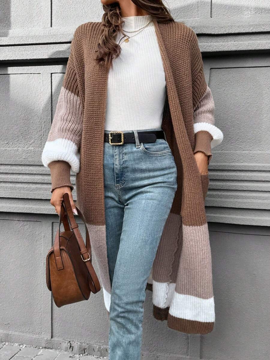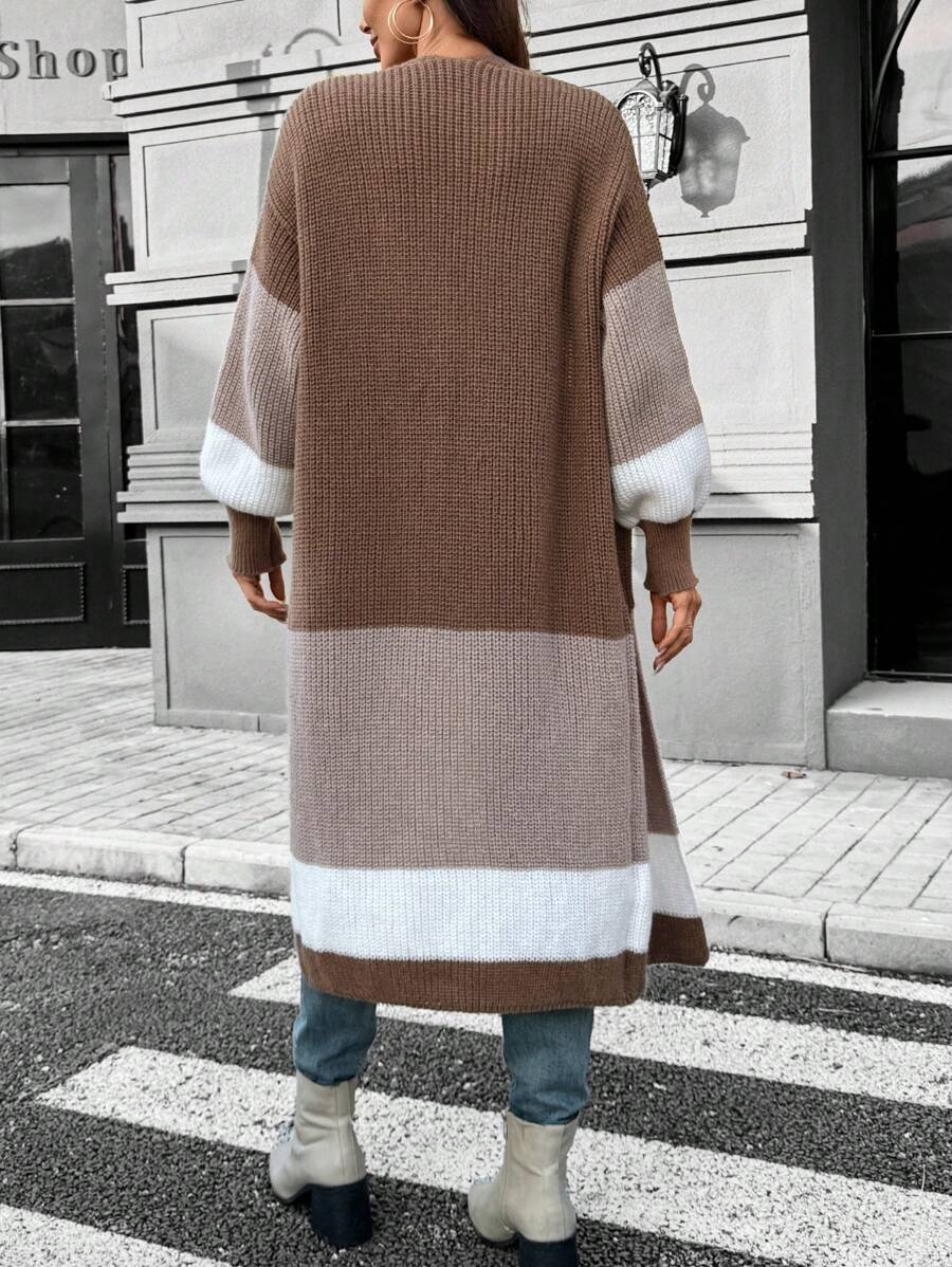 SHEIN LUNE Women Casual Contrast Color Lantern Sleeve Cardigan