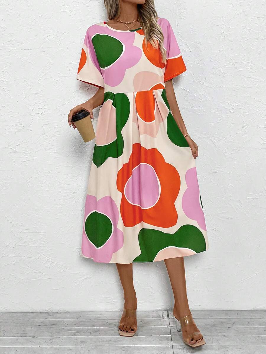SHEIN LUNE Woven Printed Midi Flowy Loose Dress + Printed Asymmetric Hem For Women