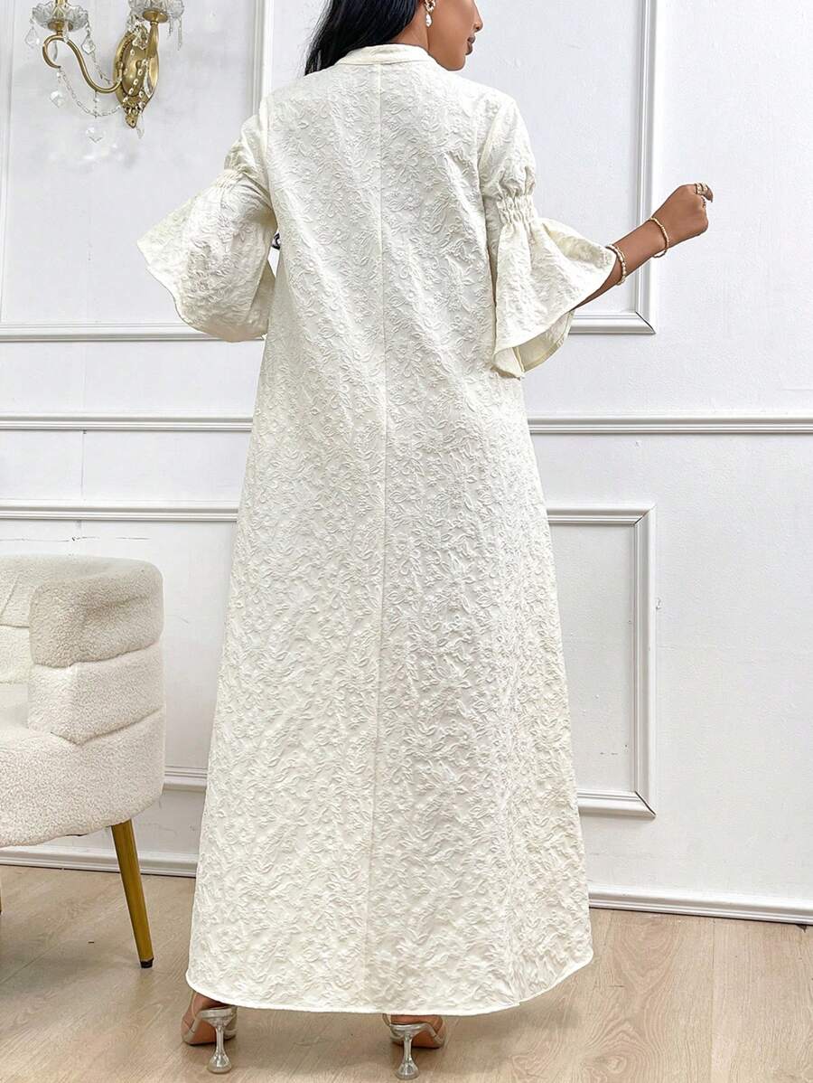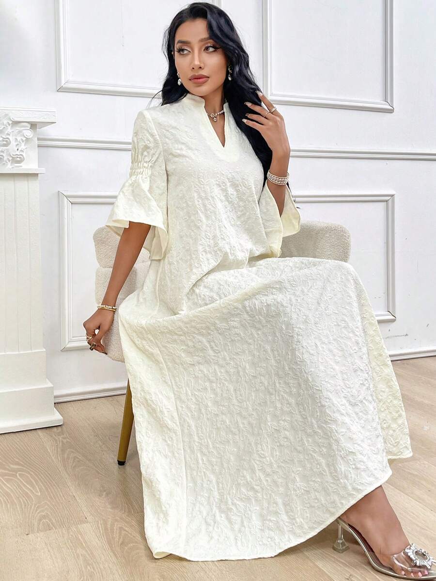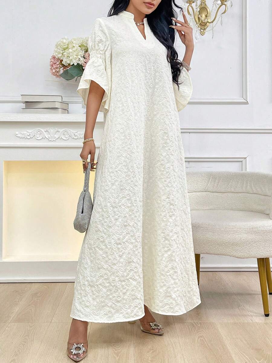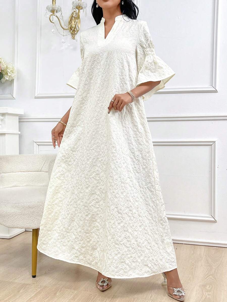SHEIN Najma Elegant Ladies’ Summer Solid Color Jacquard Notched Neck Flared Sleeve Long Dress