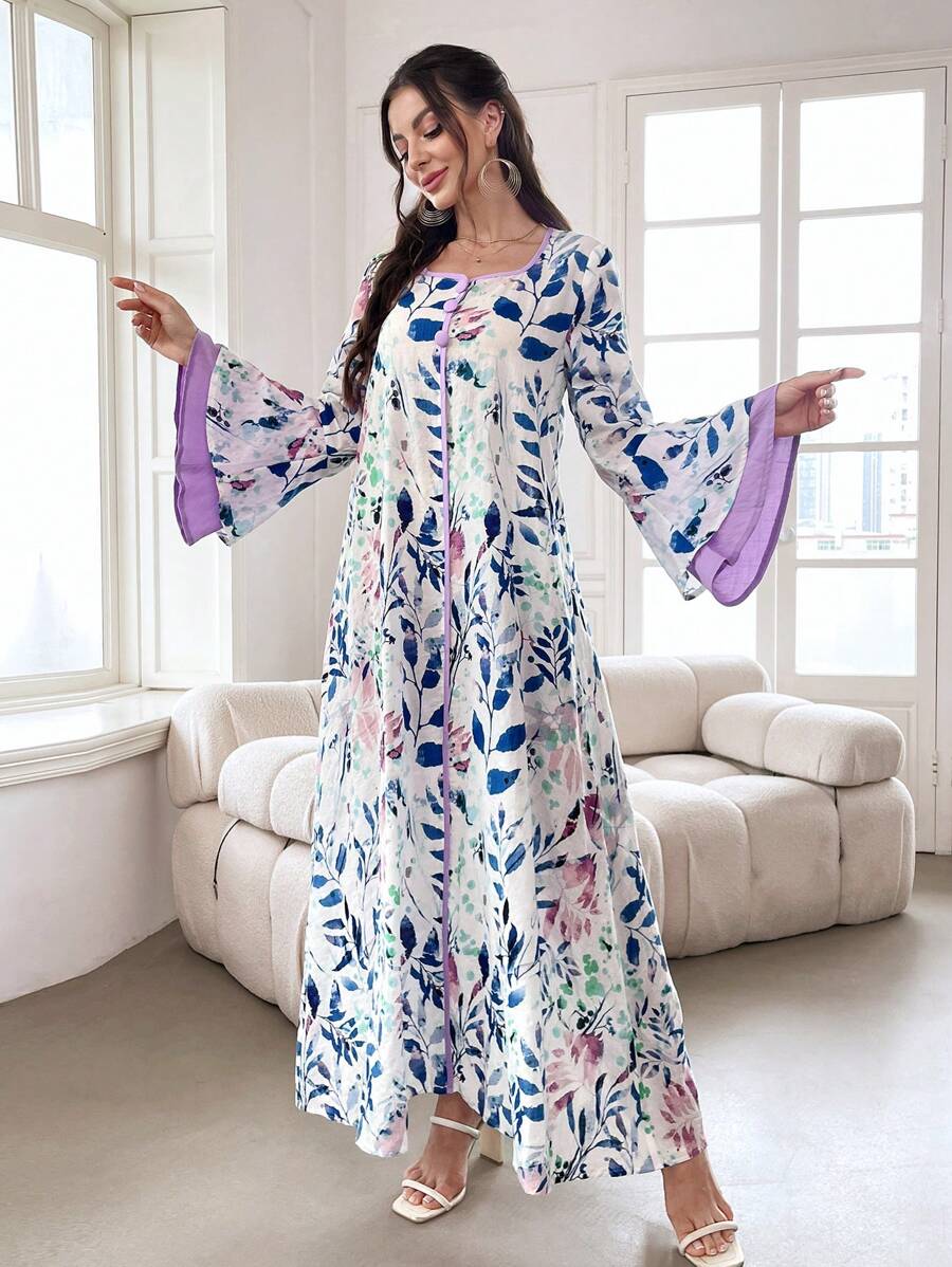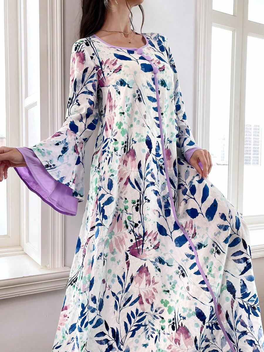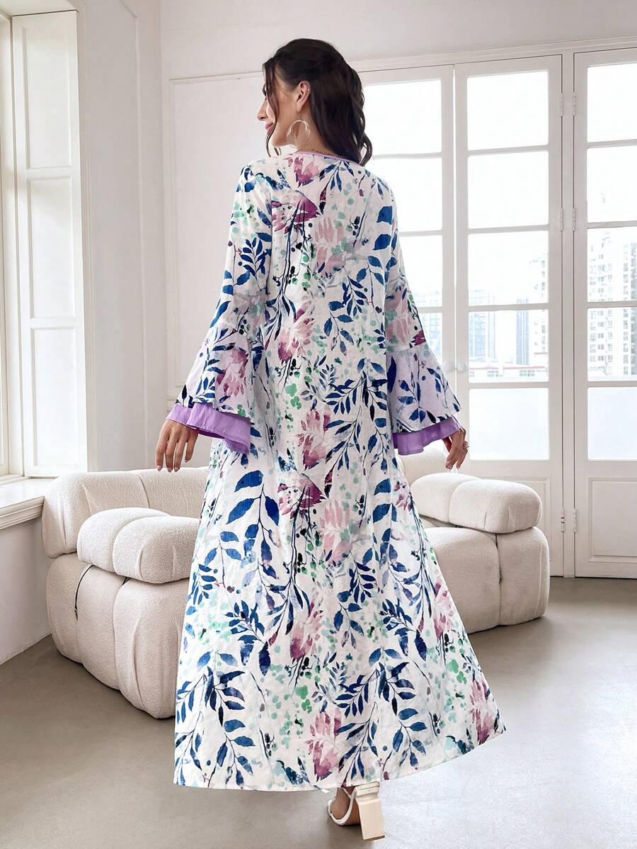SHEIN Najma Floral Print Contrast Trim Long Flounce Sleeve Modest Dress