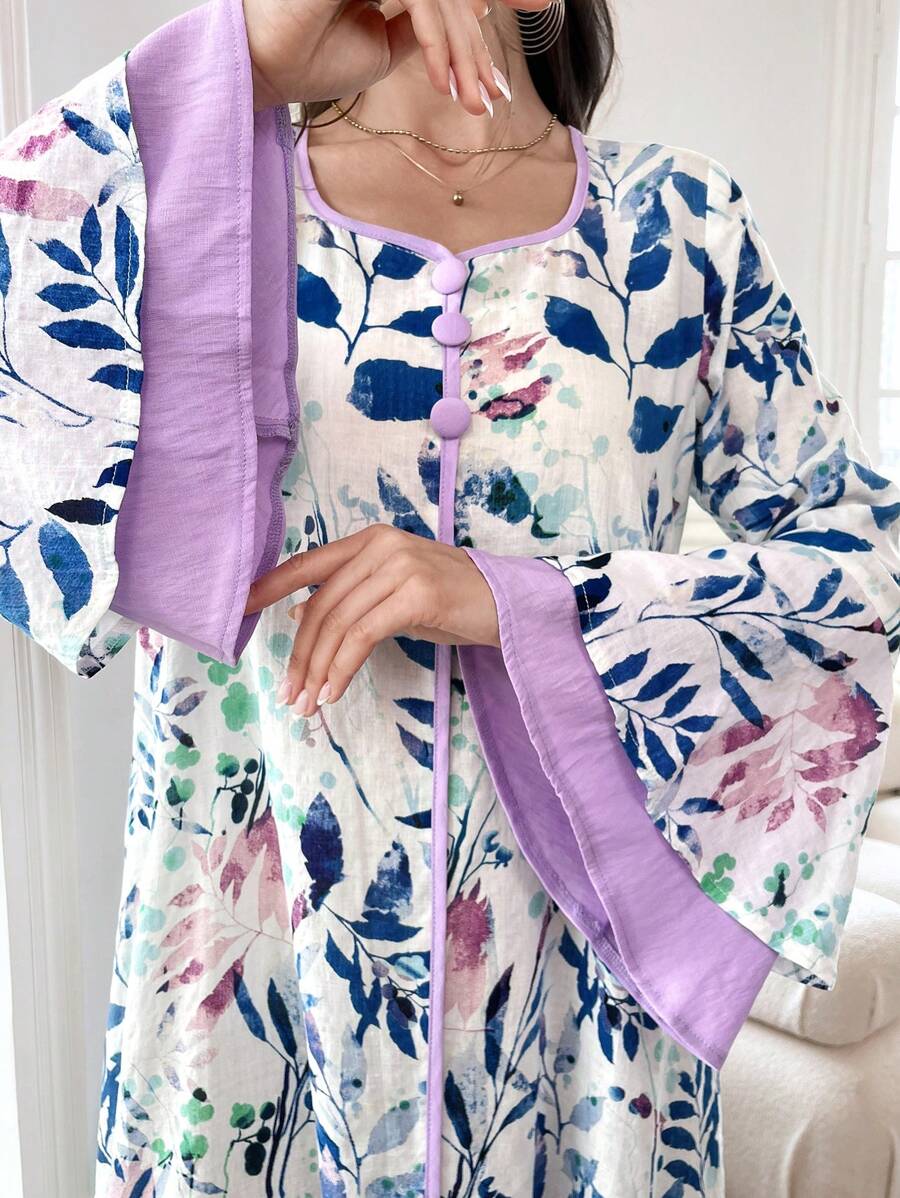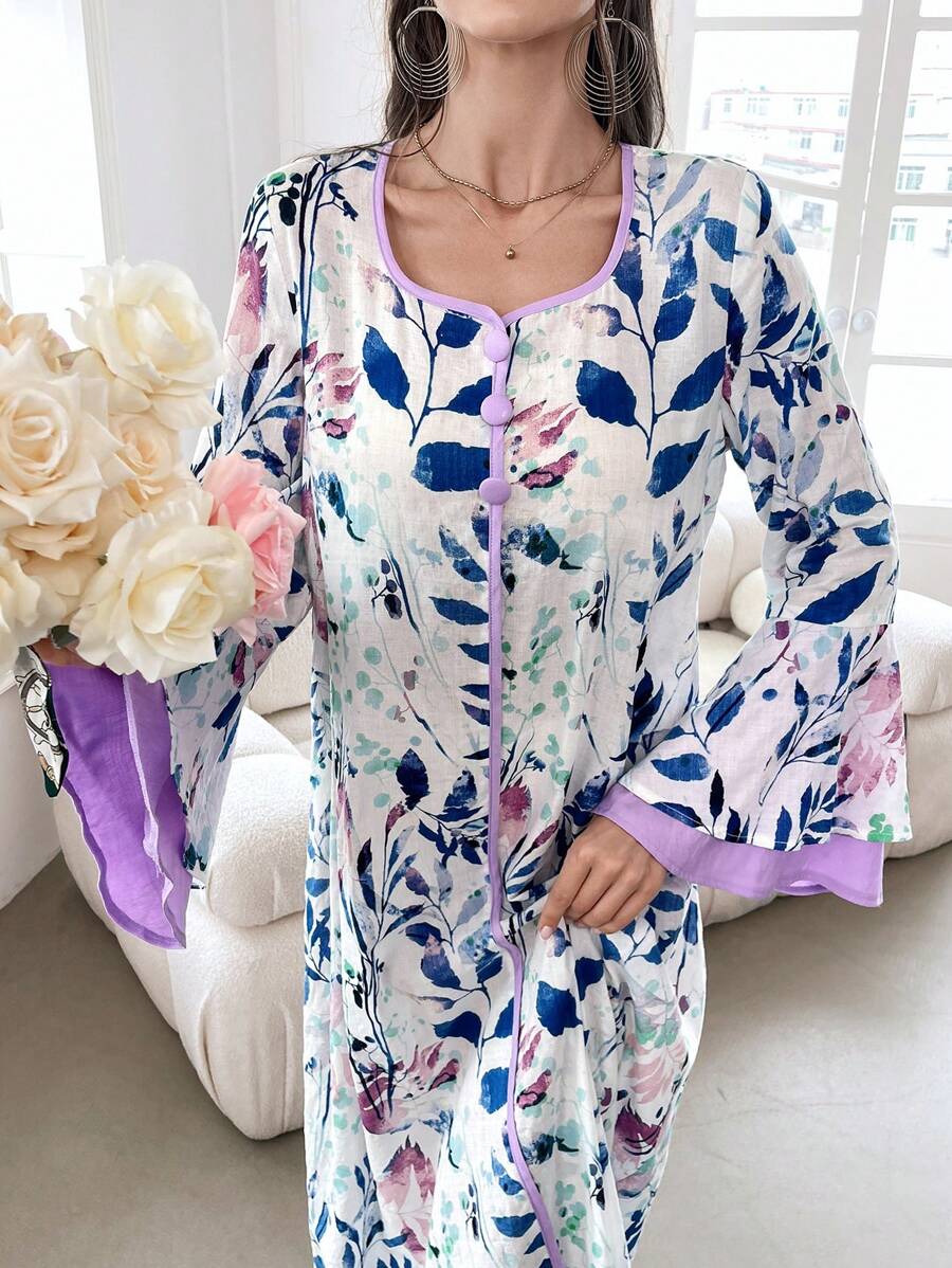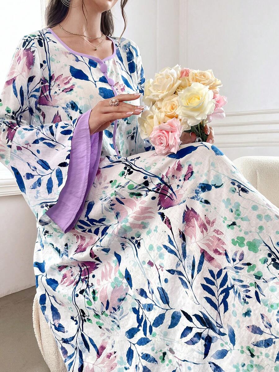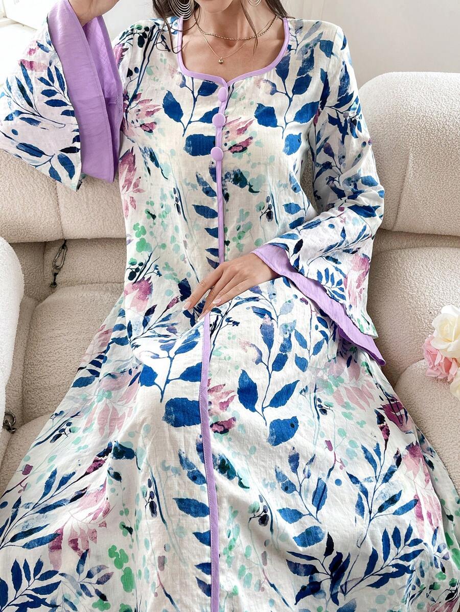 SHEIN Najma Floral Print Contrast Trim Long Flounce Sleeve Modest Dress