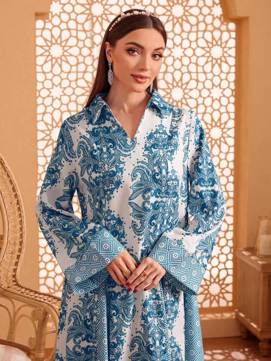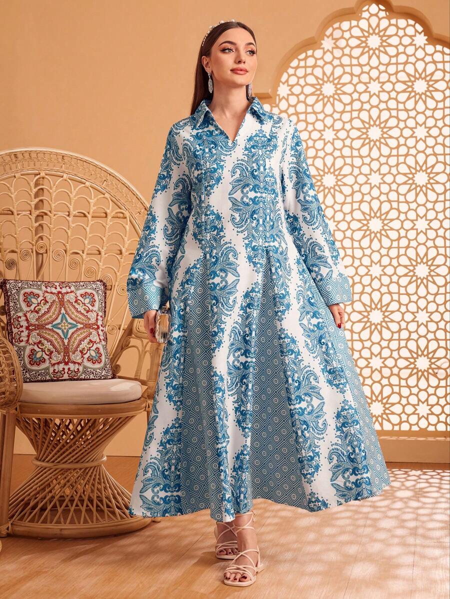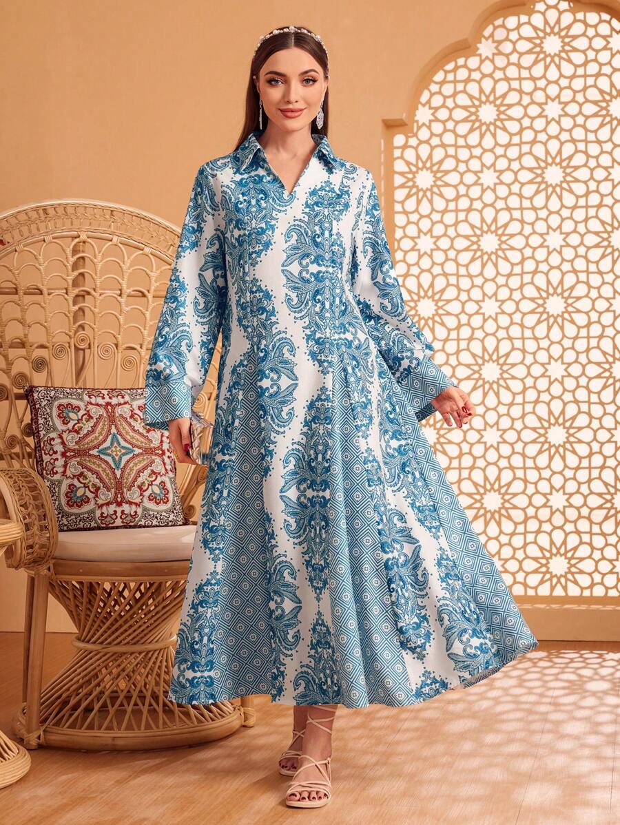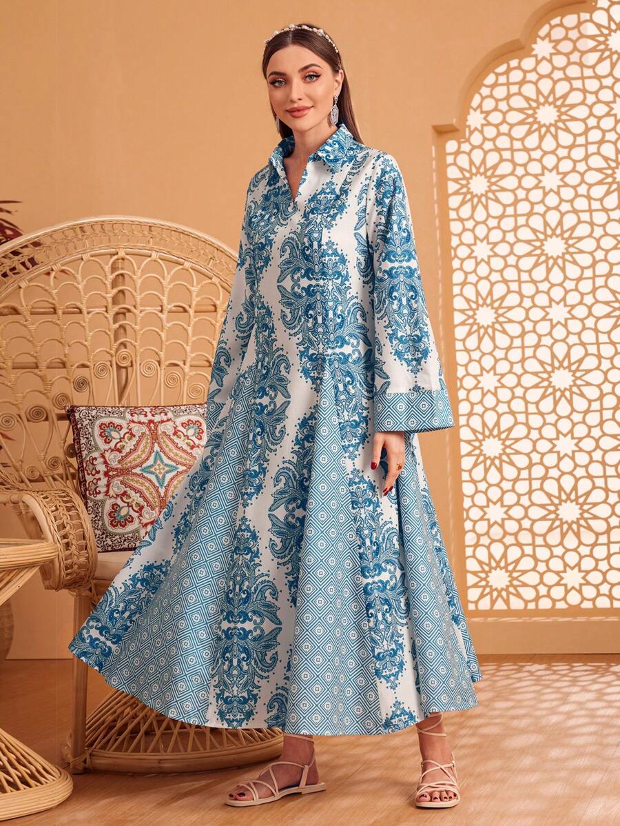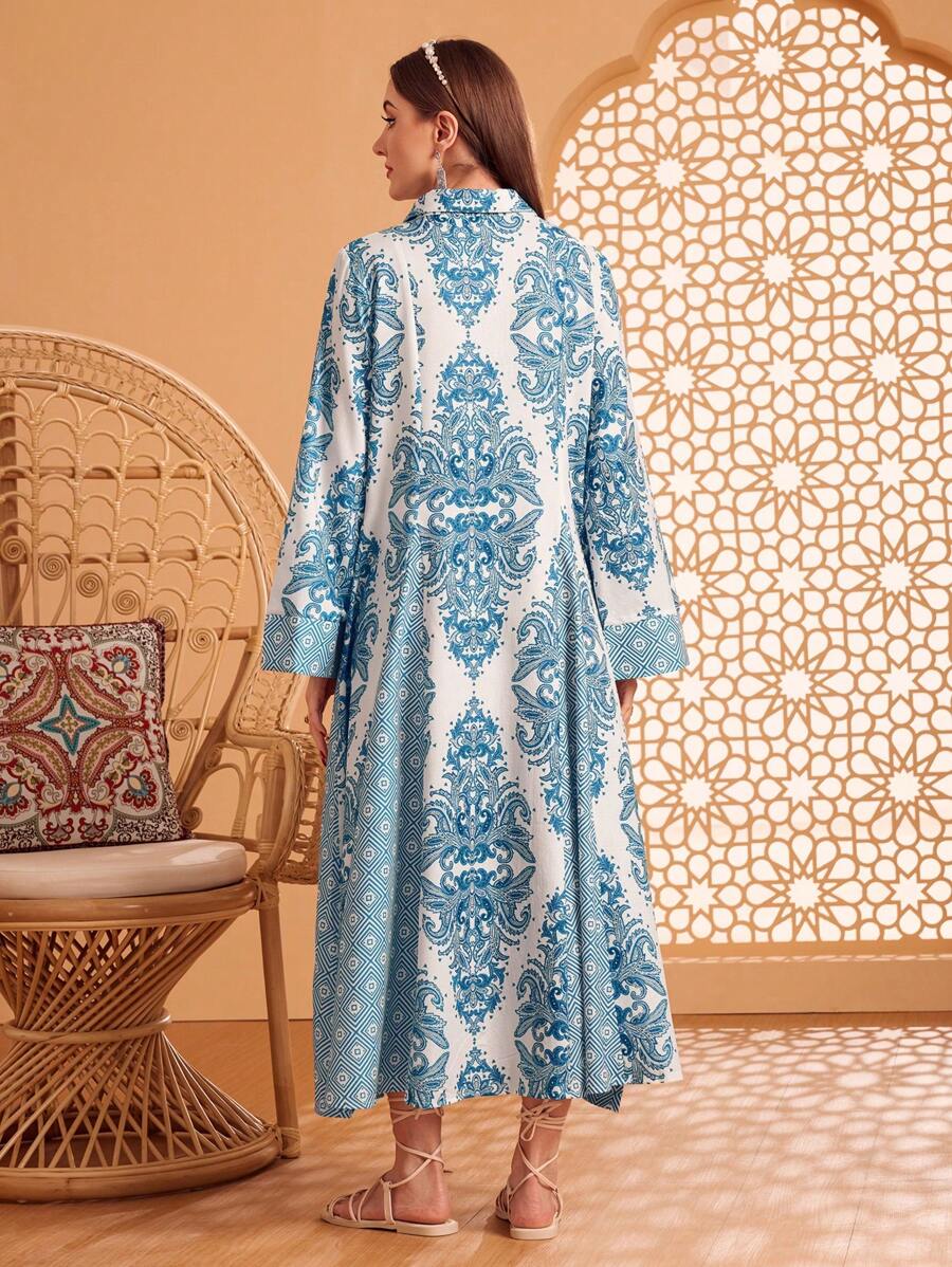 SHEIN Najma Full Printed V-Neck Flare Sleeve Dress