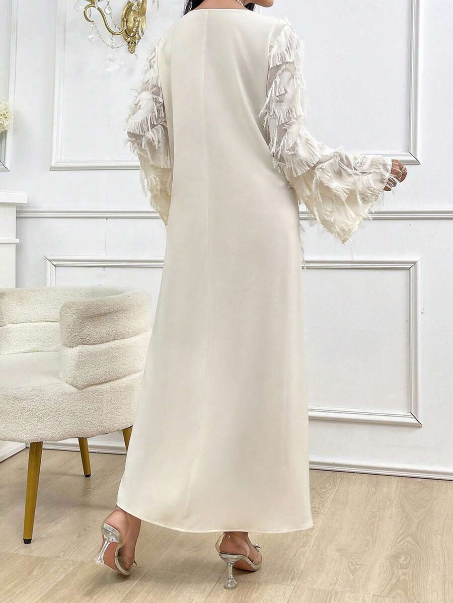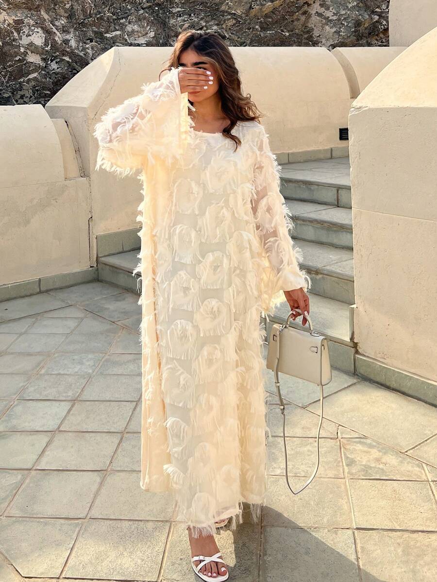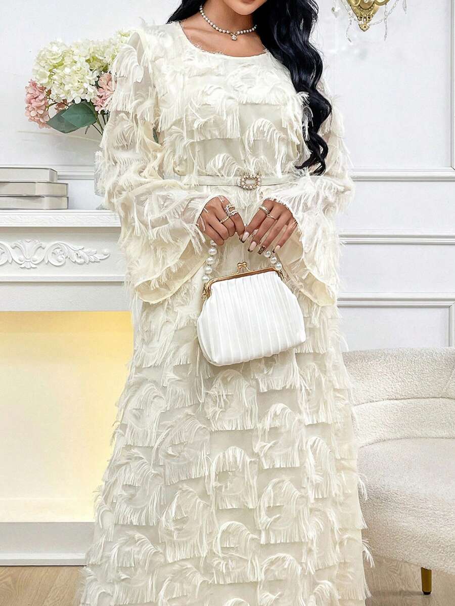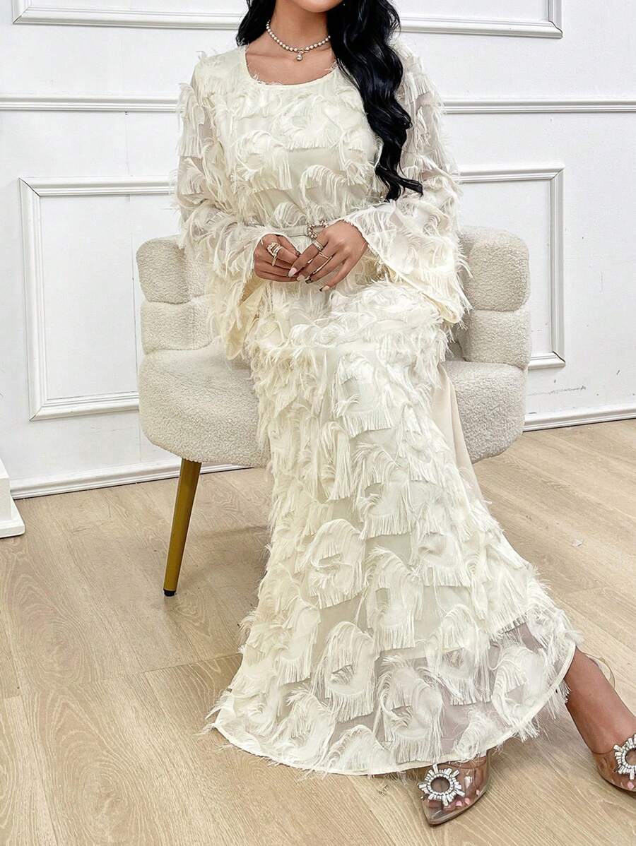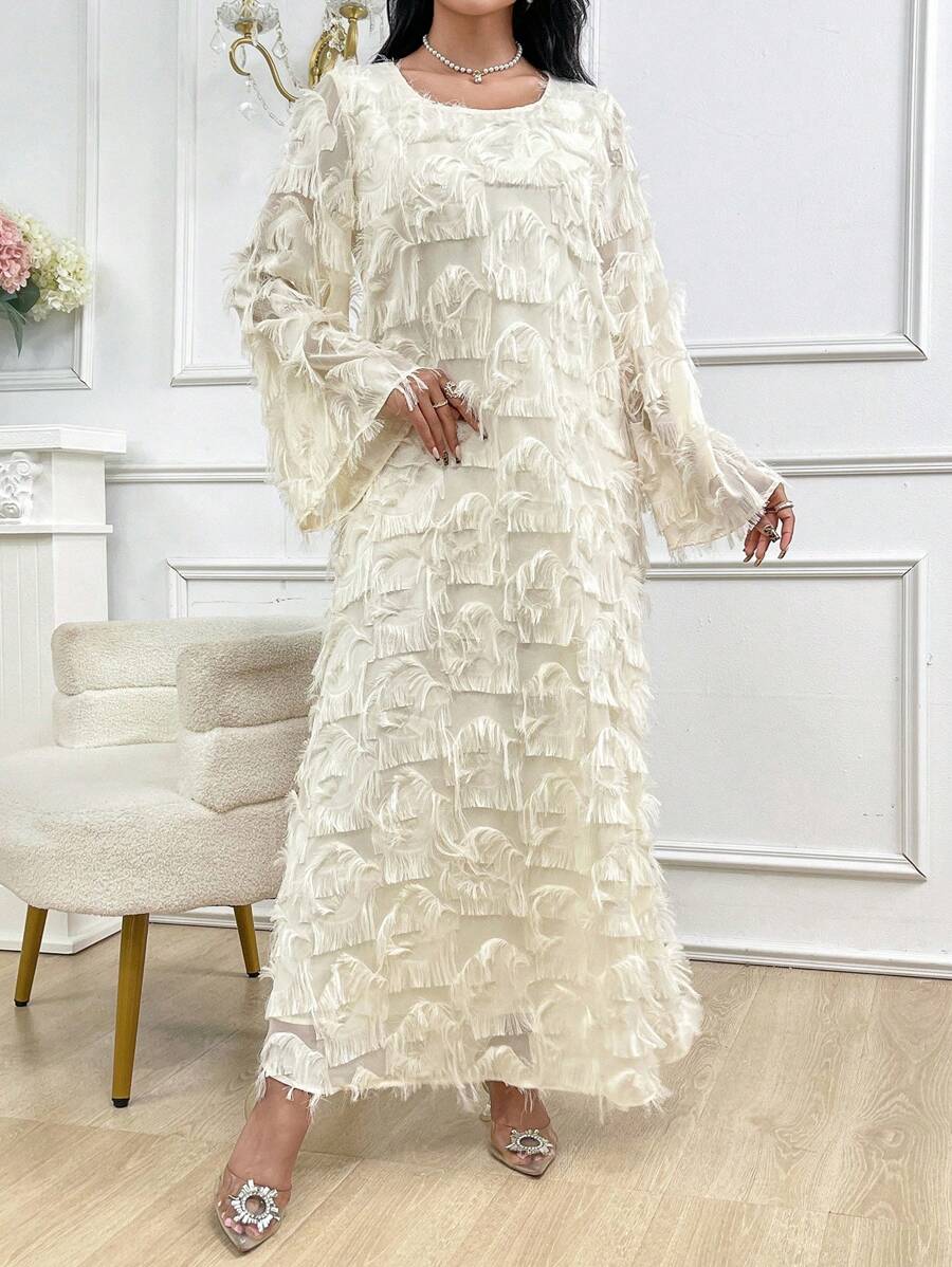 SHEIN Najma Women’s Round Neck Solid Color Long Sleeve Fuzzy Fringe Modest Dress