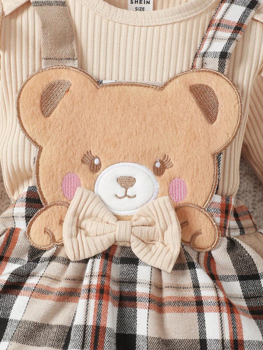 SHEIN Persoplay Kids Baby Girls’ Round Collar Long Sleeve Romper With Ruffle Detailing And Plaid Suspender Dress With Cute Bear Applique Set, With Headband, For Christmas