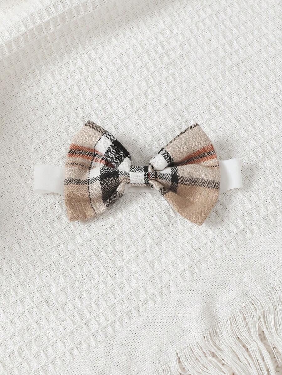 Home / SHEIN / Baby girl / SHEIN Persoplay Kids Baby Girls’ Round Collar Long Sleeve Romper With Ruffle Detailing And Plaid Suspender Dress With Cute Bear Applique Set, With Headband, For Christmas