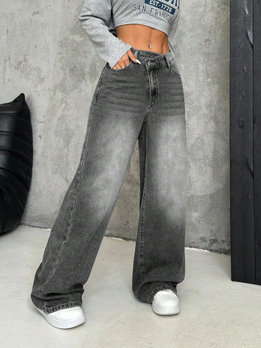 SHEIN PETITE Women’s Thick Denim Wide Leg Pants With Slanted Front Pocket, Blue