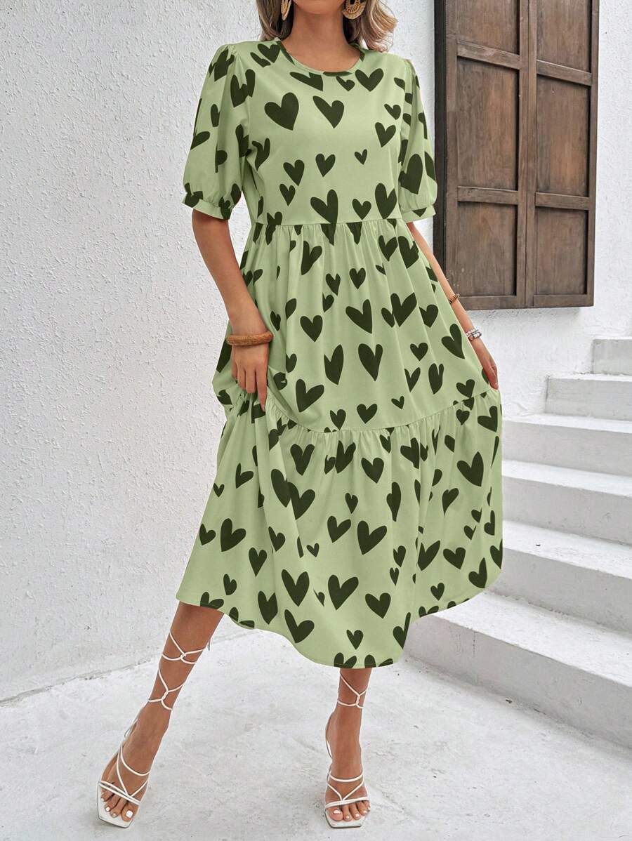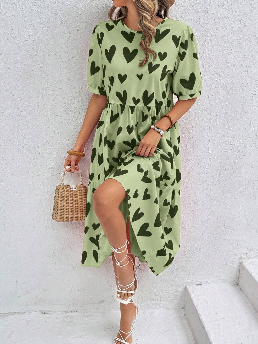 SHEIN Relaxiva Heart Print Loose Crew Neck Short Sleeve Casual Dress