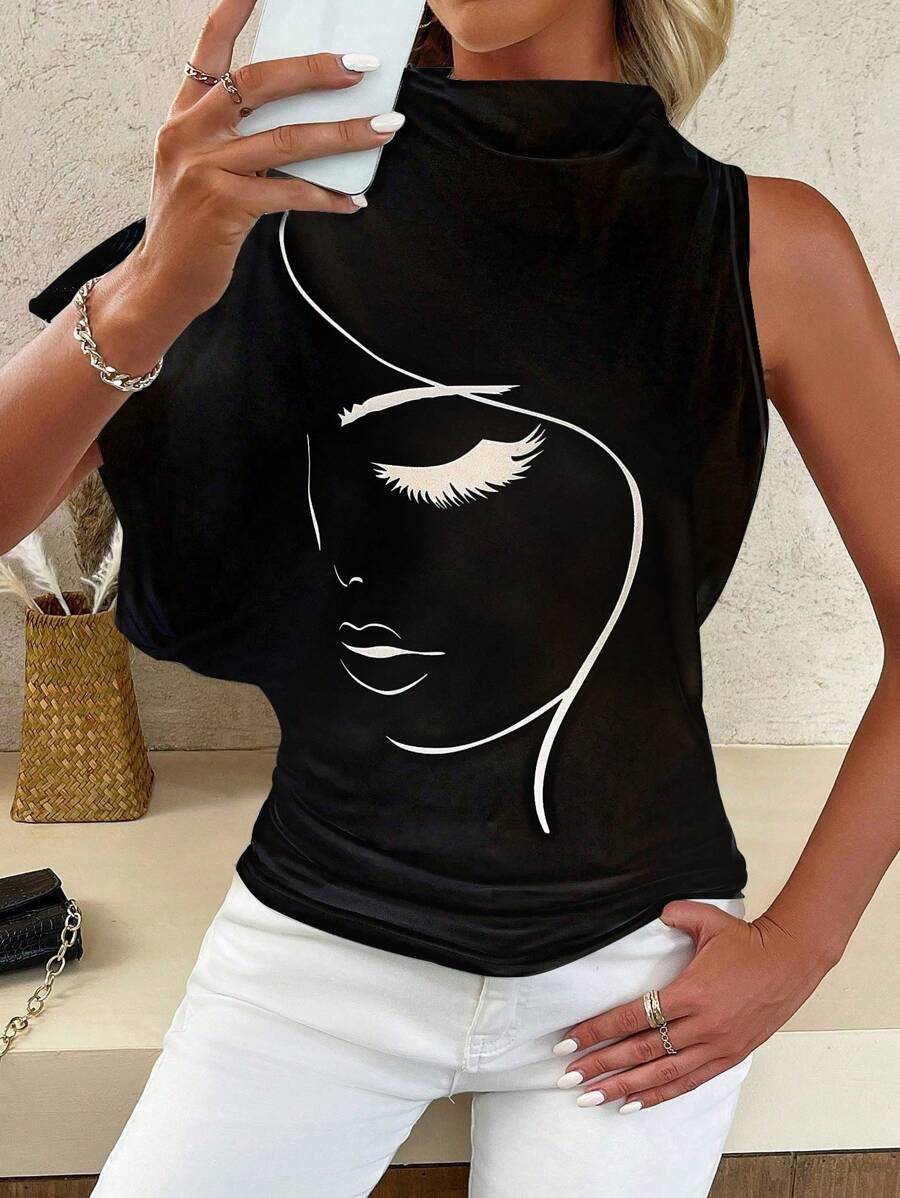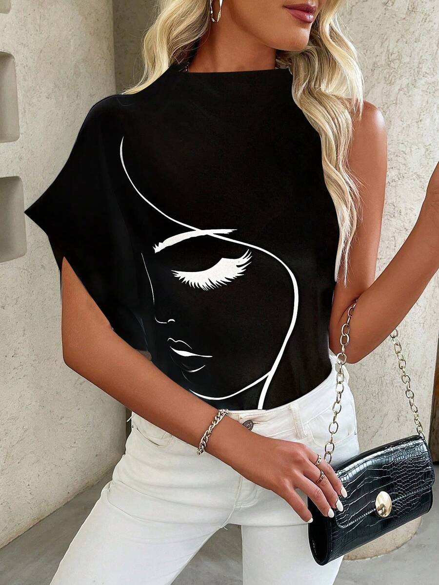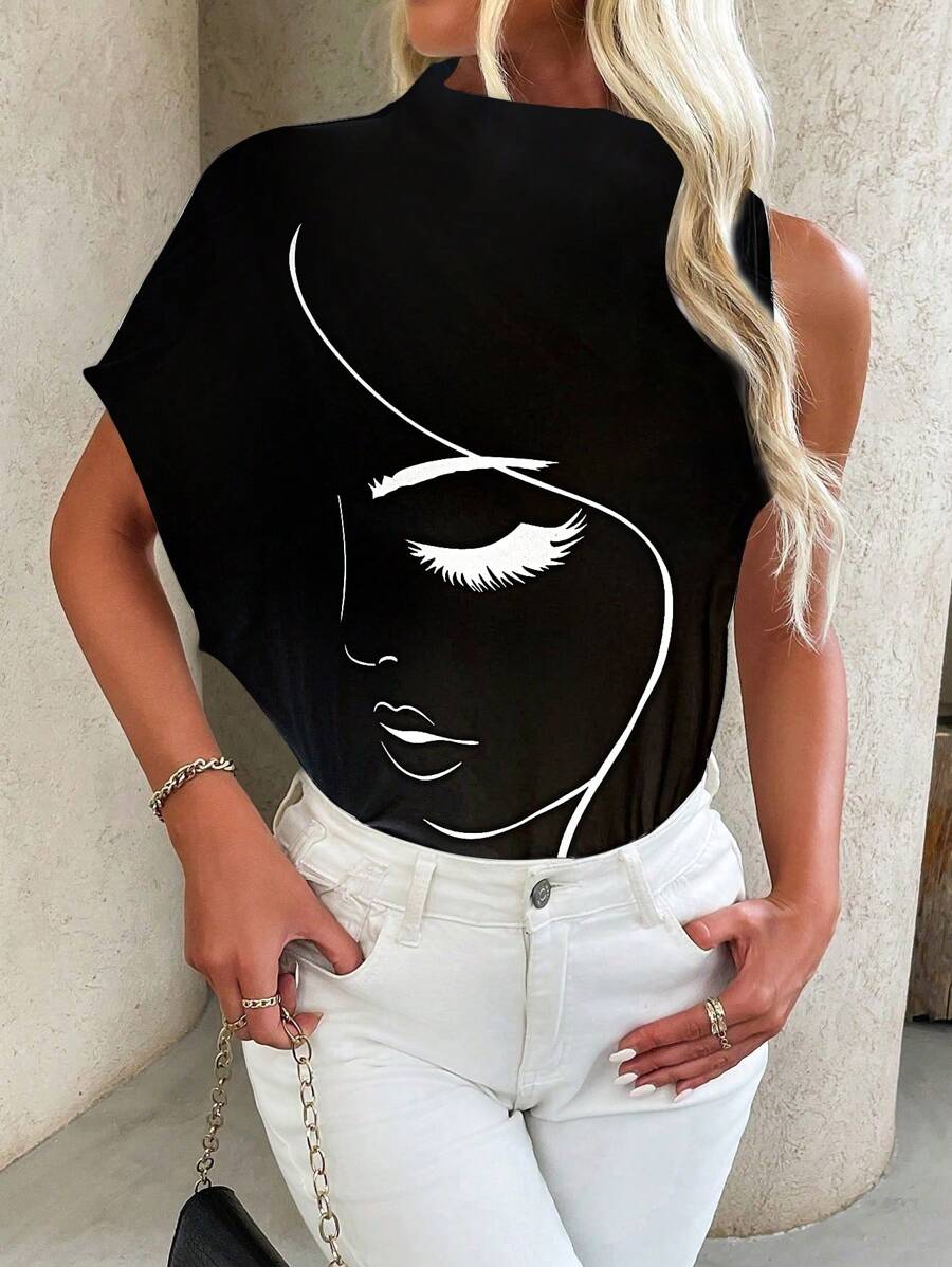 / SHEIN Relaxiva Knitted Stand Collar Asymmetric Sleeve Graphic White Women’s T-Shirt Graphic Tees Women Tops