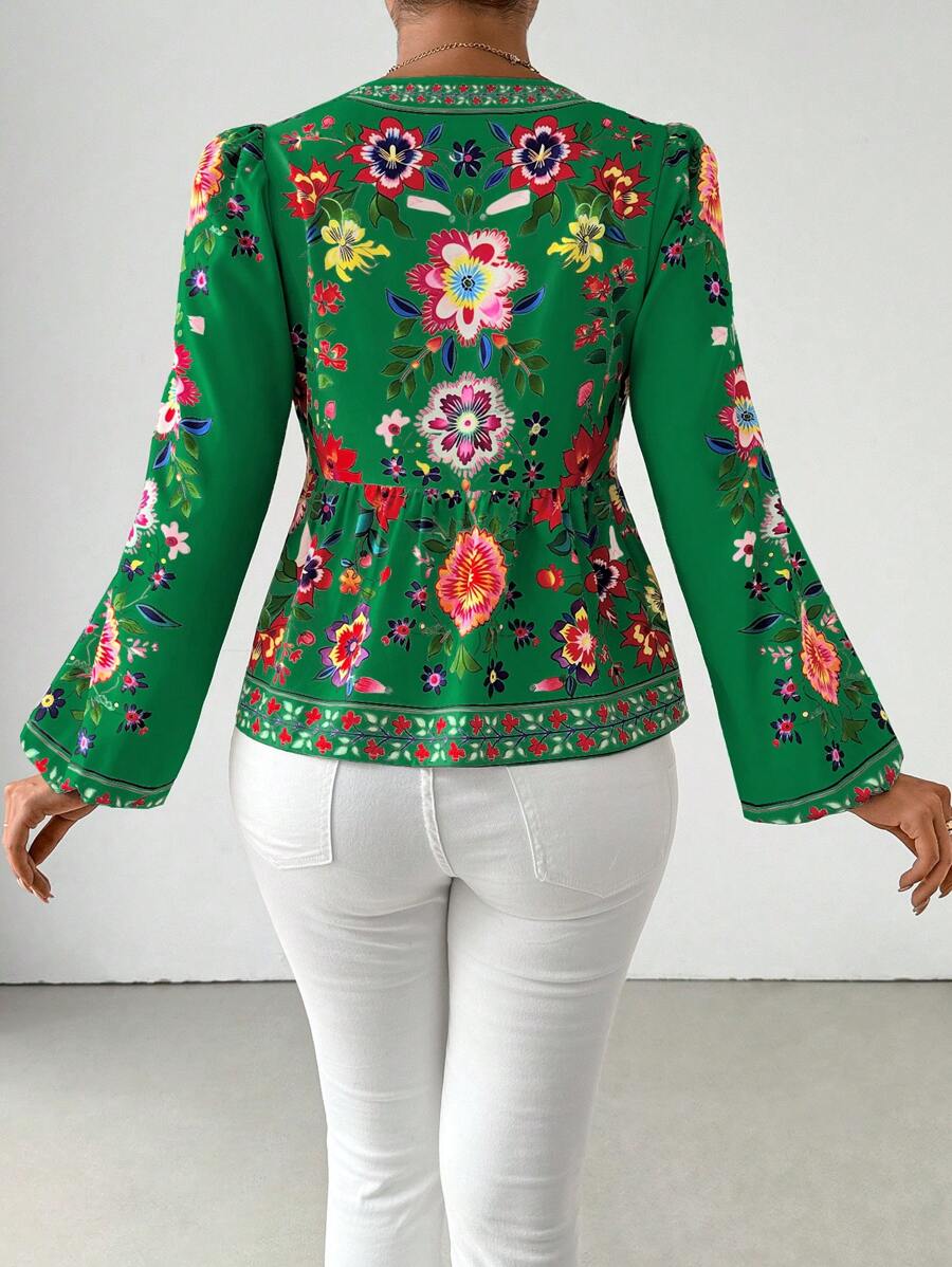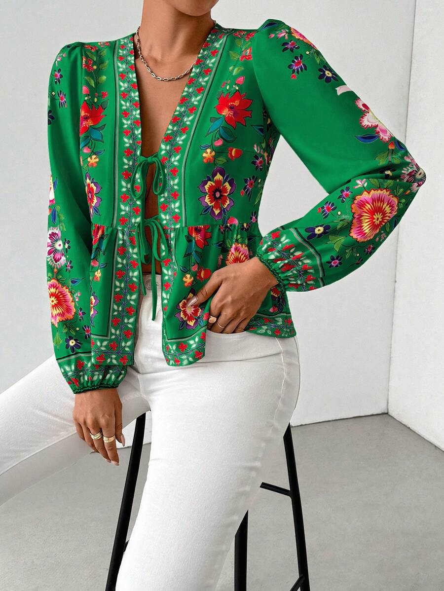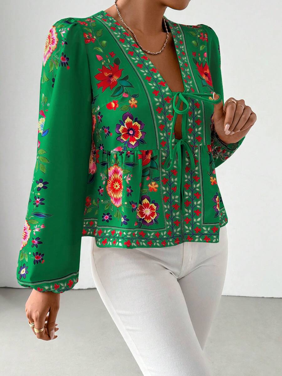 SHEIN Relaxiva Women’s Long Sleeve Shirt With All-Over Print, Tie Bow And Puff Sleeves