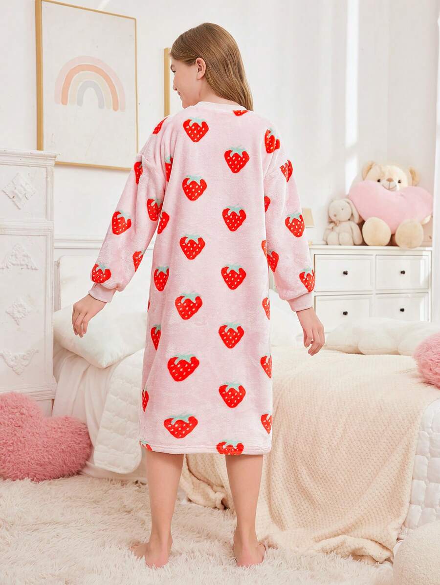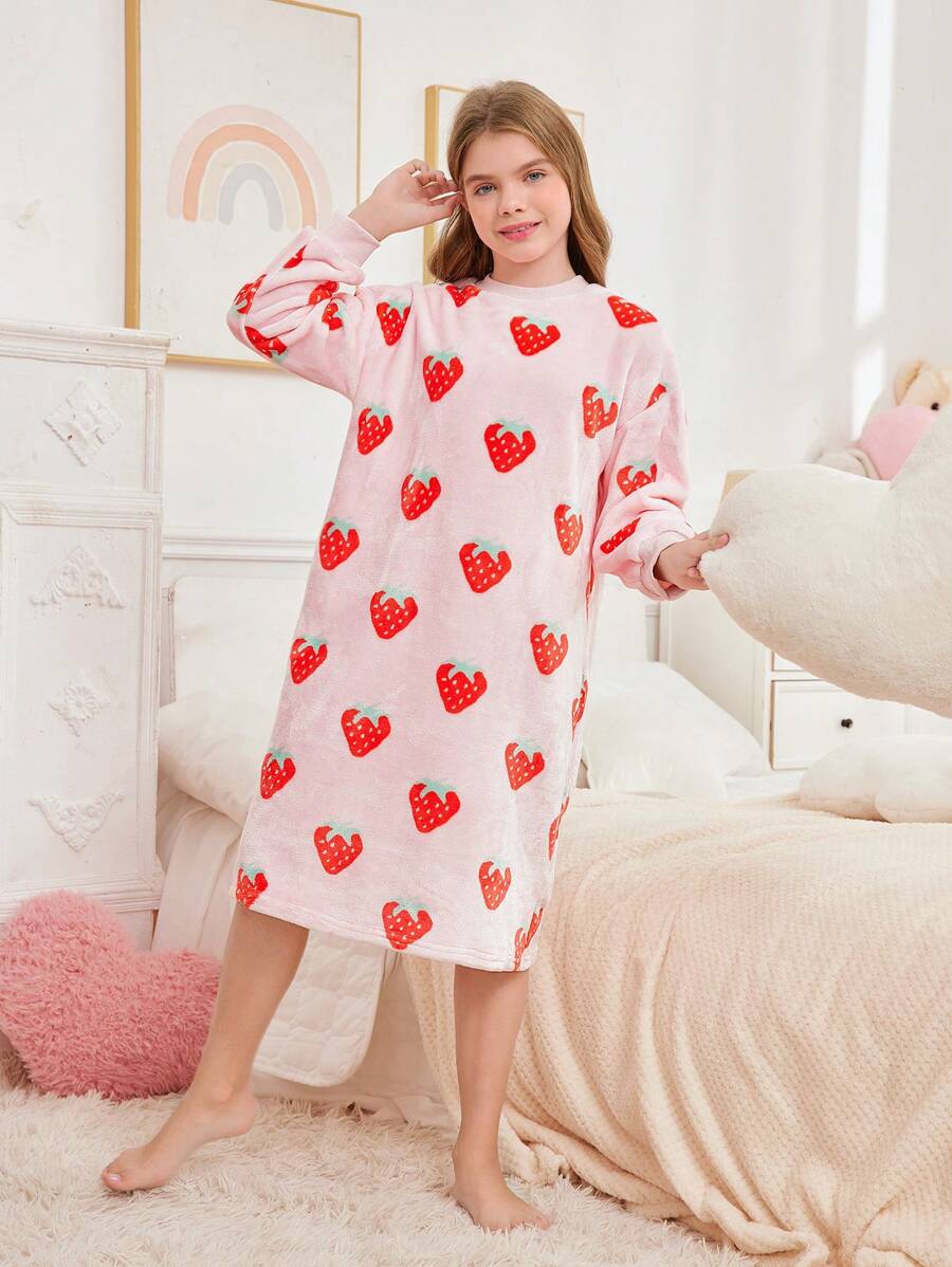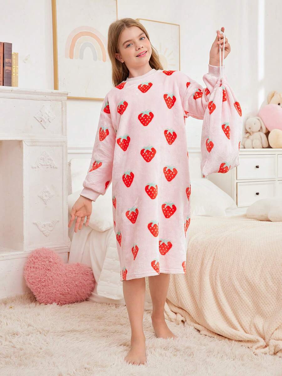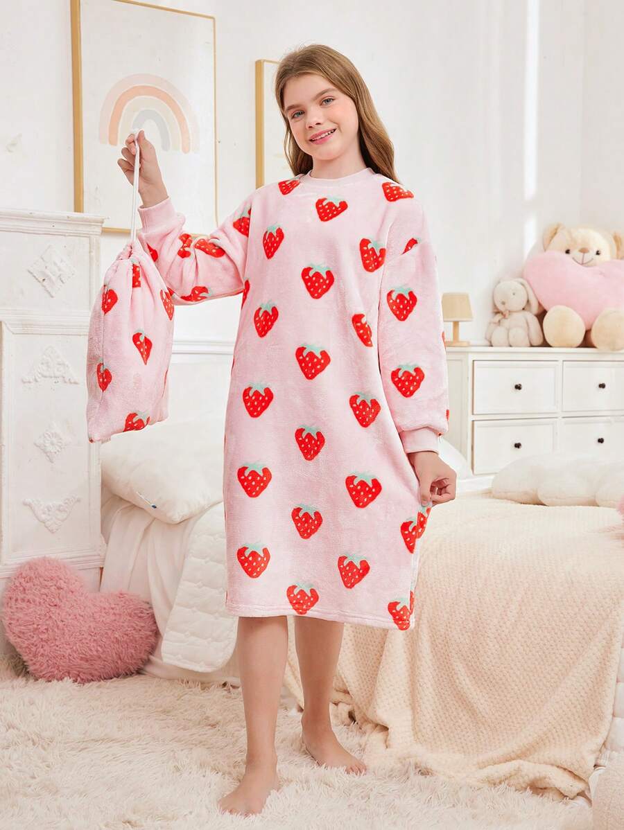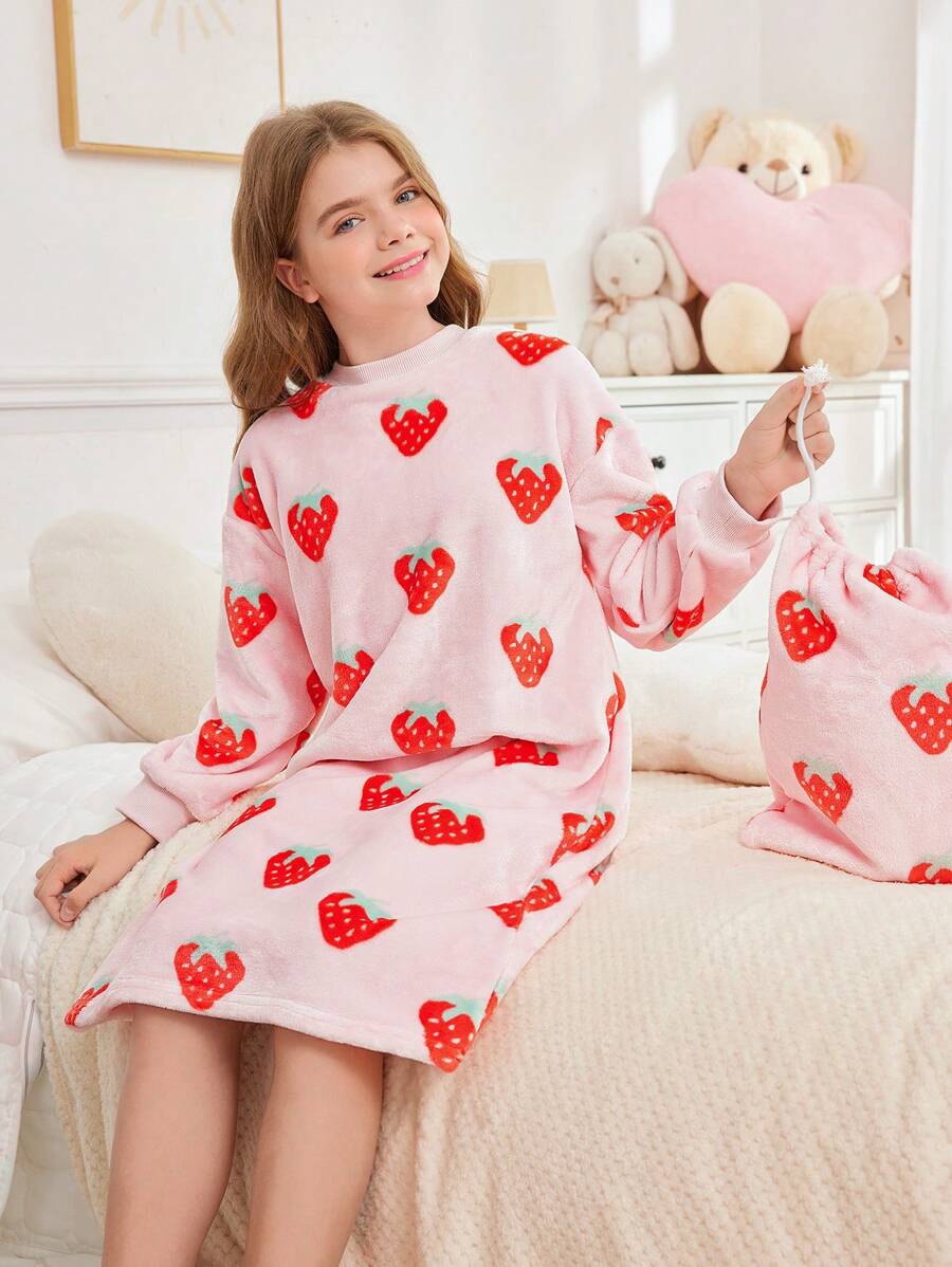 SHEIN Tween Girl Autumn/Winter Cute Strawberry Pattern Pullover Crew Neck Long Sleeve Nightgown With Drawstring And Storage Bag, Soft & Comfortable Flannel Pajama Set, 2 Pieces (Sibling Outfits Sold Separately)