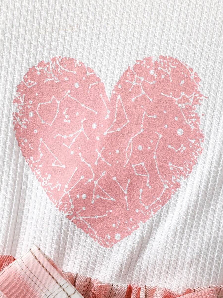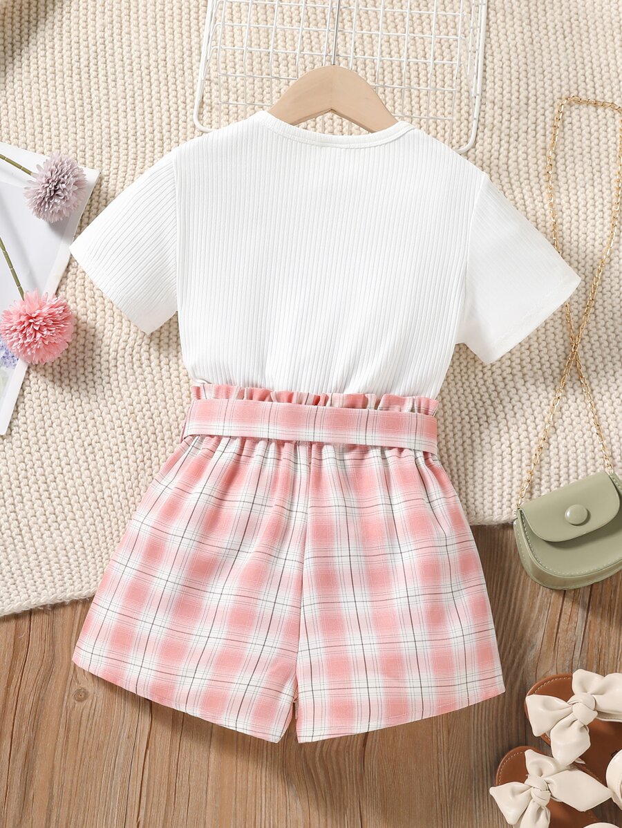 SHEIN Tween Girl Heart Print Tee With Plaid Belted Paperbag Shorts Without Bag