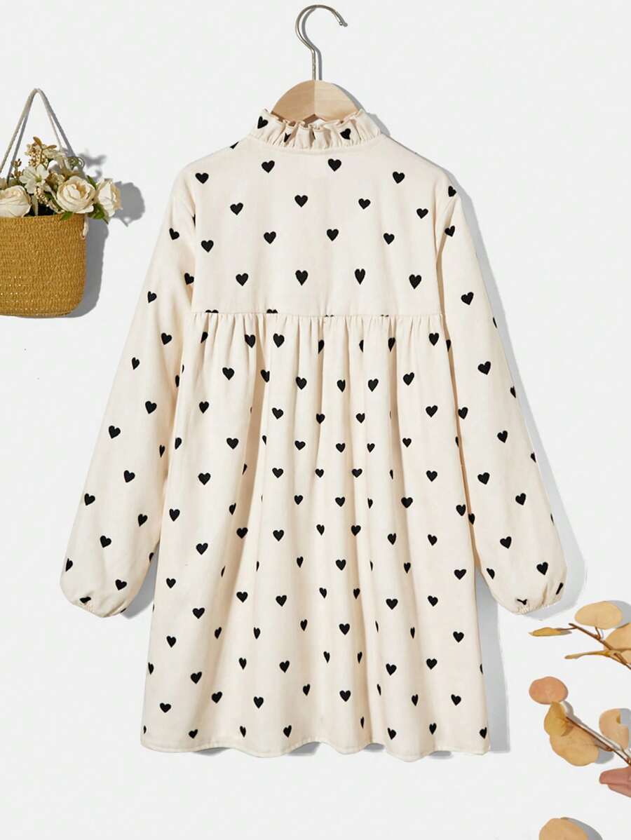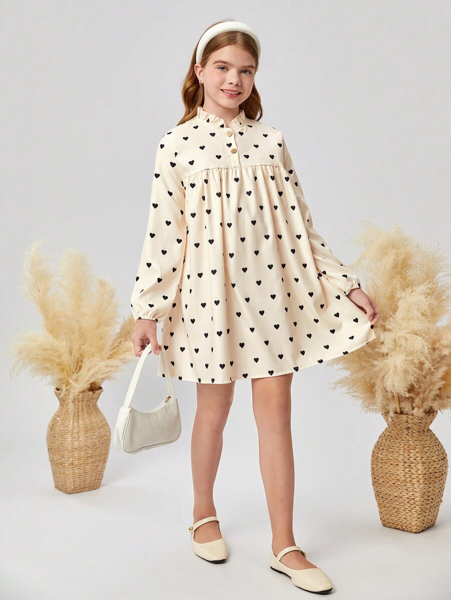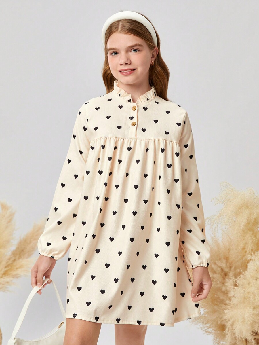 / SHEIN Tween Girl Woven Solid Color Heart Patterned Half Buttoned Relaxed Fit Holiday Dress With Ruffle Neckline