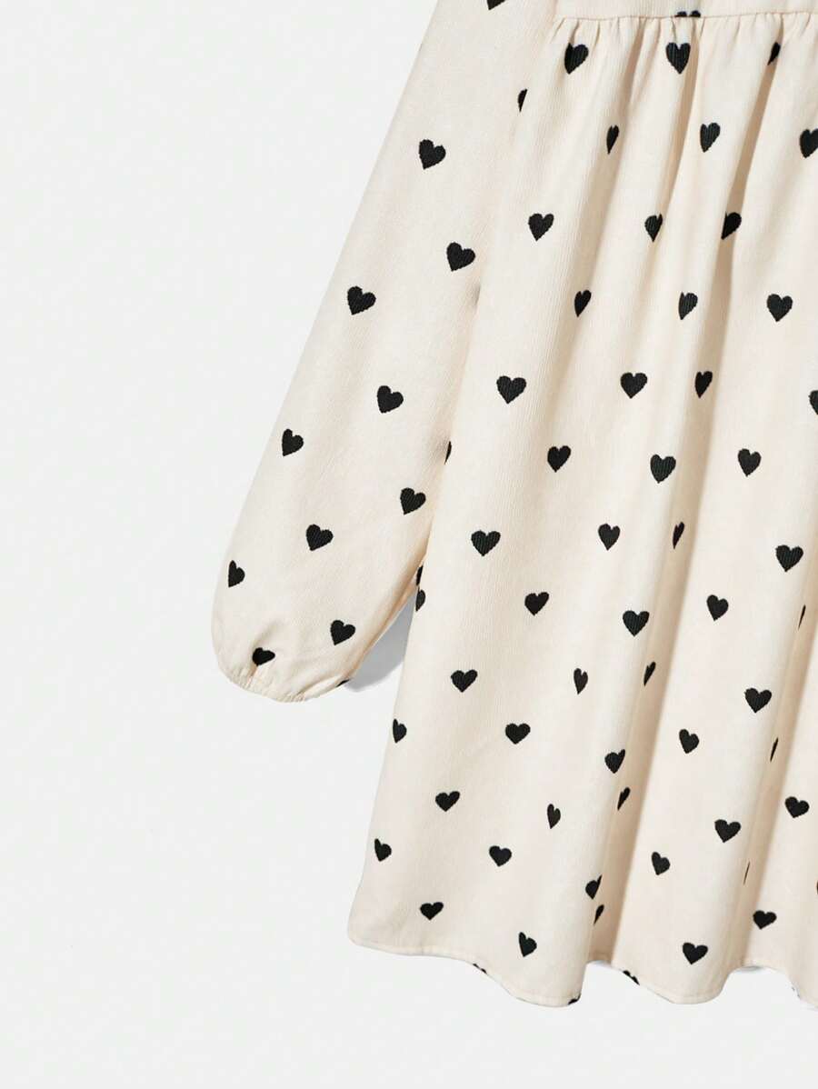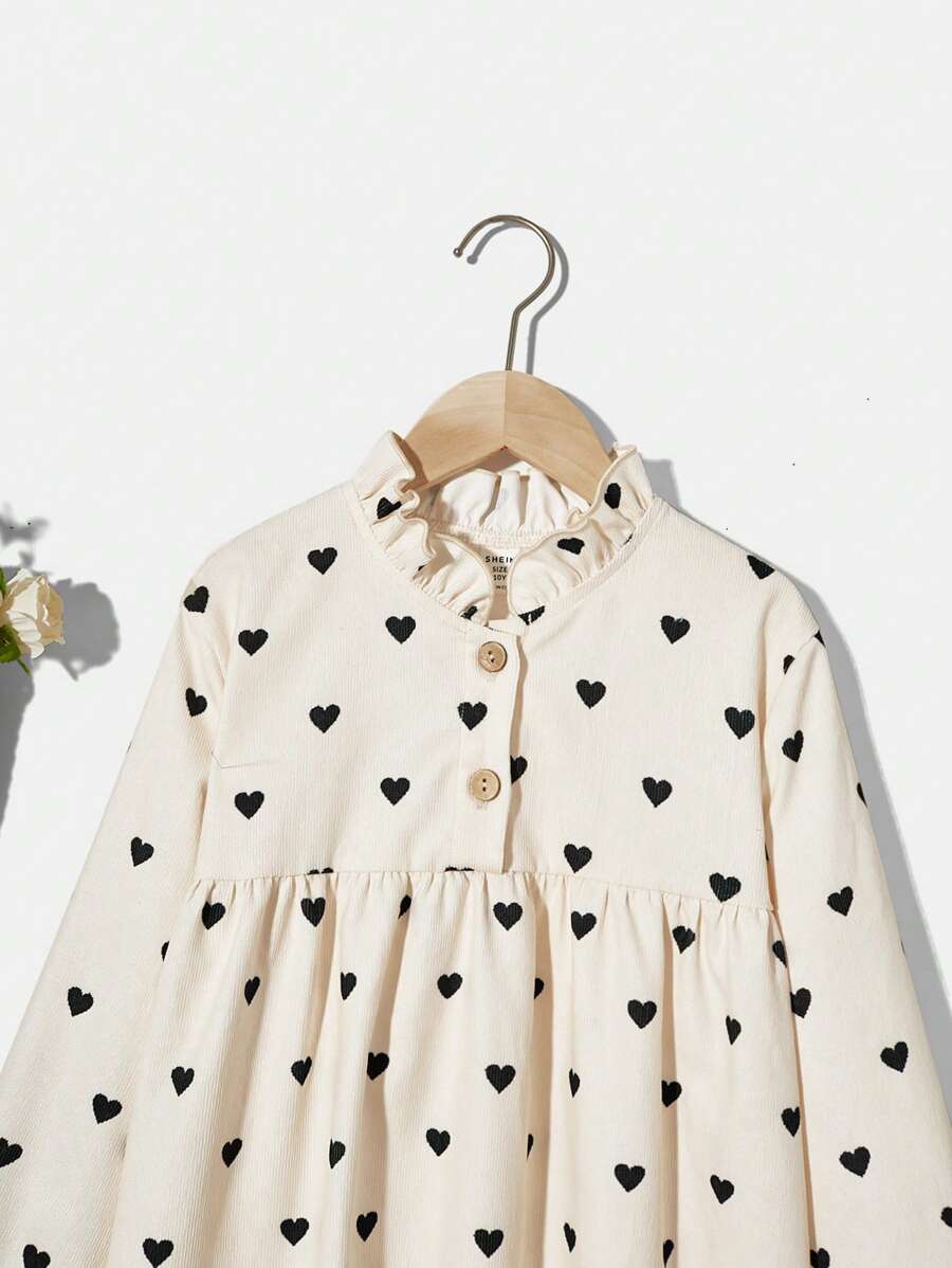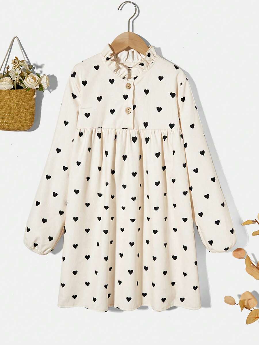 / SHEIN Tween Girl Woven Solid Color Heart Patterned Half Buttoned Relaxed Fit Holiday Dress With Ruffle Neckline