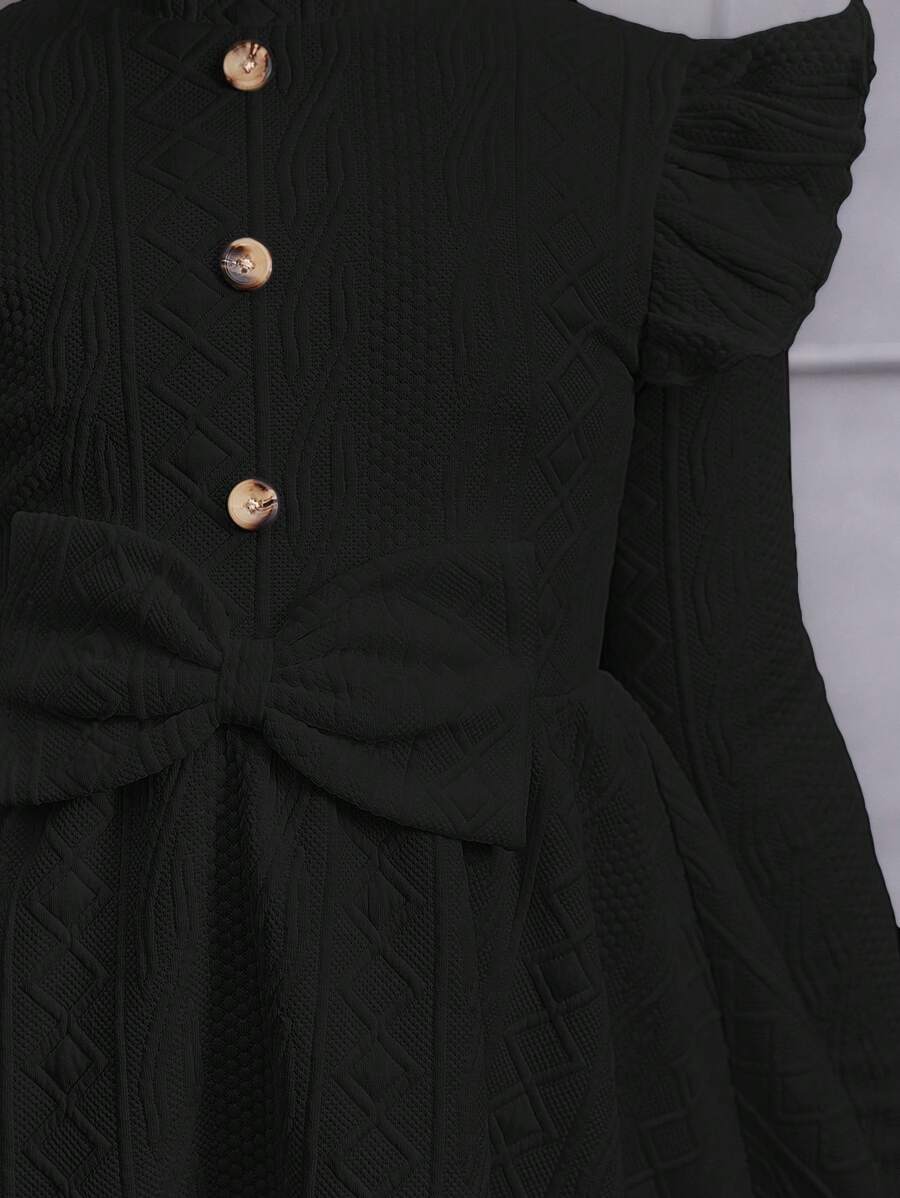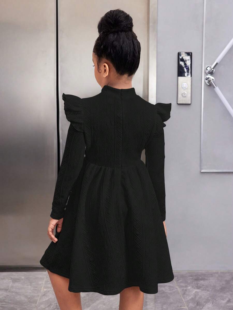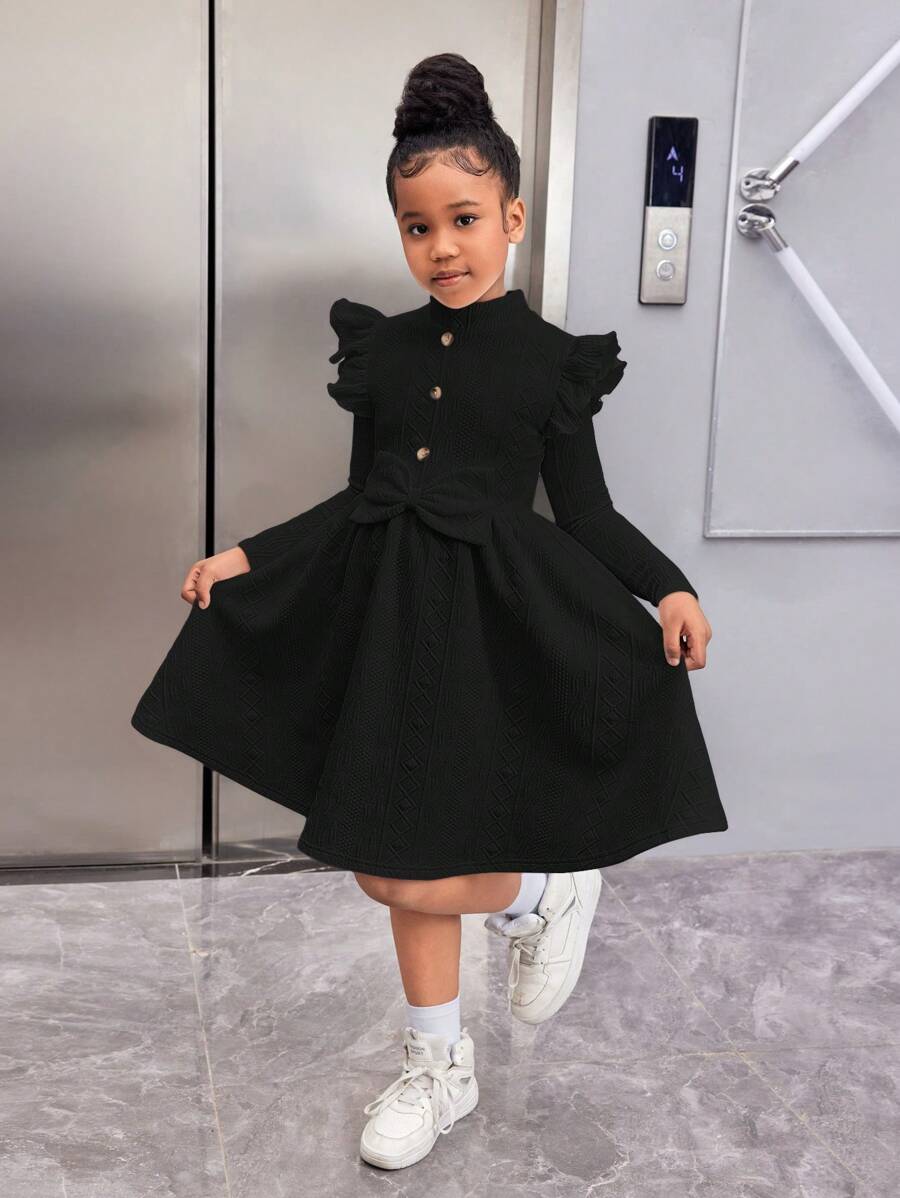 SHEIN Tween Girls Casual Vintage Elegant Stand Collar Jacquard Buttoned Waist Flared Long Sleeve Dress