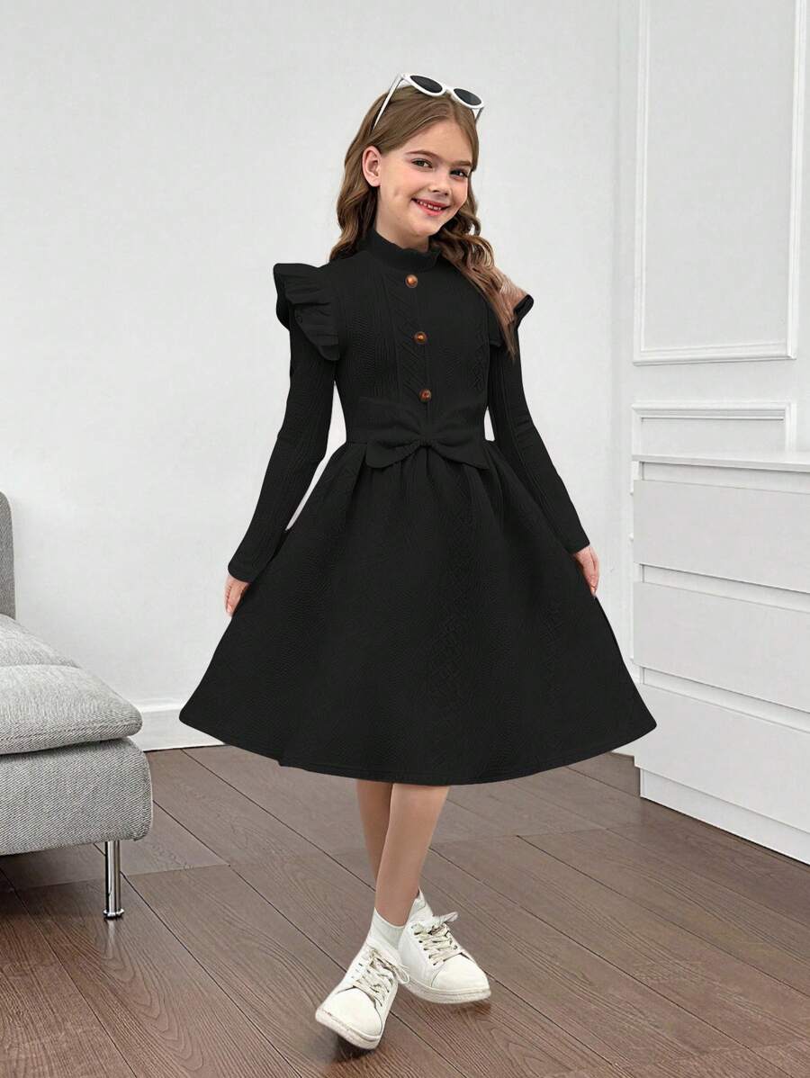 / SHEIN Tween Girls Casual Vintage Elegant Stand Collar Jacquard Buttoned Waist Flared Long Sleeve Dress