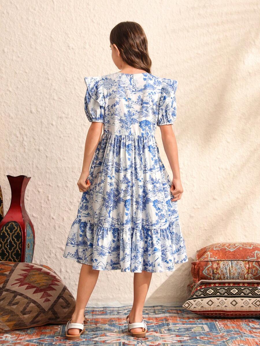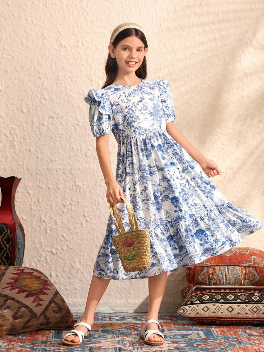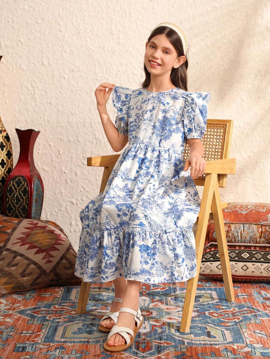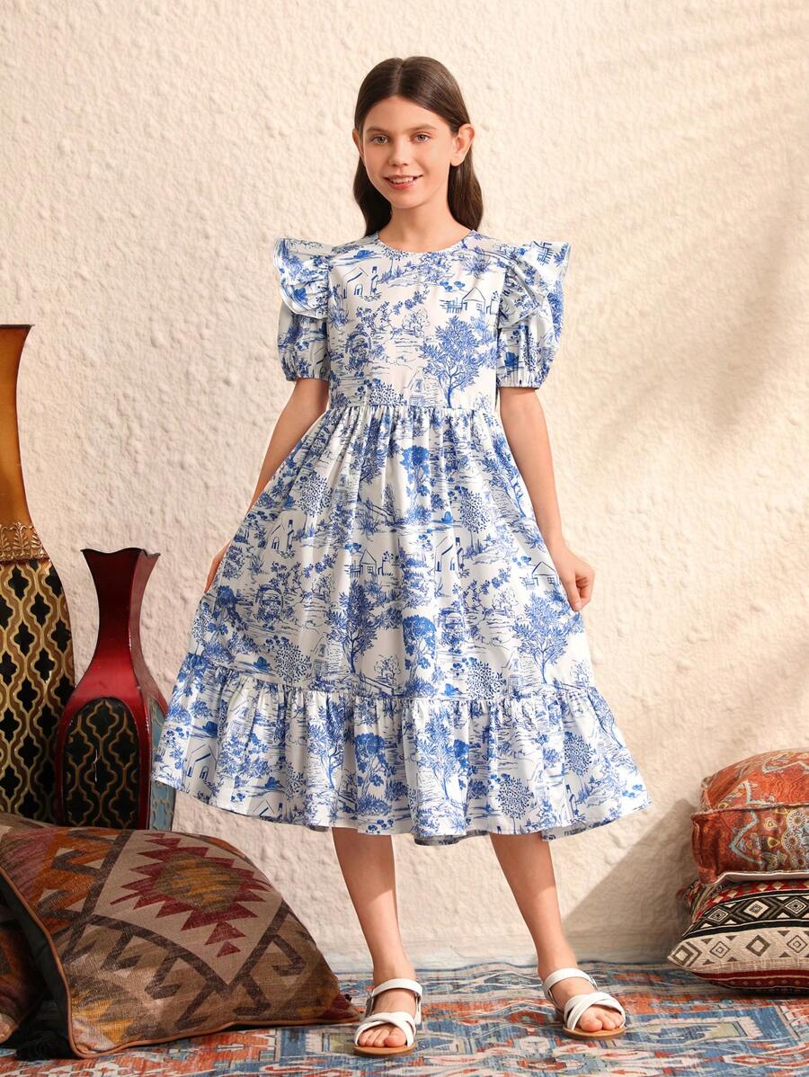 SHEIN Tween Girl’s Woven Scenery Pattern Puff Sleeve Loose Fit Casual Dress With Round Collar