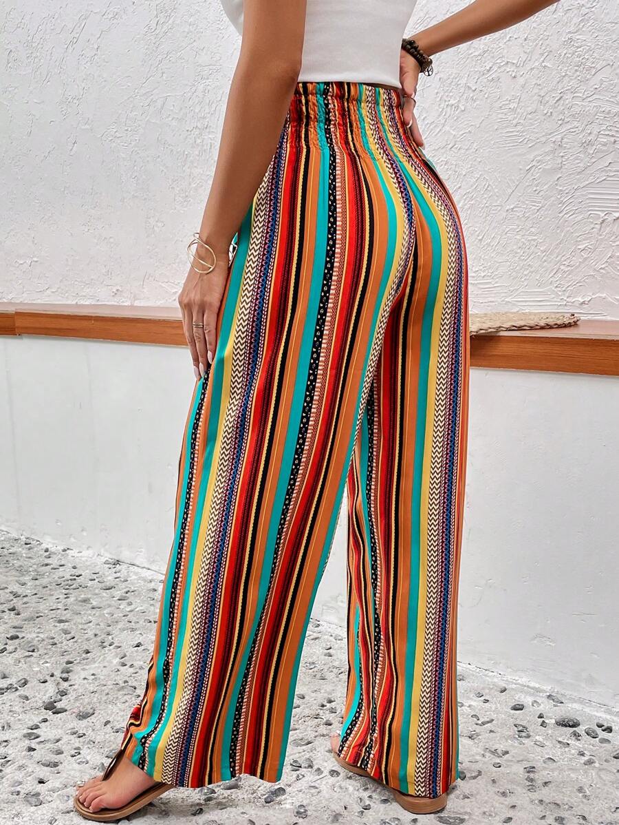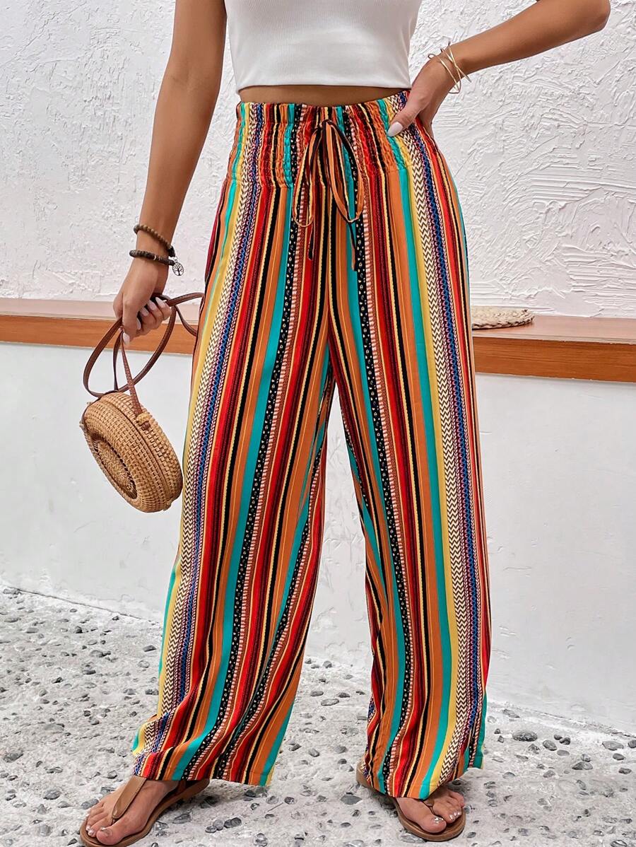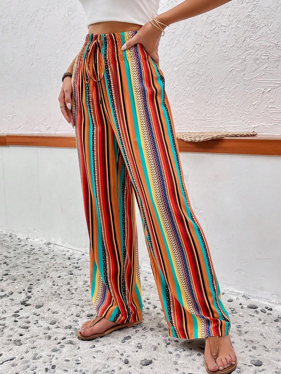 SHEIN VCAY Summer Beach Striped Print Knot Waist Straight Leg Pants