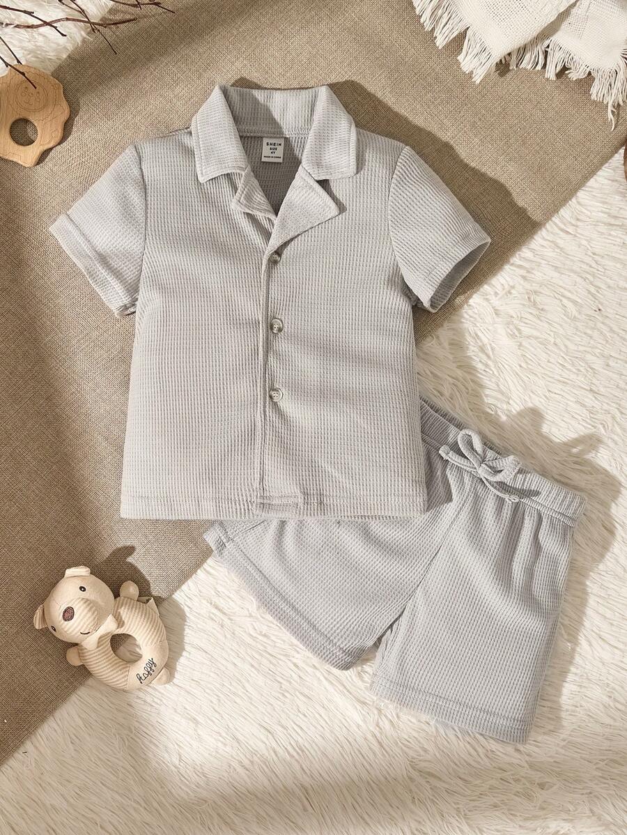 / SHEIN Vintaside Kids Young Boy Casual Gray Plaid Short Sleeve Shirt And Shorts Set For Summer