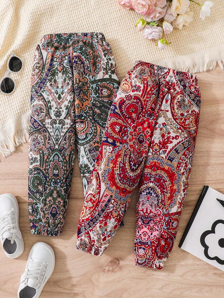 SHEIN Young Girl 2pcs Paisley Print Elastic Waist Cuffed Pants quantity