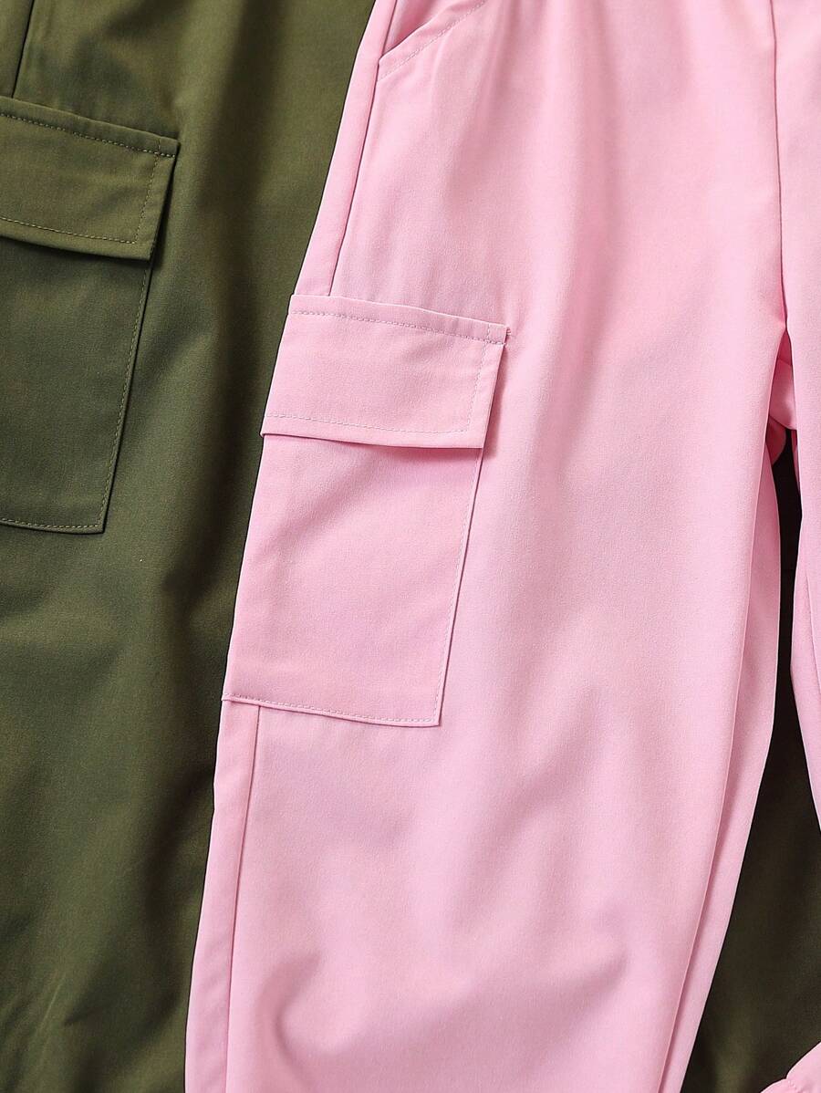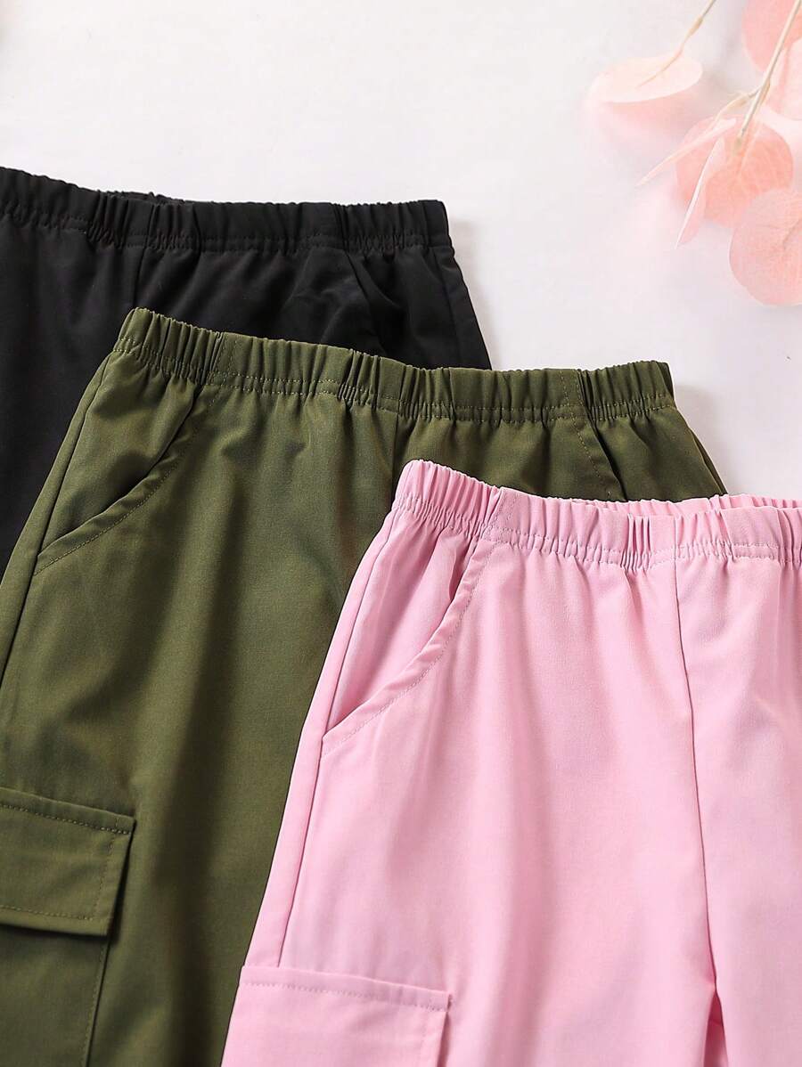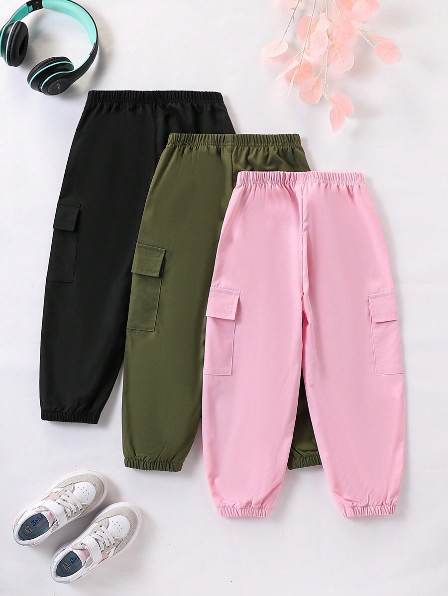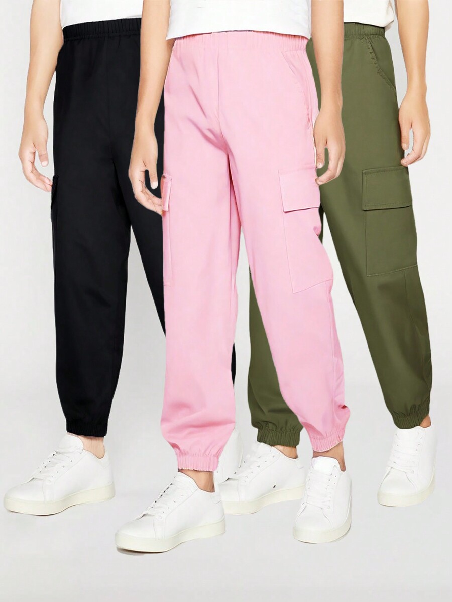 SHEIN Young Girl Solid Color Elastic Waist Cargo Pocket Drawstring Loose Casual Long Pants