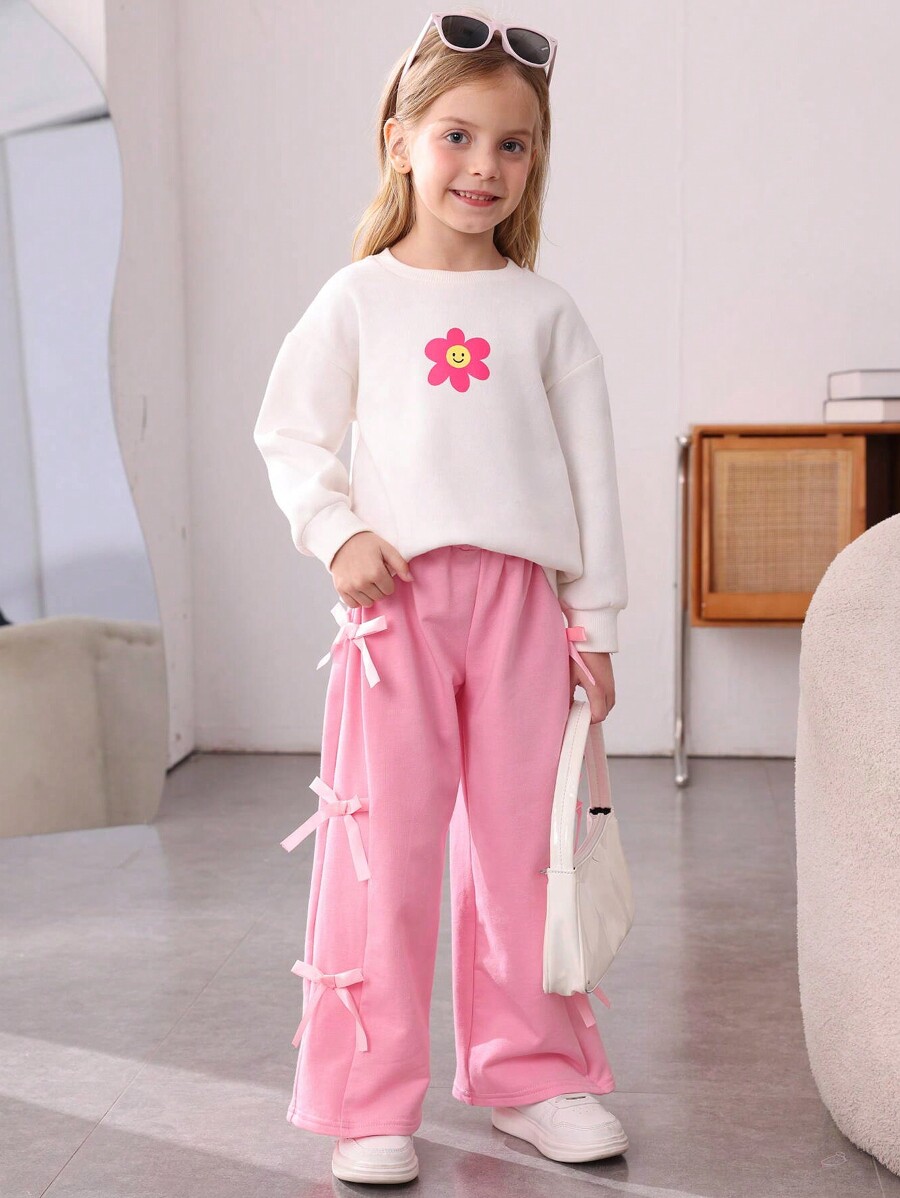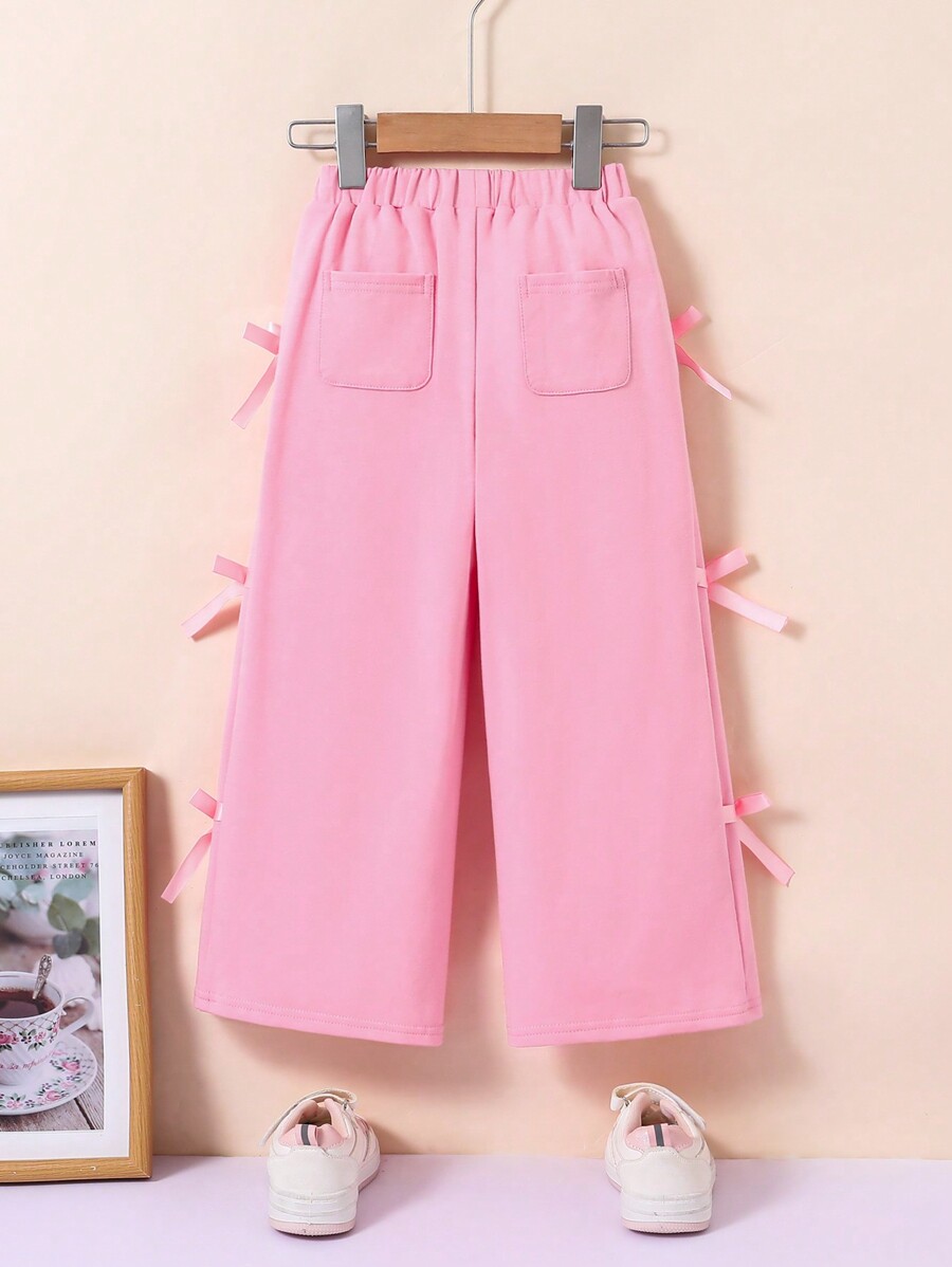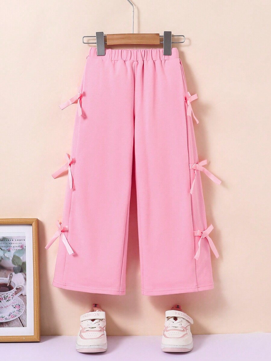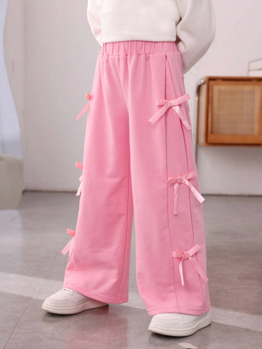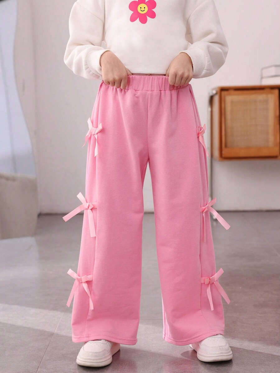 SHEIN Young Girl Sweet And Lovely Pink Bow Detail Knot Tie Waist Sweatpants For Spring And Summer & Fall & Winter,Fashionable,Casual Wide Leg Baggy Pants,Comfortable Simple Loose Fit Wide-Leg Pants,Great For Casual & Daily Wear & School Daily Autumn & Winter, Family Matching,Mommy And Me Matching.