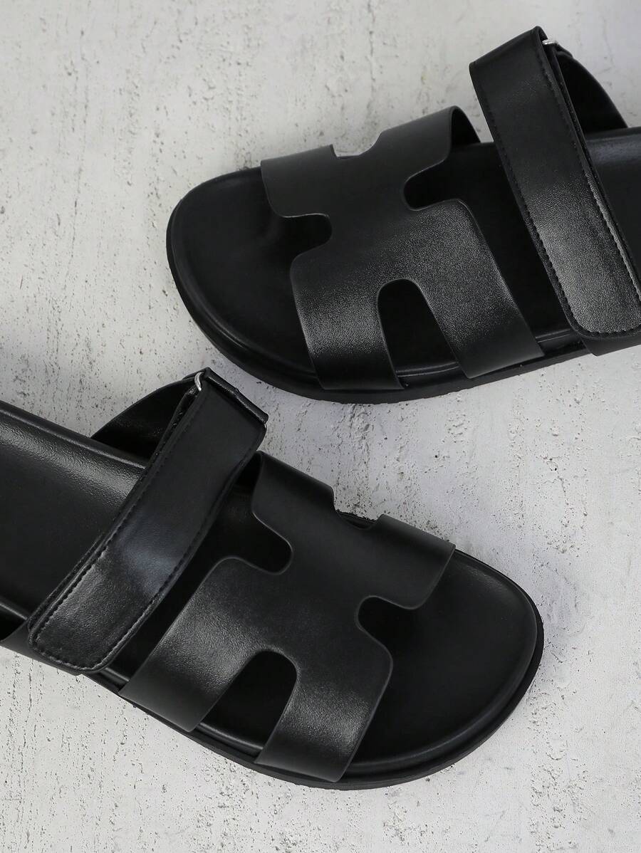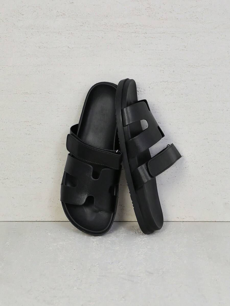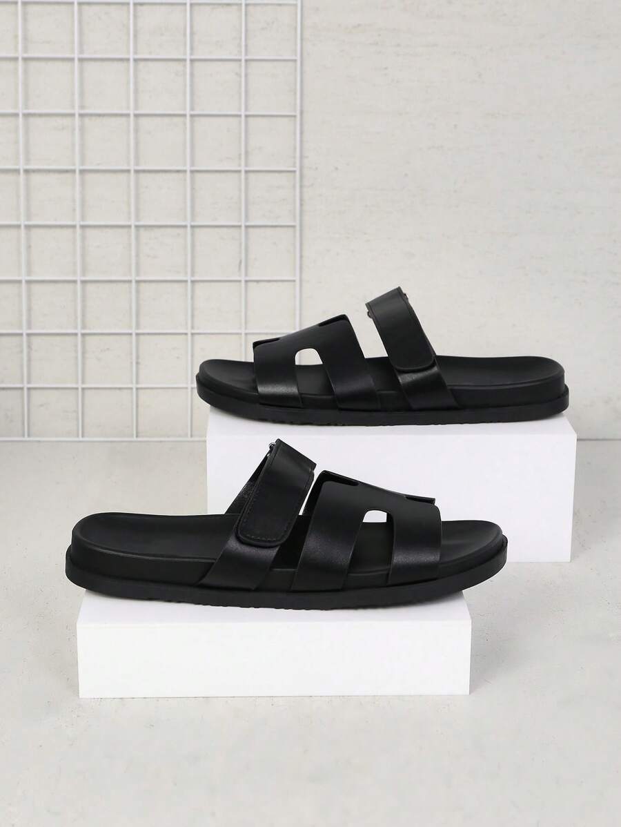 SHUZIA Top Seller Men’s Luxe-Inspired Cutout Hook And Loop Strap Open Toe Soft Footbed PU Black Slide Sandals