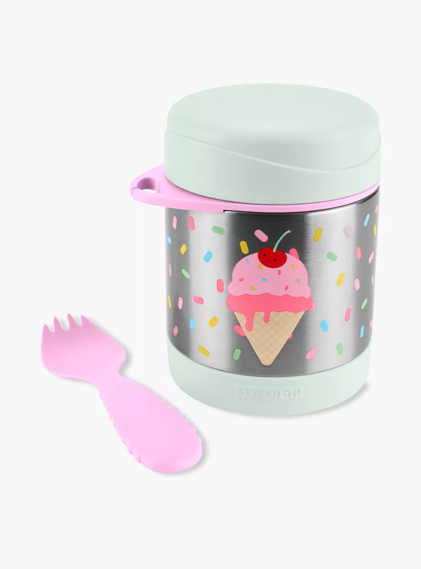 The Skip Hop Ice Cream Print Food Jar with Fork is the perfect mealtime companion for kids on the go. Designed with a fun and colorful ice cream print, this insulated stainless steel food jar keeps food hot for up to 7 hours or cold for up to 5 hours. Compact, lightweight, and durable, it includes a handy spork (spoon + fork) that snaps onto the side for easy use anywhere. Whether it’s soup, pasta, yogurt, or snacks, this food jar makes school lunches, picnics, and travel meals convenient and enjoyable. Parents love it for its leak-resistant lid and easy-to-clean design, while kids adore the playful design that makes lunchtime more fun.