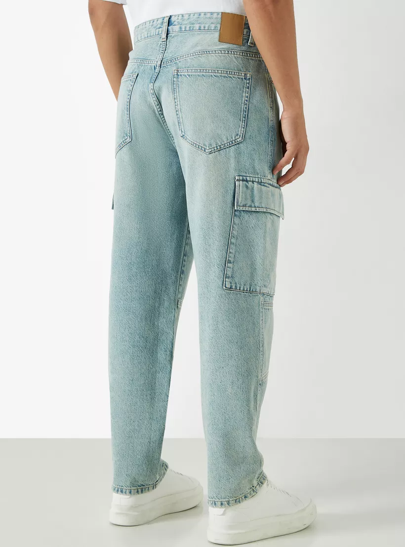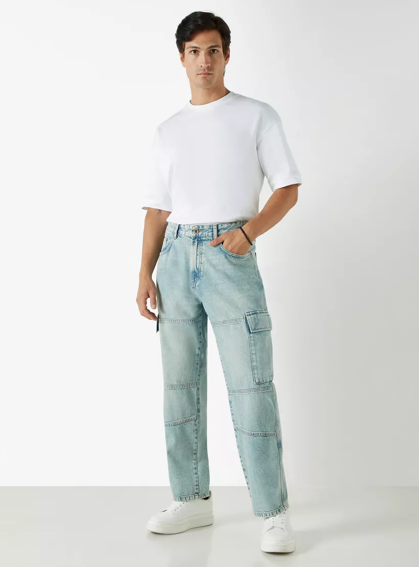 Solid Relaxed Fit Cargo Jeans with Pockets