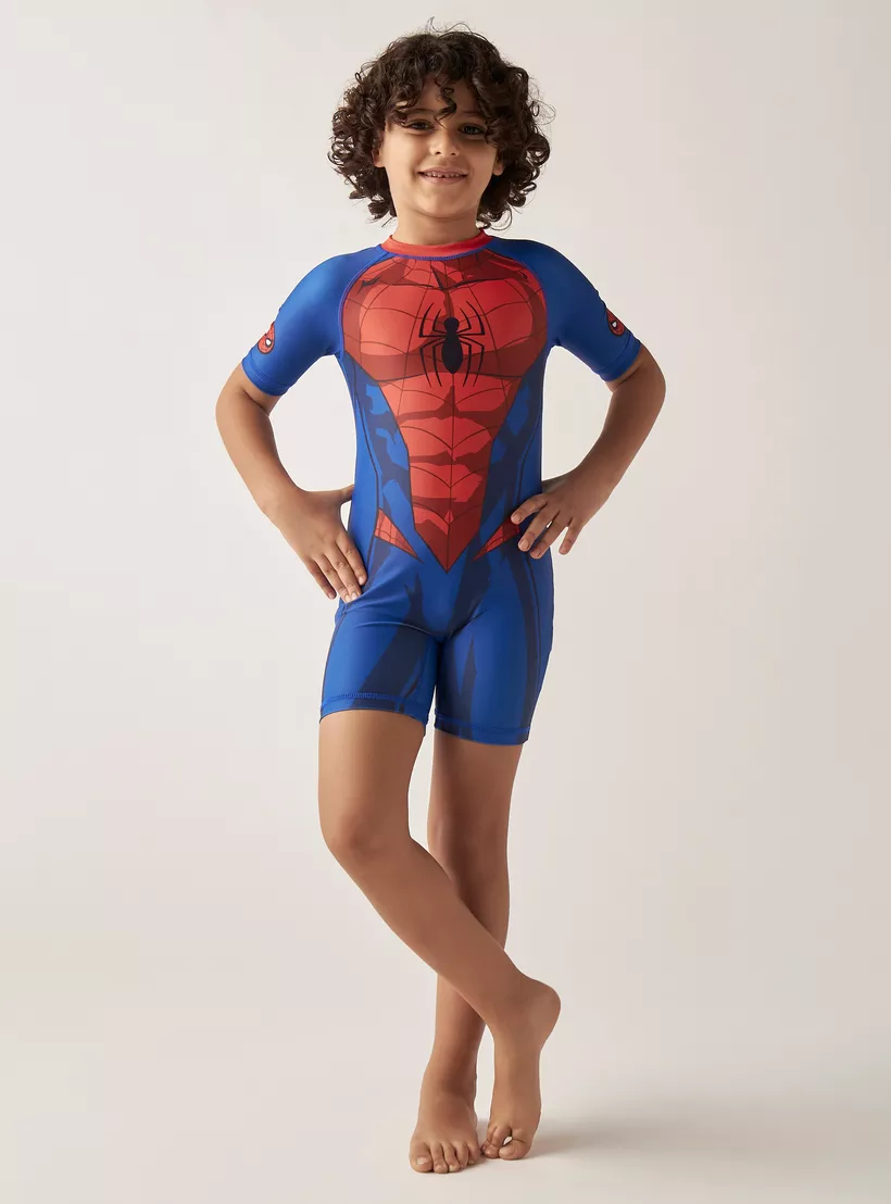Spider-Man Print Romper Swimsuit with Short Sleeves and Zip Closure