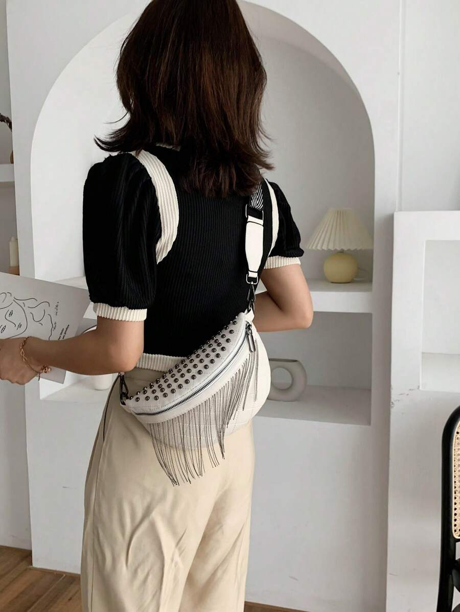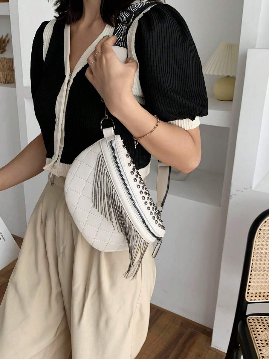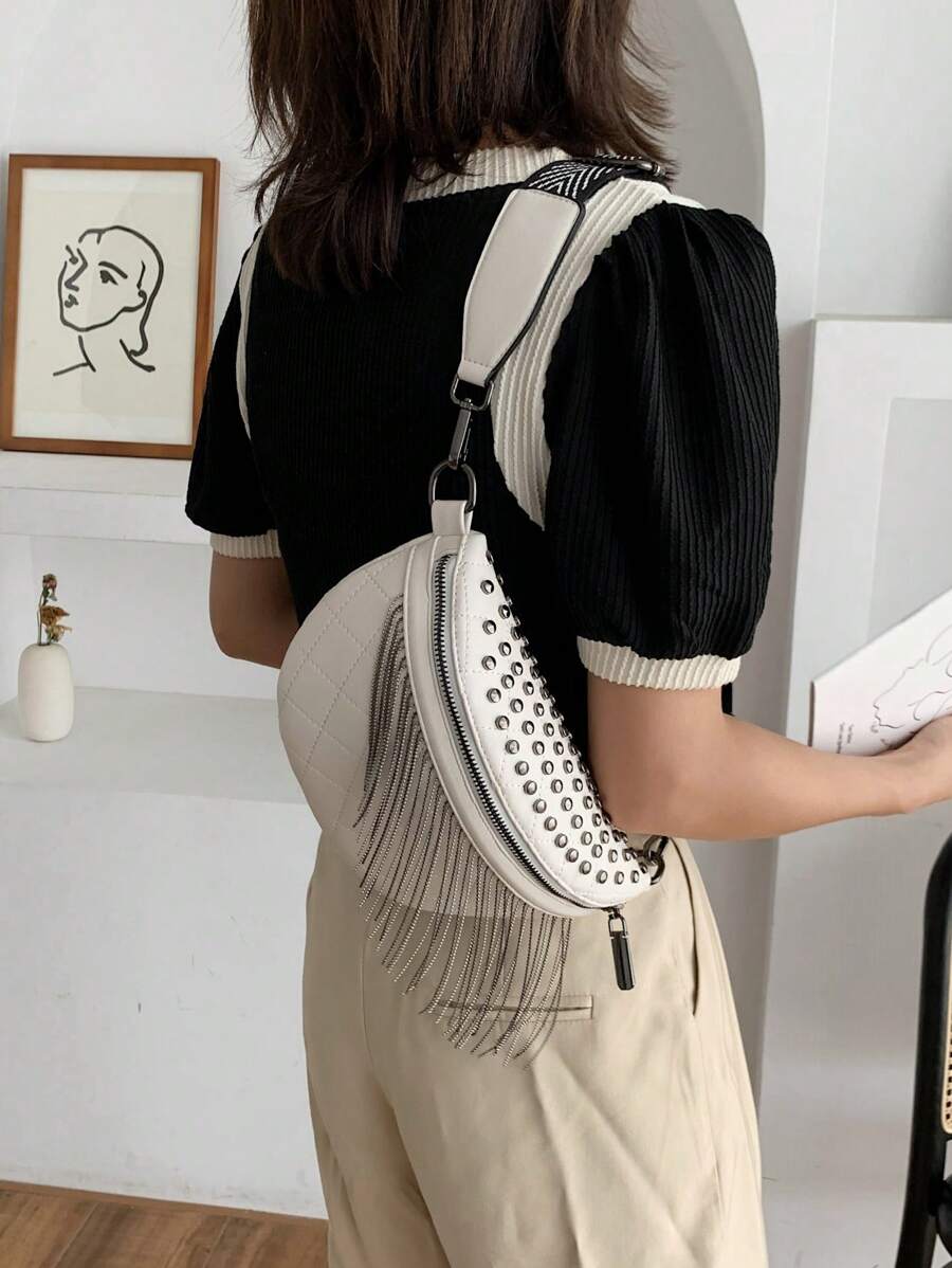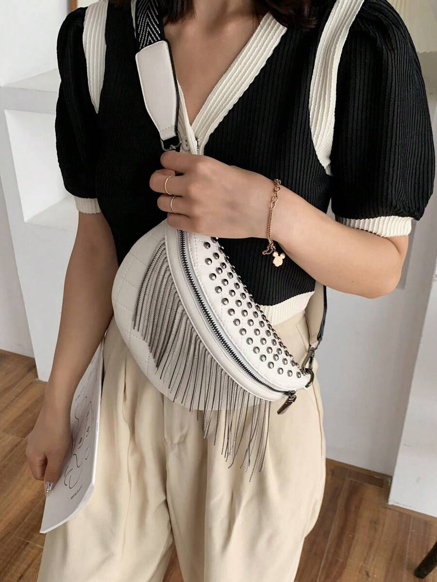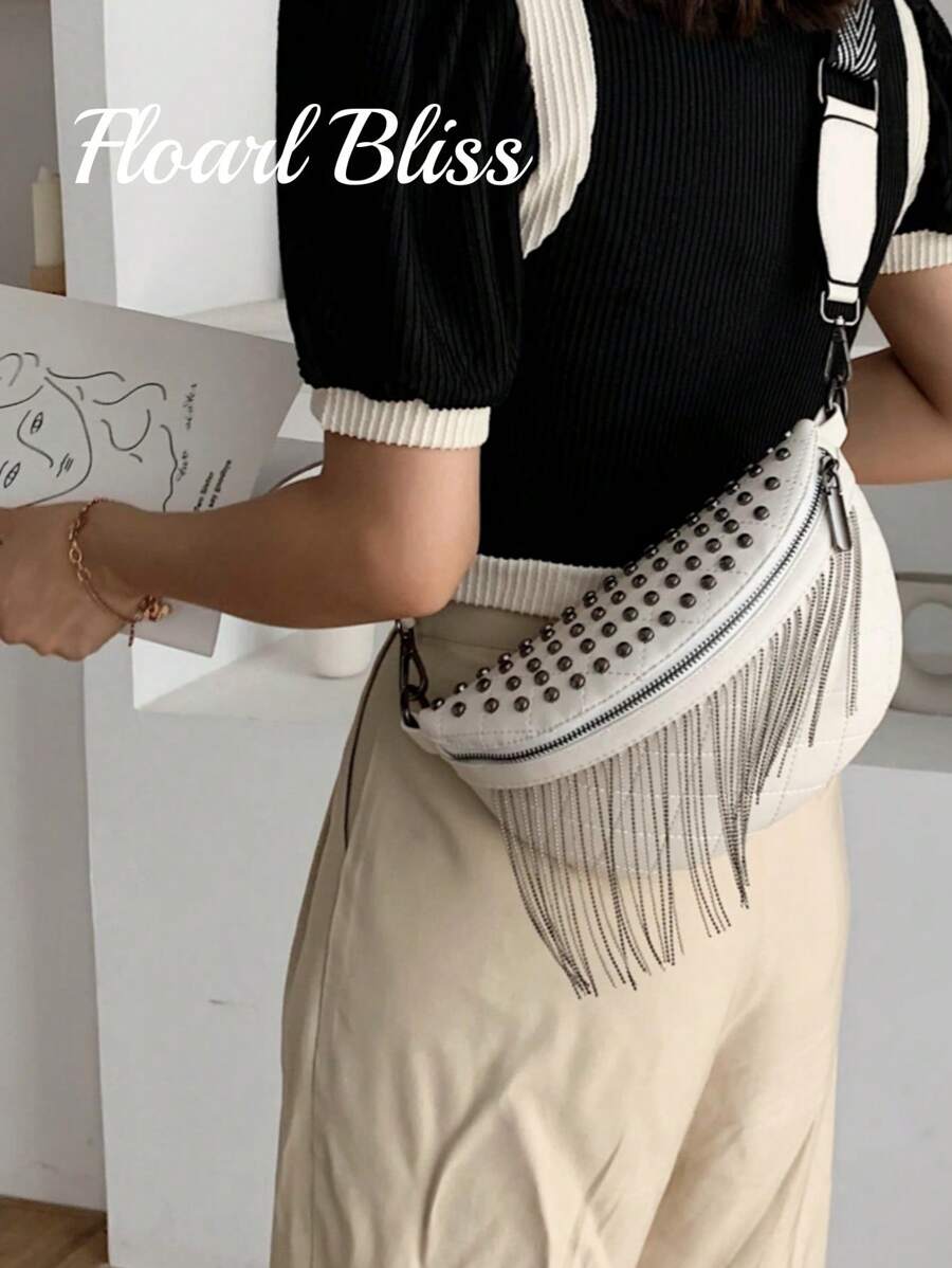 Elevate your accessory game with the Studded Fringe Decorated Crossbody Bag, a perfect blend of edgy style and practical design. This stunning bag features a dynamic combination of studded detailing and cascading fringe accents, bringing a bold, free-spirited touch to any outfit. Whether you’re heading to a concert, a night out, or a casual day in the city, this bag makes a statement while keeping your essentials secure and easily accessible. This Studded Fringe Crossbody Bag is your go-to accessory for adding a touch of boldness and fun to any outfit, combining fashion and functionality effortlessly.