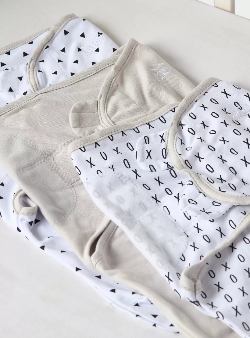 The three-piece sleeping bag helps your baby sleep more soundly. With soft fabric wings and secure hook and loop attachments, these swaddles provide the perfect adjustability and fit for your little one. These swaddles are made from a soft cotton blend, making them gentle against your baby’s skin.