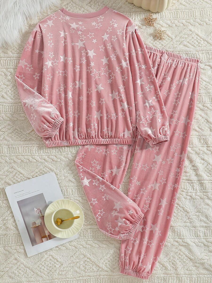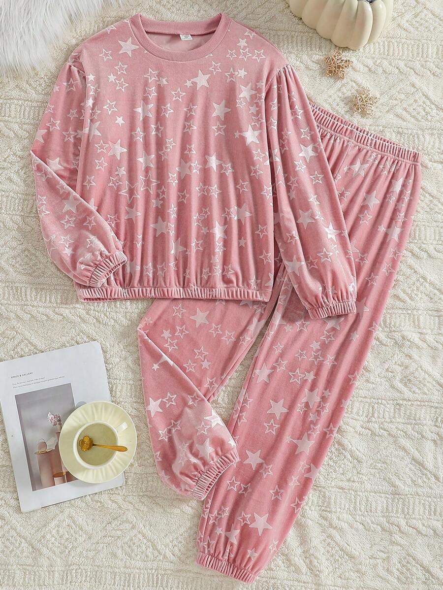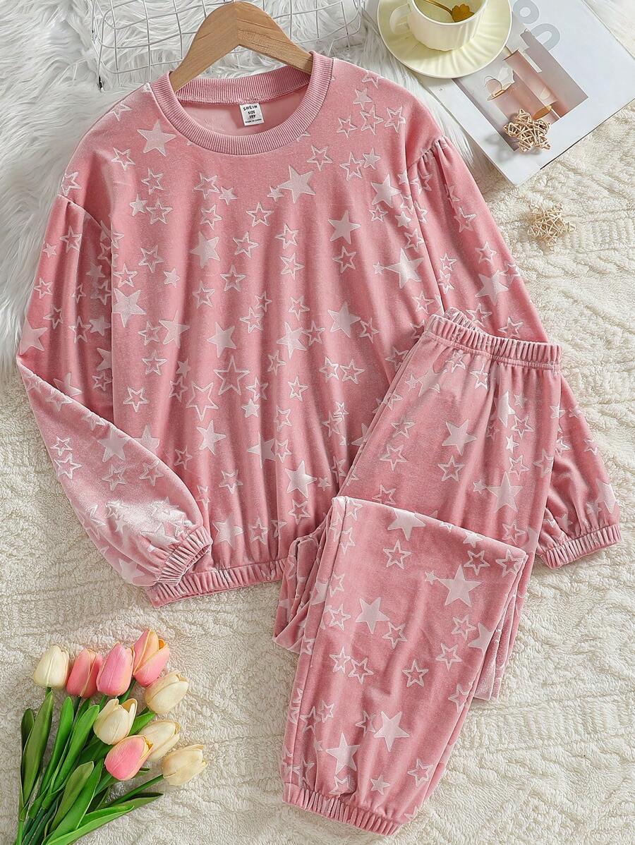 Home / SHEIN / Girls / Pyjamas / Teenage Girls Velvet Star Allover Print Fray Sleeve Casual Comfortable Long Sleeve Top And Pants Loungewear 2-Piece Set, Elegant Design, Autumn/Winter New