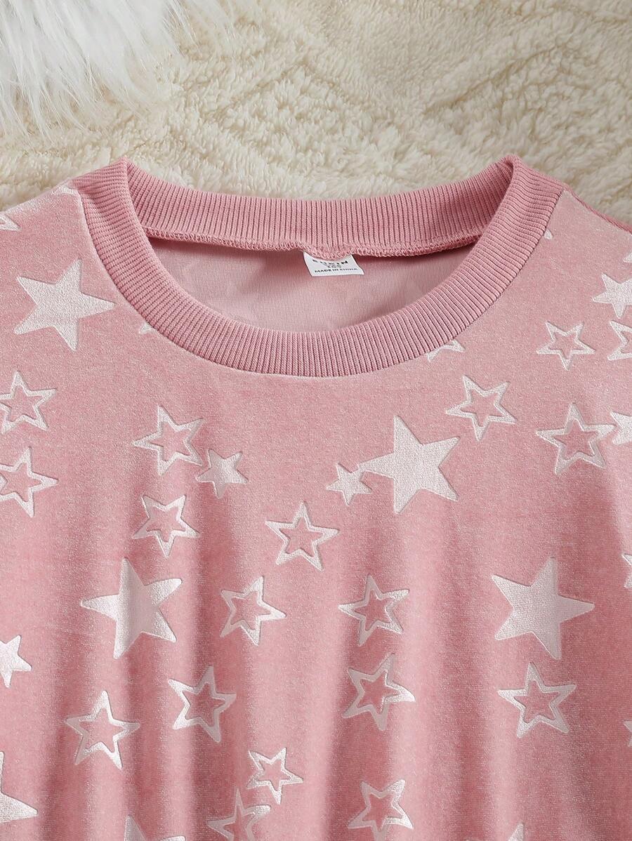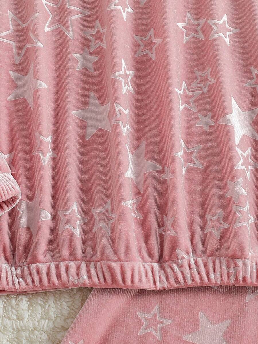 Teenage Girls Velvet Star Allover Print Fray Sleeve Casual Comfortable Long Sleeve Top And Pants Loungewear 2-Piece Set, Elegant Design, Autumn/Winter New
