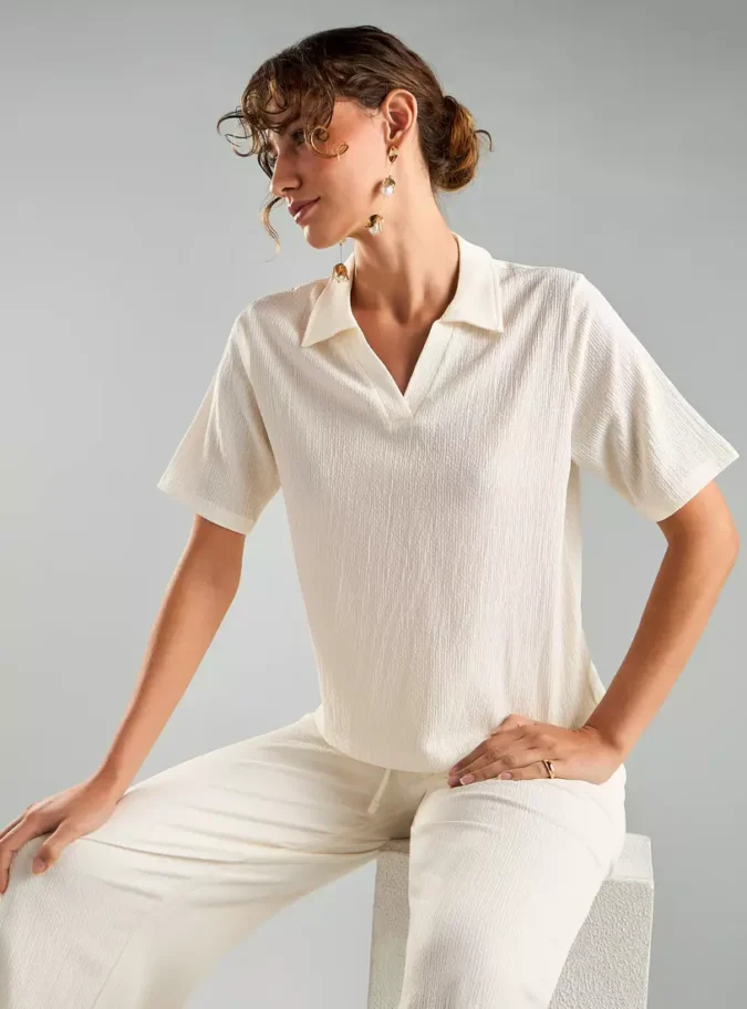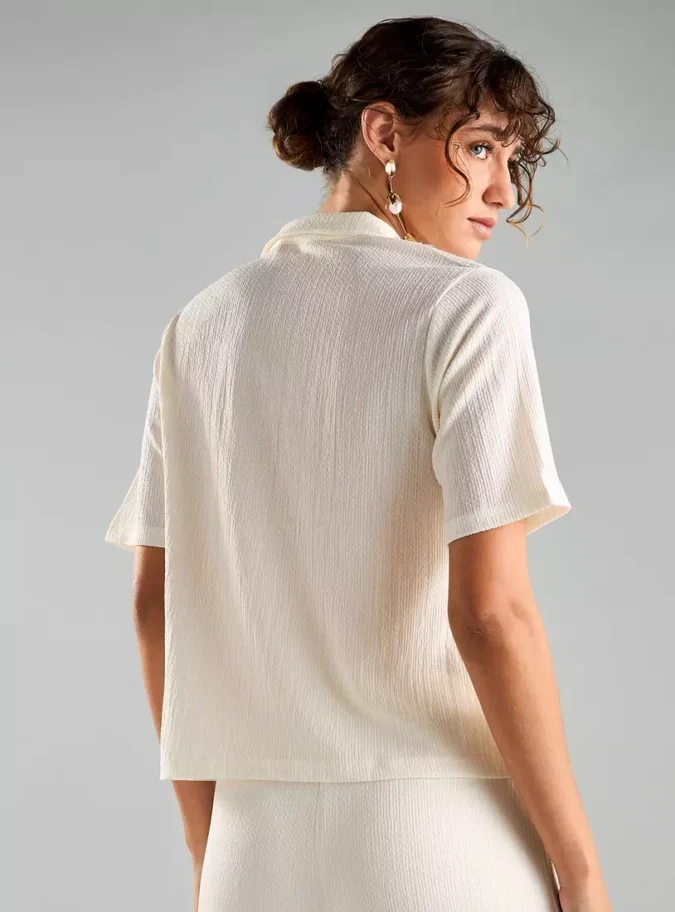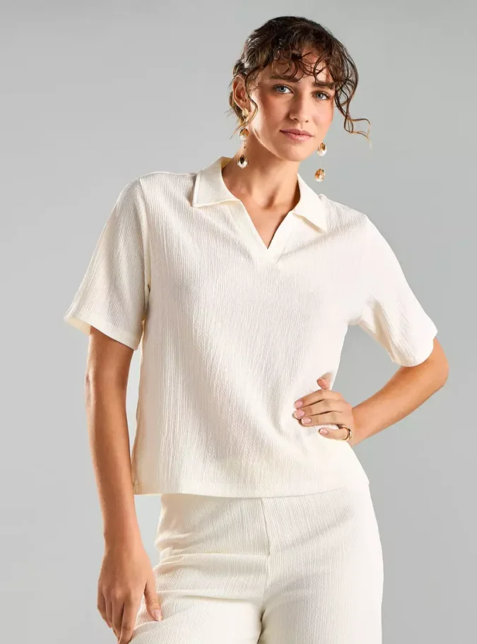 • It serves the same purpose as a basic t-shirt or simple blouse in an outfit but adds significant visual interest and depth, making an outfit look more considered and stylish with minimal effort.